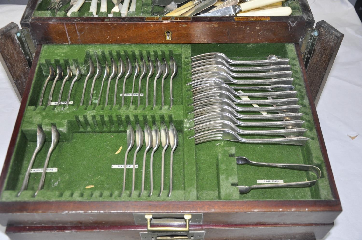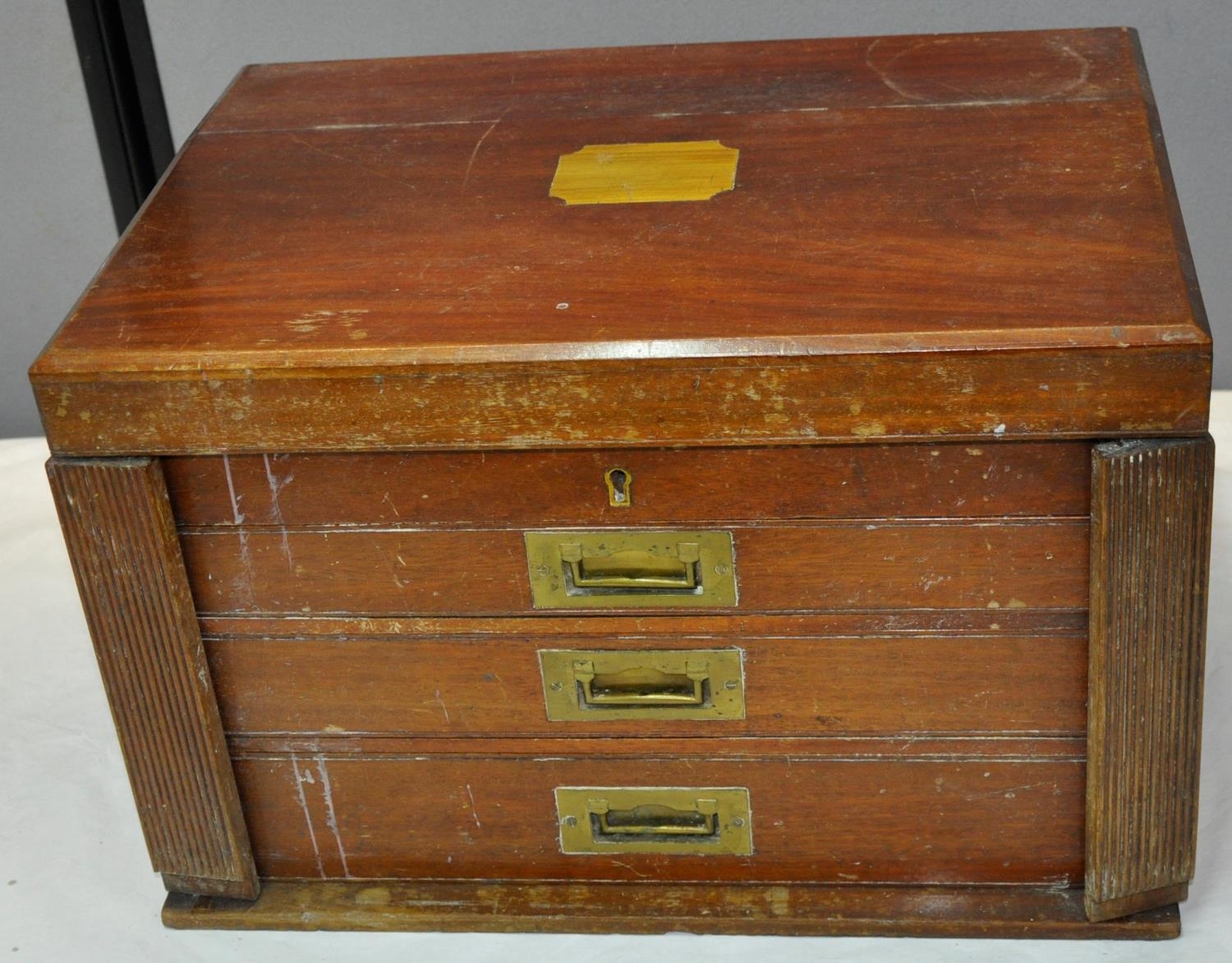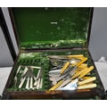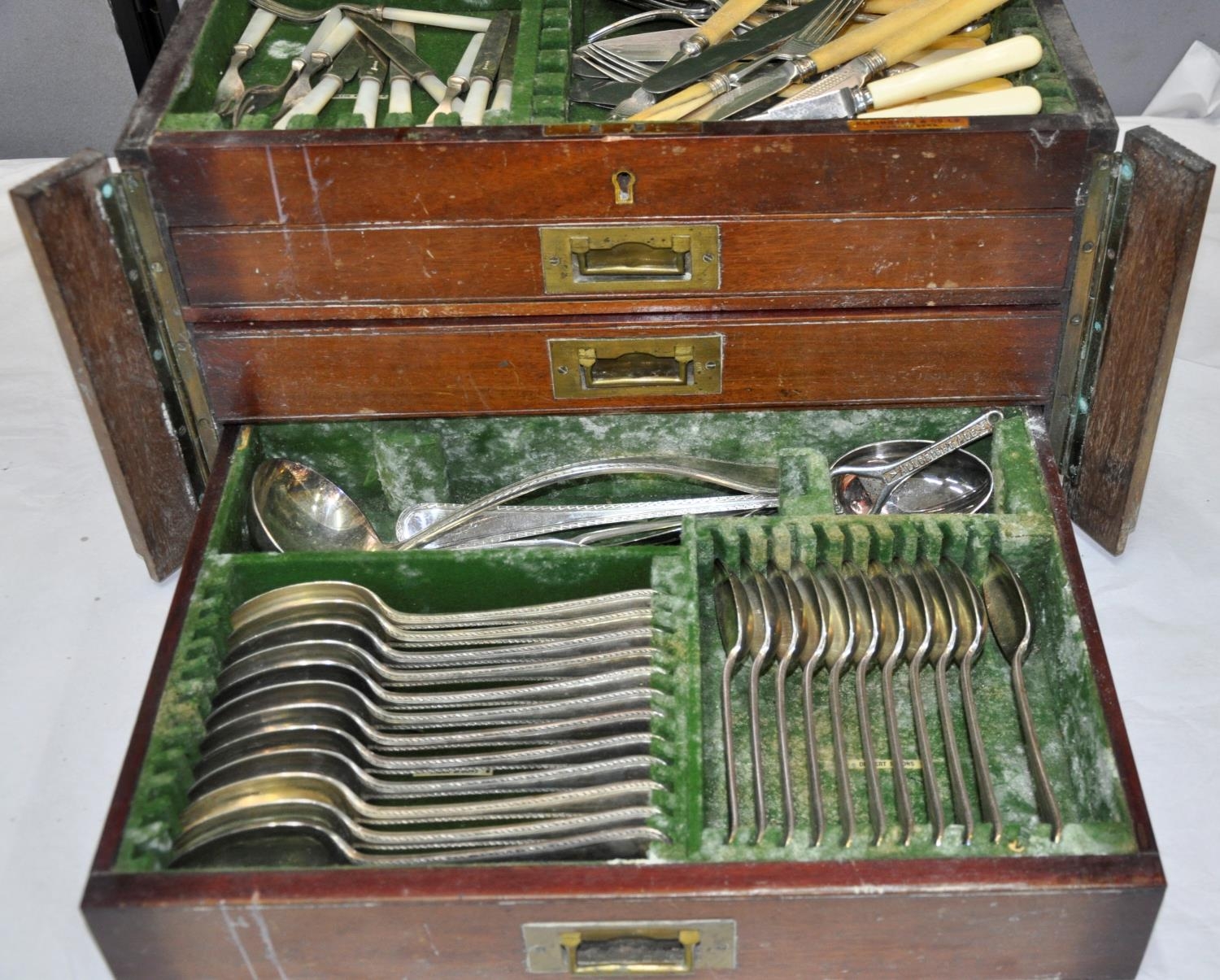 CUTLERY CANTEEN WITH 3 DRAWERS AND BRASS HANDLES - COINTAINING MISCELLANEOUS CUTLERY
