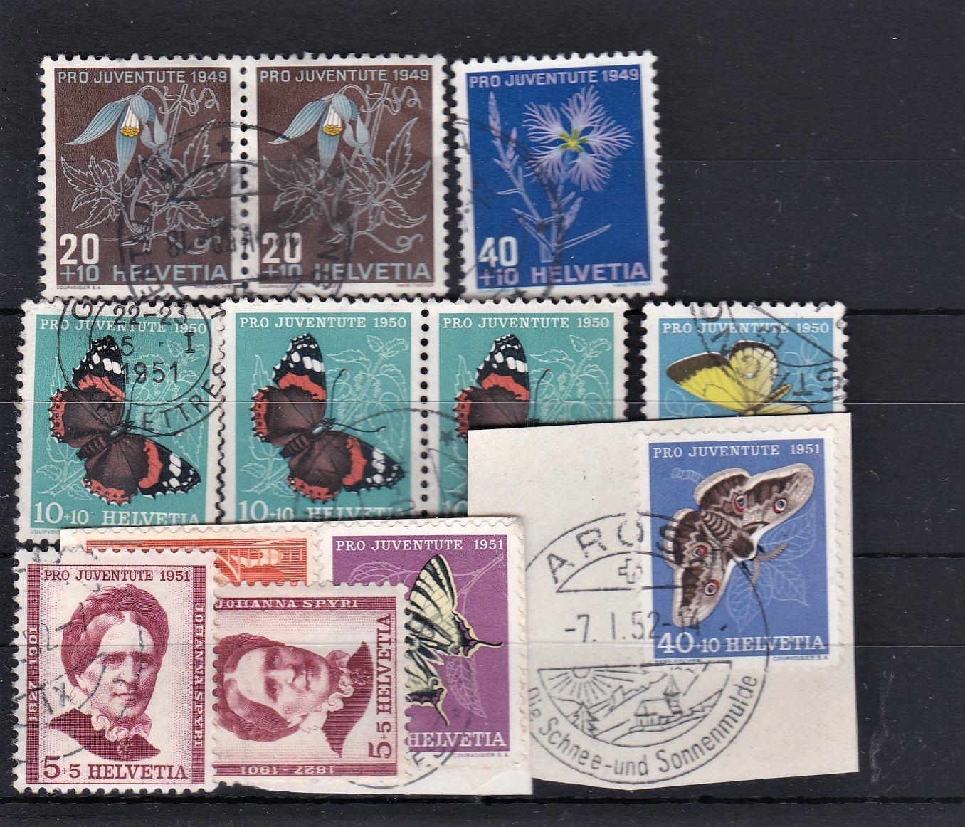 Switzerland 1949 Children's Fund SG J130 pair, J131 fine used, 1950 Children's Fund SG J133 Fine used, J133 Fine used pair, J136 Fine used and 1951 Children's Fund SG J137, J139 and J141 Fine used. Cat £50