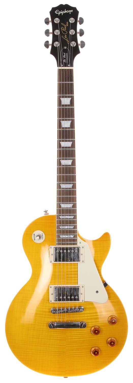 2010 Epiphone Les Paul Standard electric guitar, made in China; Body: lemon finished figured maple top upon brown mahogany back; Neck: mahogany; Fretboard: rosewood; Frets: good; Electrics: working; Hardware: good; Case: original hard case; Weight: 3.84kg; Overall condition: very good