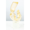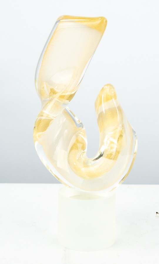 MODERN SIGNED MURANO, ITALIAN GOLD DUSTED GLASS SCULPTURE, hot worked into a U shaped twisted form, and set on a clear and frosted, cylindrical base, 9 ¼” (23.5cm) high, indistinctly signed