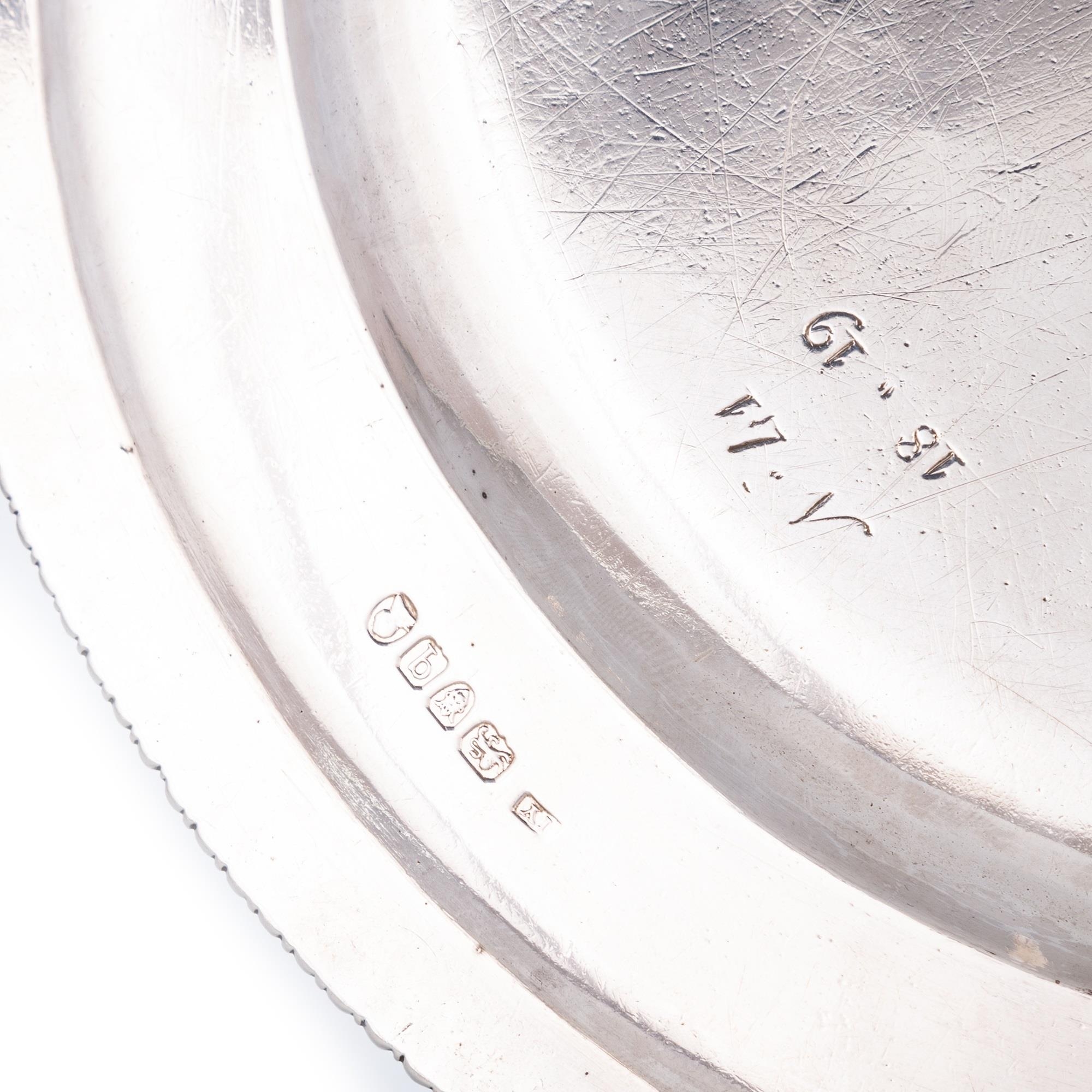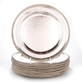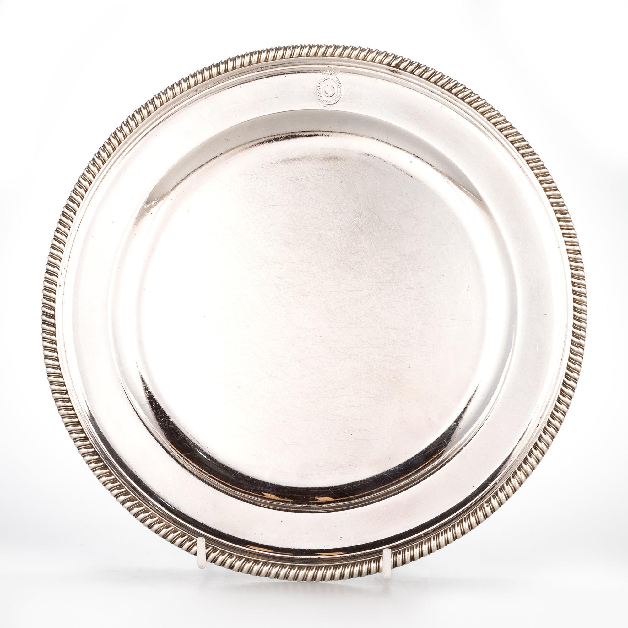 by James Young, London 1791, circular with gadrooned rims, each engraved with a crest and motto, numbered on the underside and with scratch marks. (12) 25cm diameter, 126.9 troy ounces