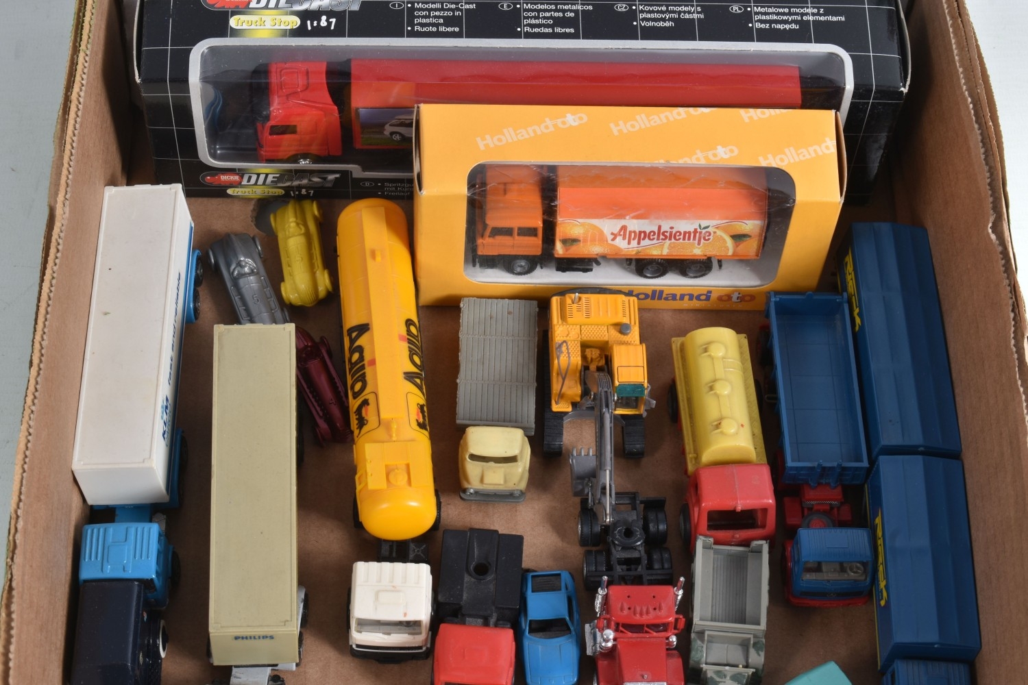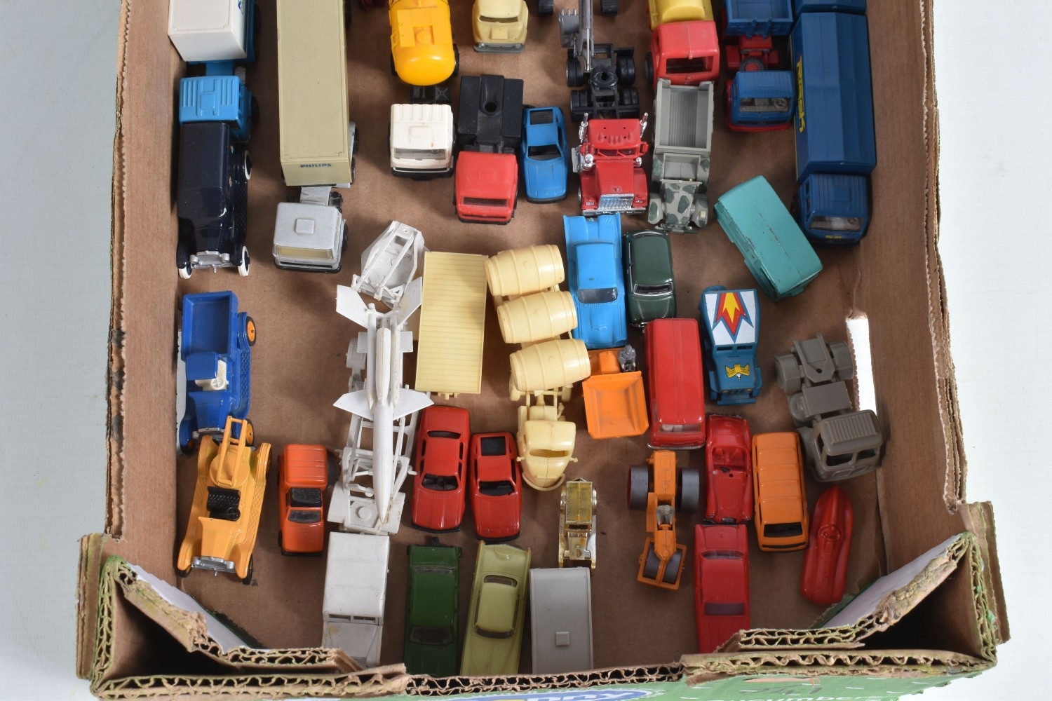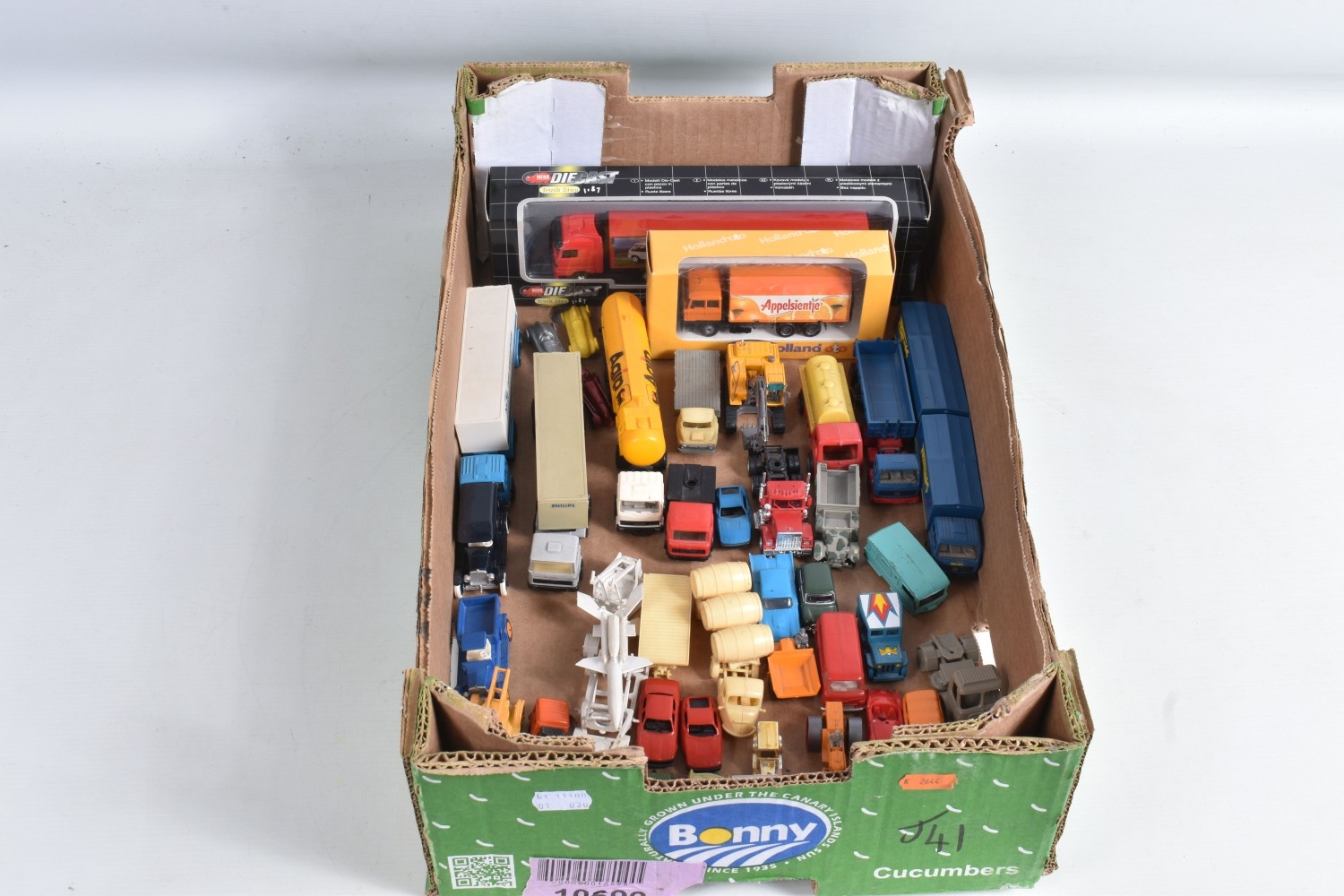 A QUANTITY OF MAINLY UNBOXED AND ASSORTED DIECAST & PLASTIC VEHICLES, to include Wiking, Lima, Efsi, Herpa, Eko, Tri-ang, Minix, Airfix & Peco (or copies), Hongwell, boxed Holland Oto, boxed Dickie etc., majority in playworn condition but appear largely complete, but small quantity with damage, wear and missing parts