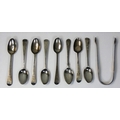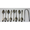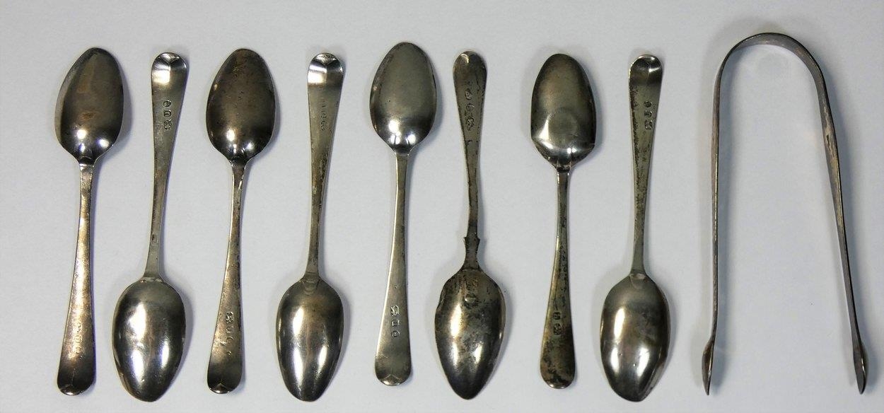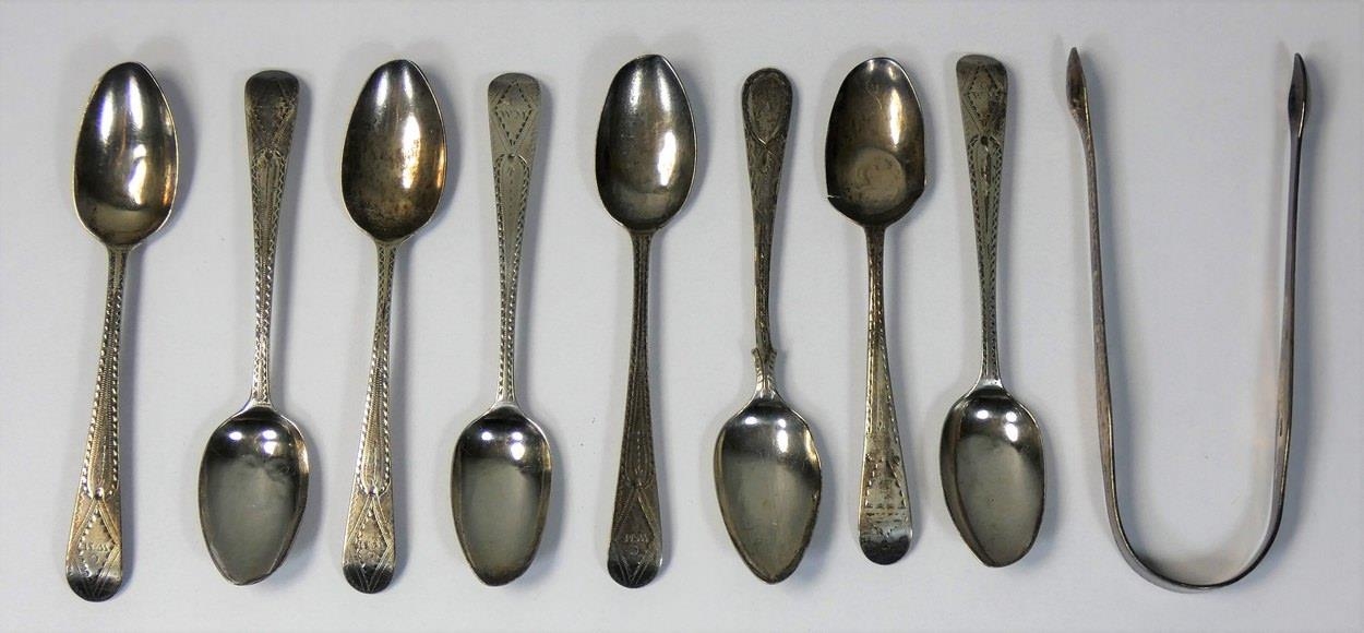 A George III silver bright cut pair of sugar tongs, by Hester Bateman, London c. 1780, a set of six bright cut tea spoons, no maker, London 1795, initialled C over W.M and two similar tea spoons, combined weight 4 oz.