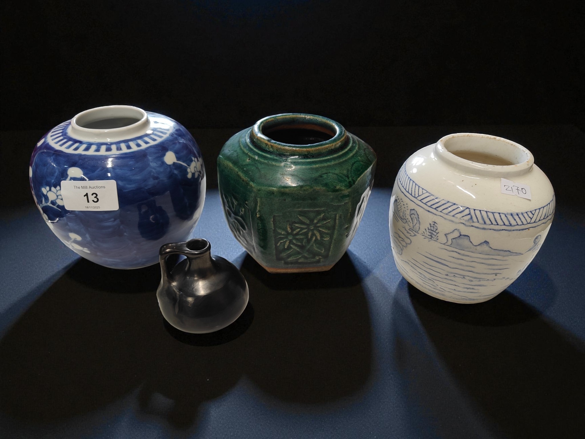 3 ORIENTAL POTS AND A SMALL POTTERY JUG
