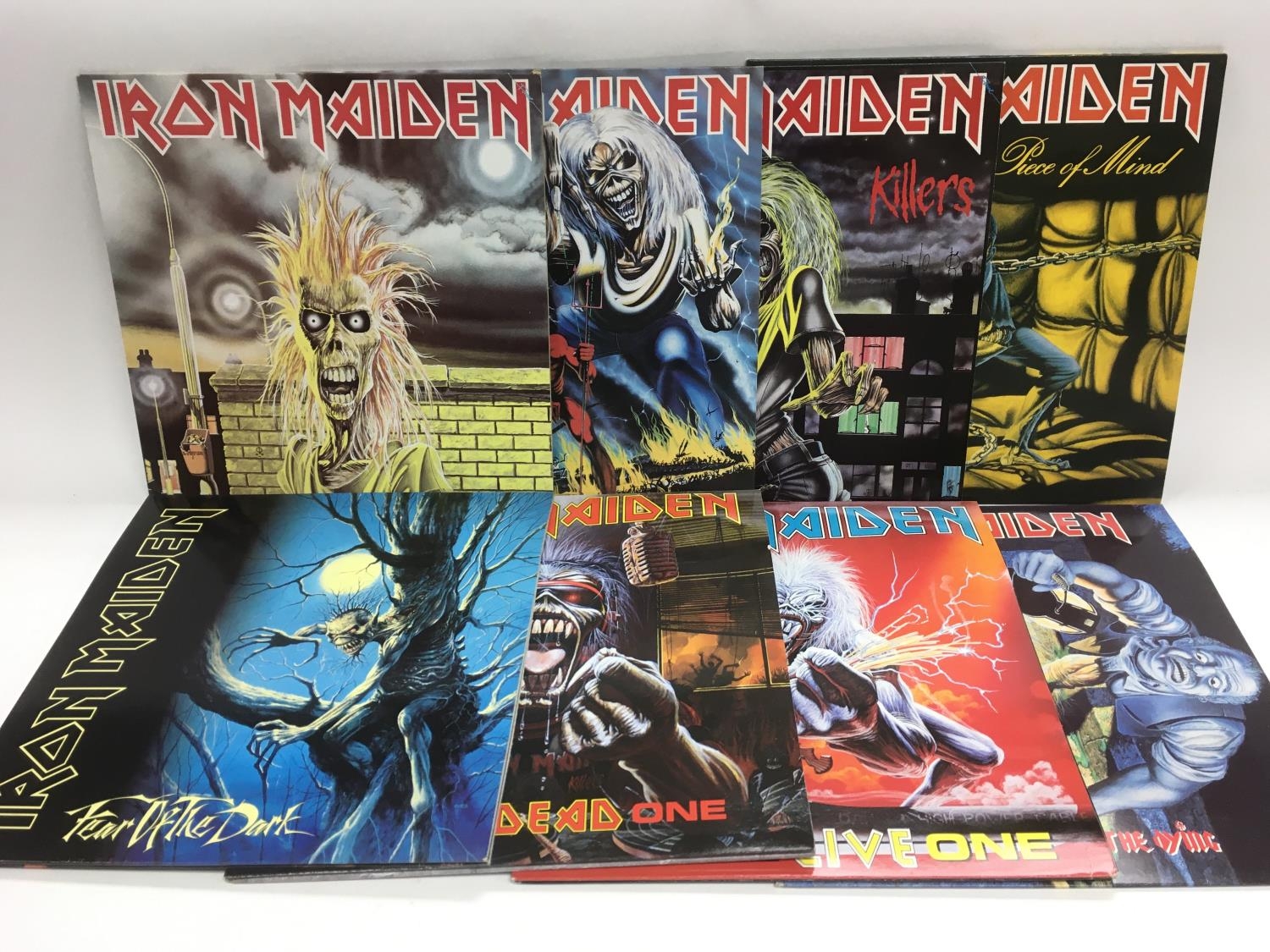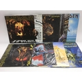 A collection in two bags of Iron Maiden LPs and singles including shaped picture discs.