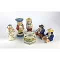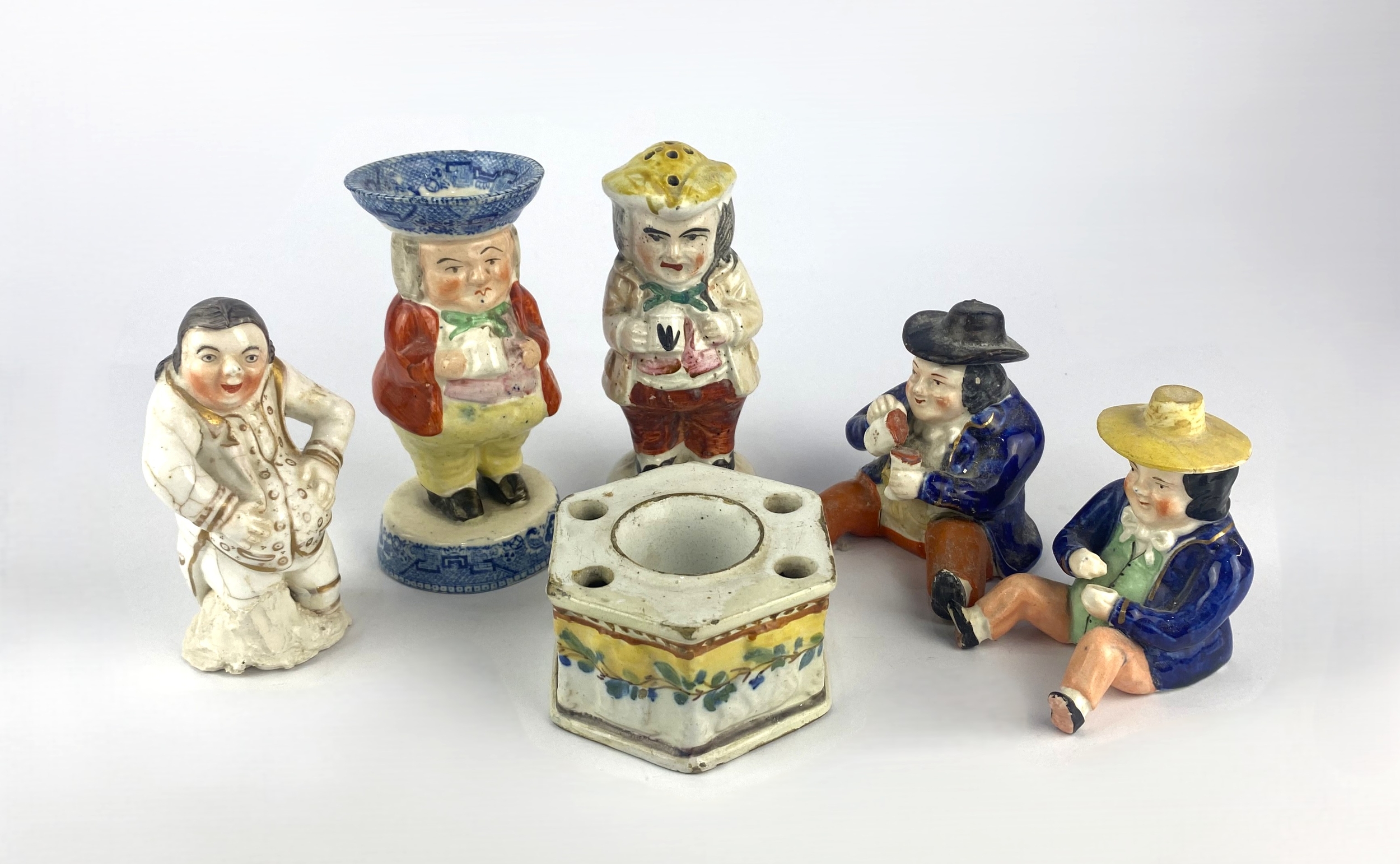An 18th century Delft inkwell 9cm diameter, a Staffordshire pottery figure of the 'laughing philosopher' 10cm high, a Staffordshire Toby Man salt cellar, and three other Staffordshire type figures (a/f)