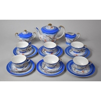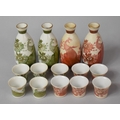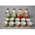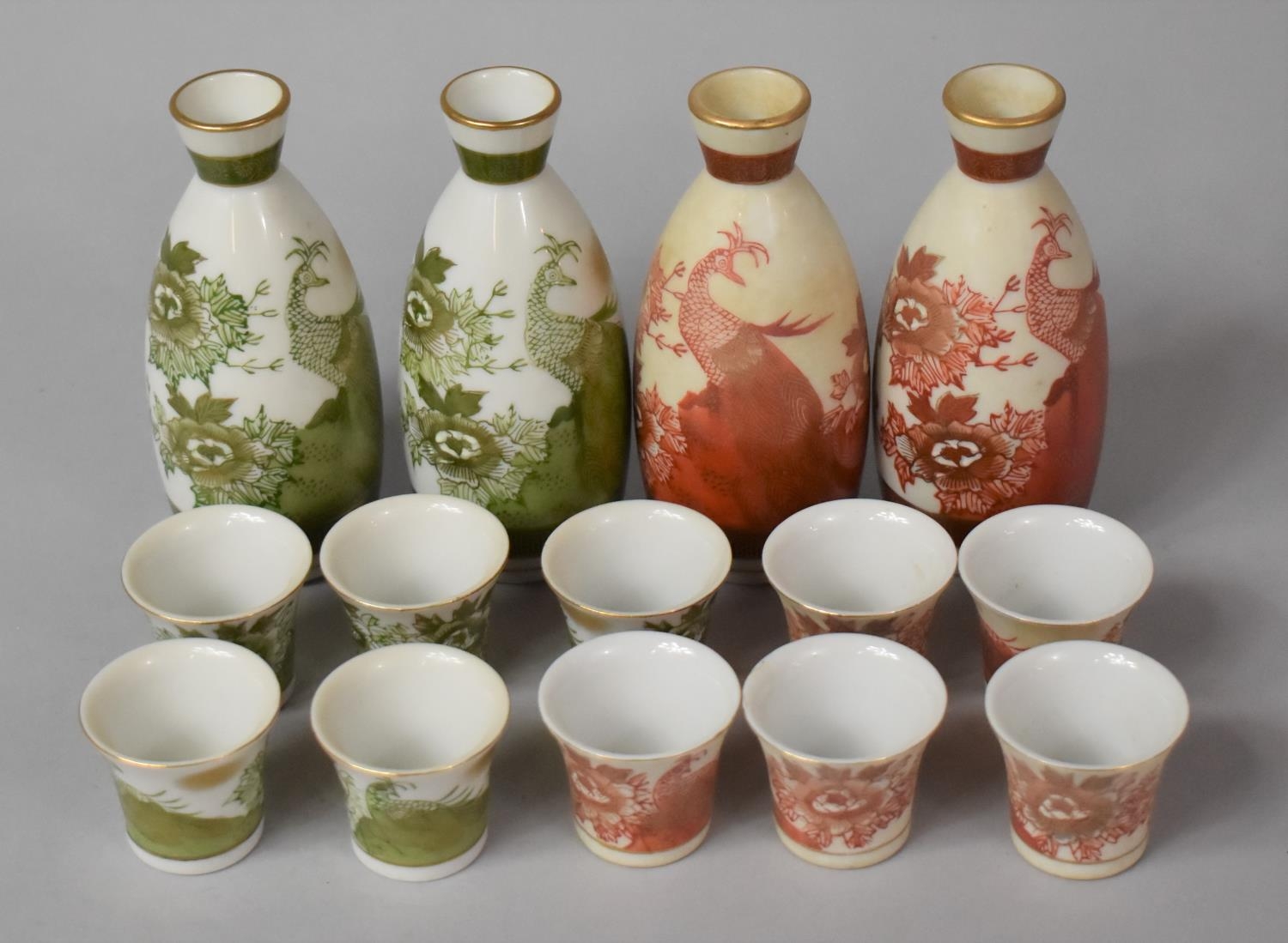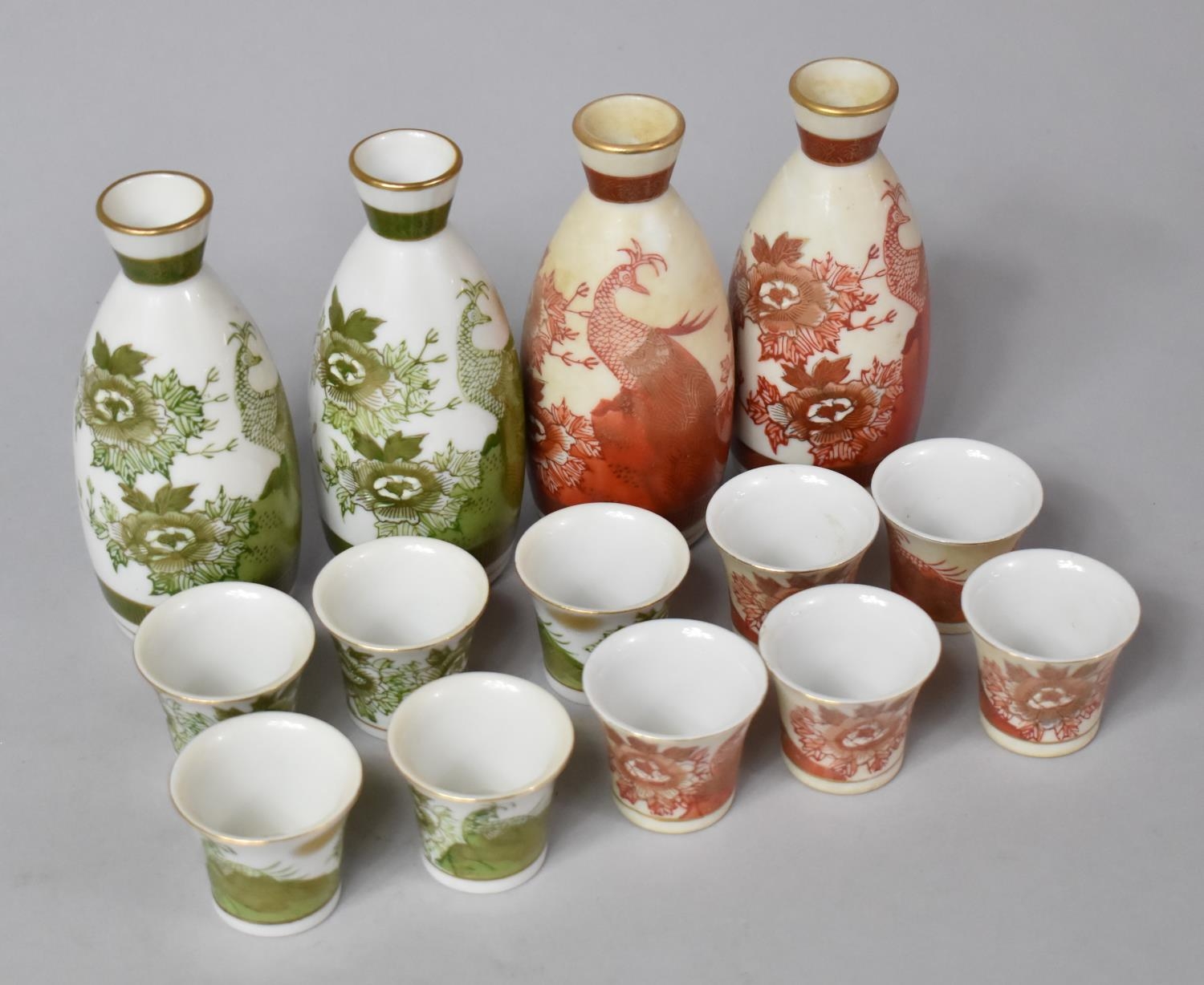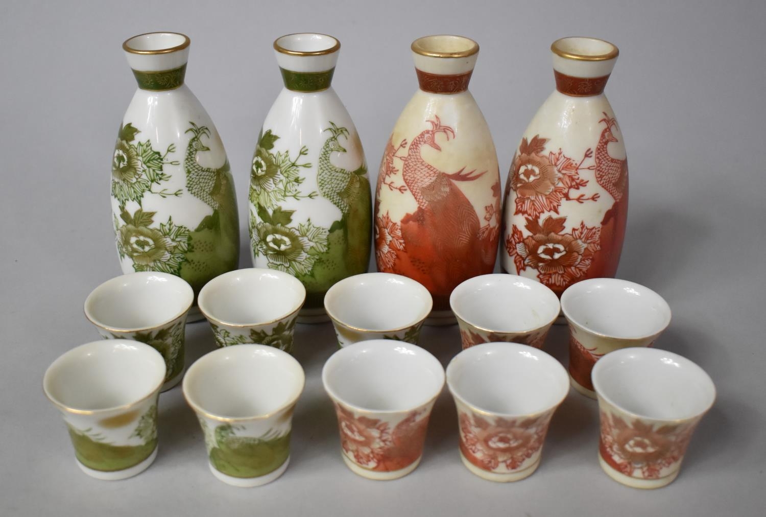 Two Oriental Porcelain Decanter and Tot Sets, Two Colour Ways, Both Sets with Bird Decoration in Orange and Green Colourways