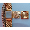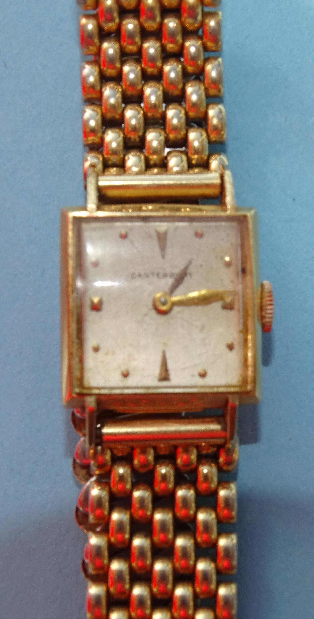 A lady's 14k-gold-cased square-faced wrist watch, 19mm, marked Canterbury, on plated bracelet, (working sporadically).