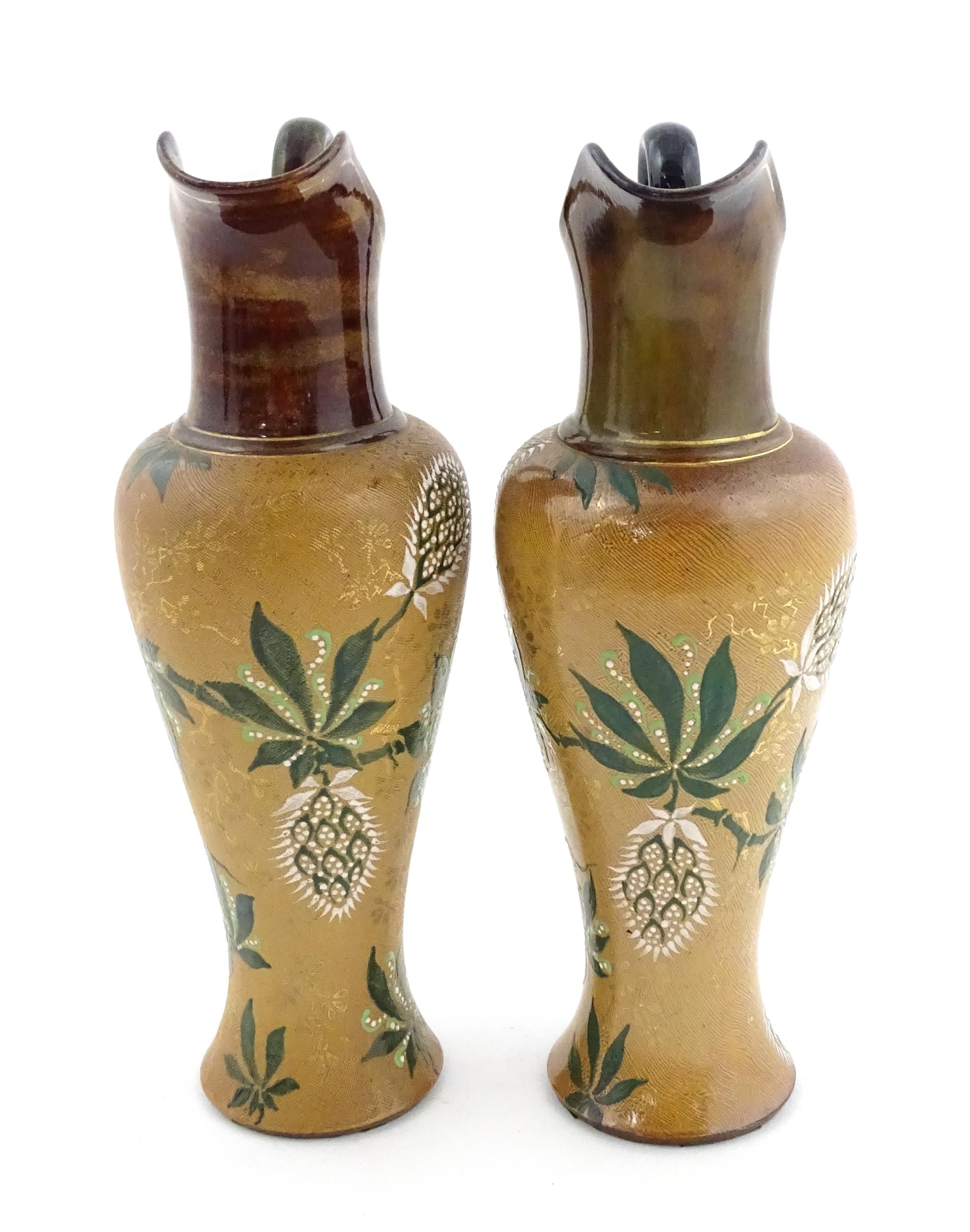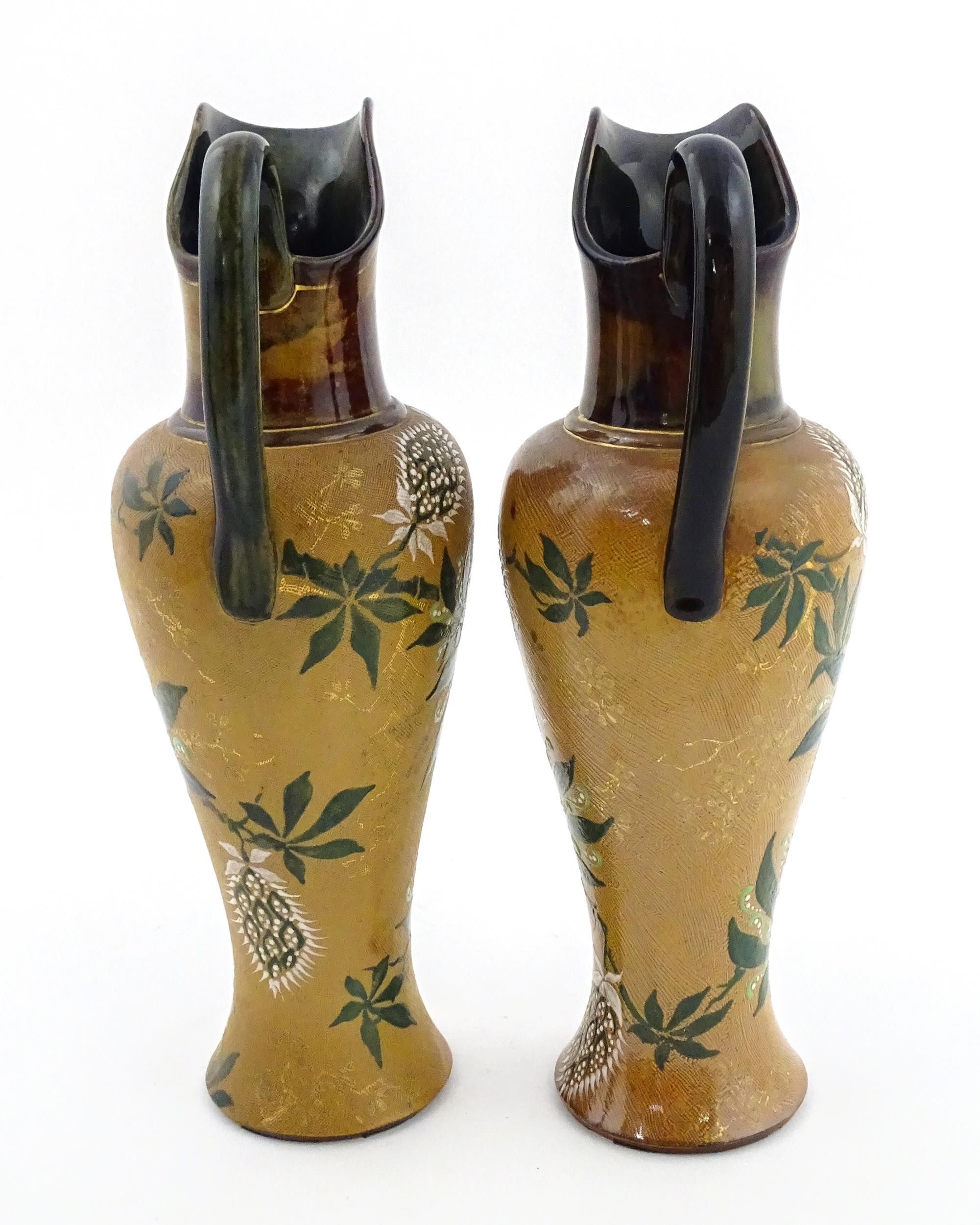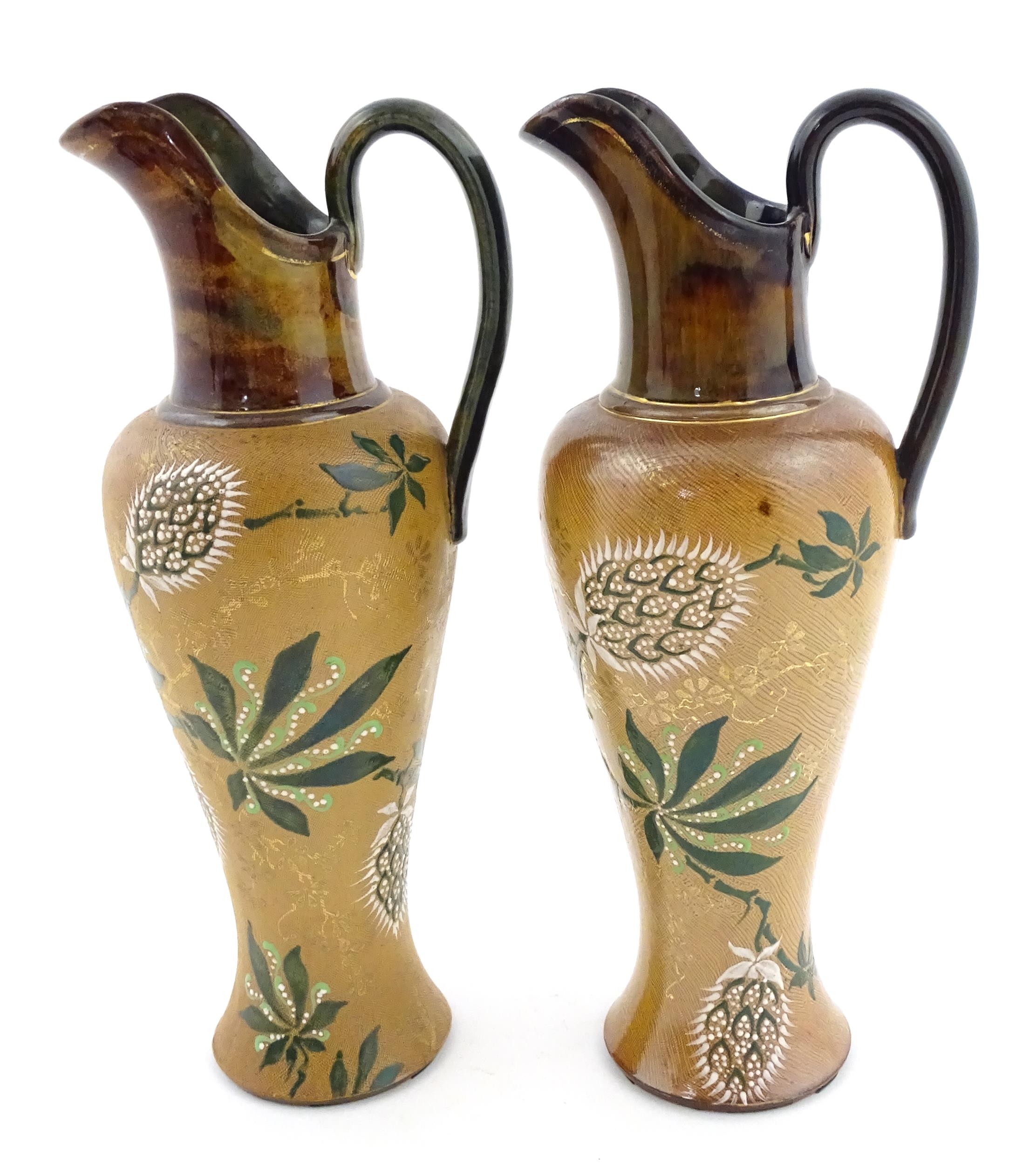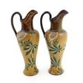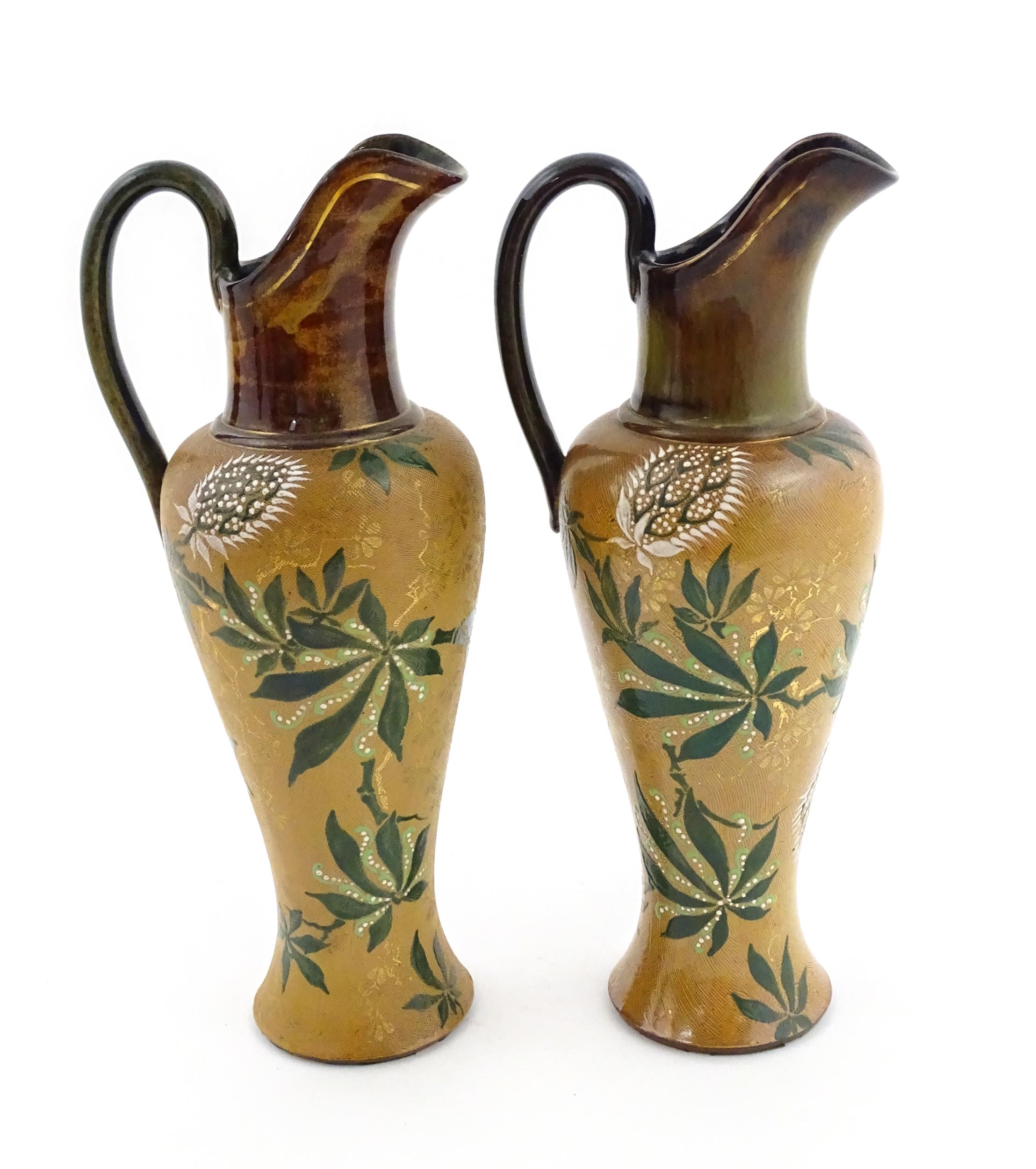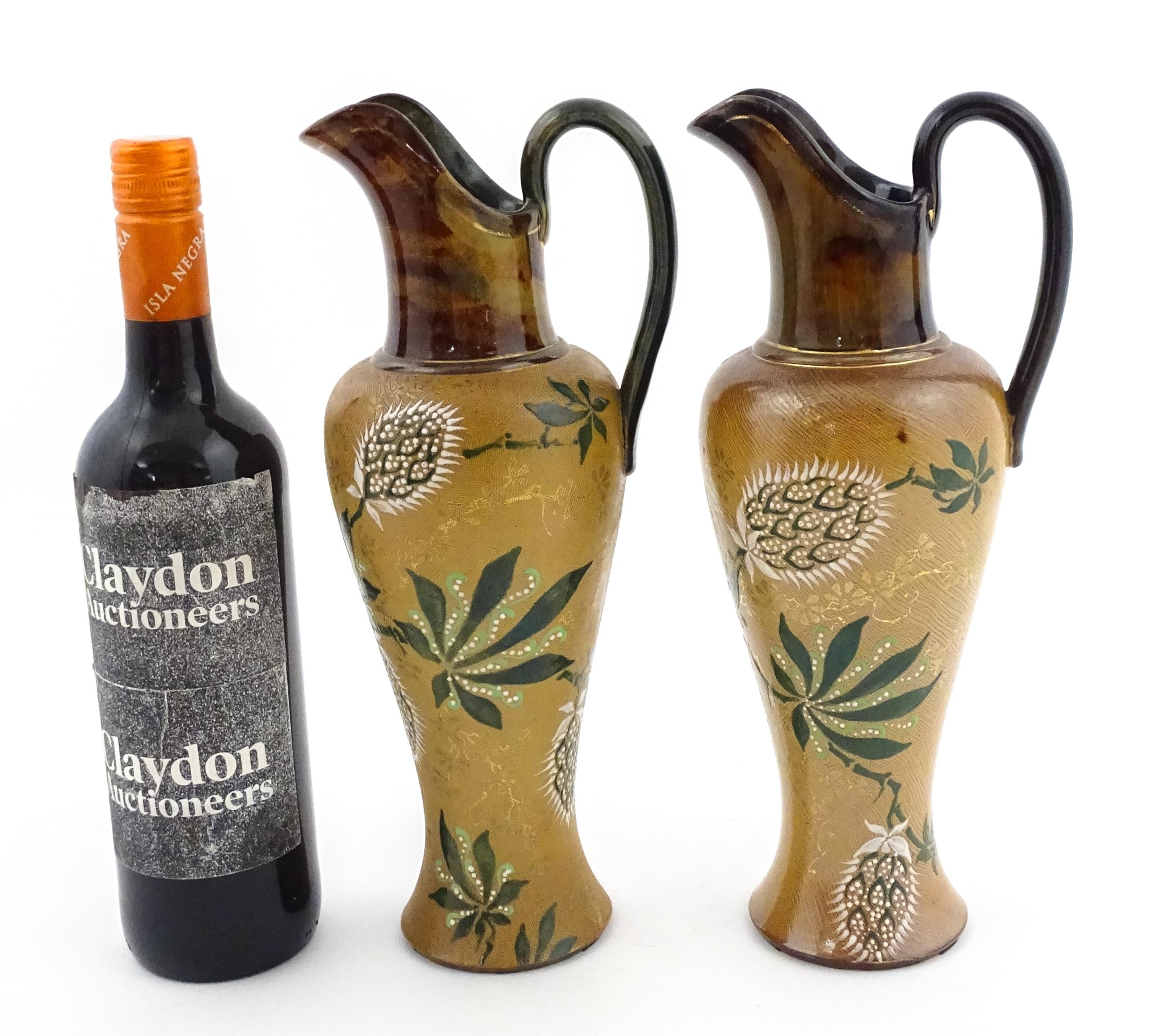 A pair of Doulton Lambeth ewers / pitchers with stylised floral and foliate decoration by Lizzie Marie Daintree. Marked under Doulton & Slaters Patent, numbered 5483 / X4951, with maker's mark. Approx. 12 1/4" high (2)