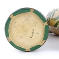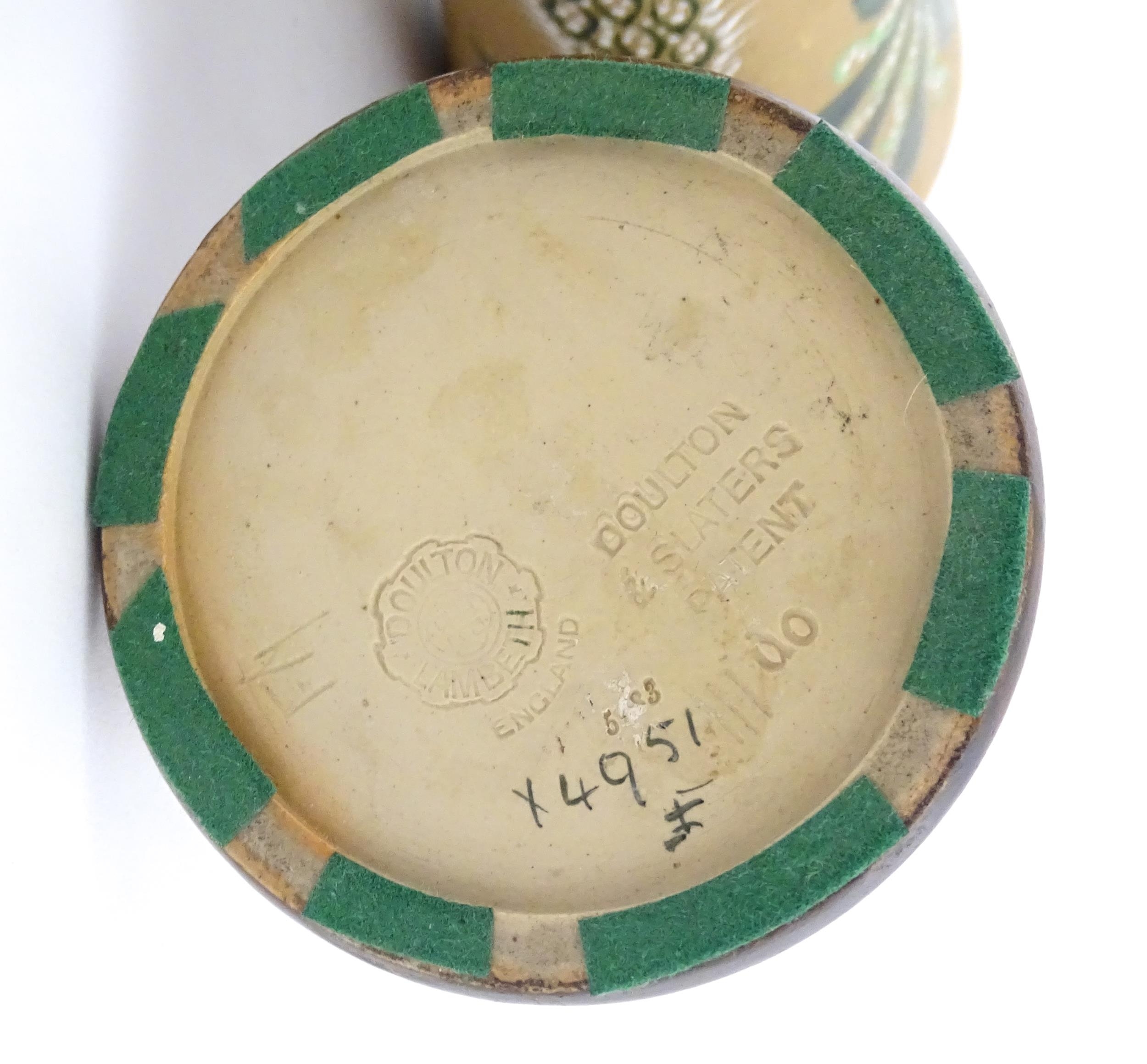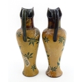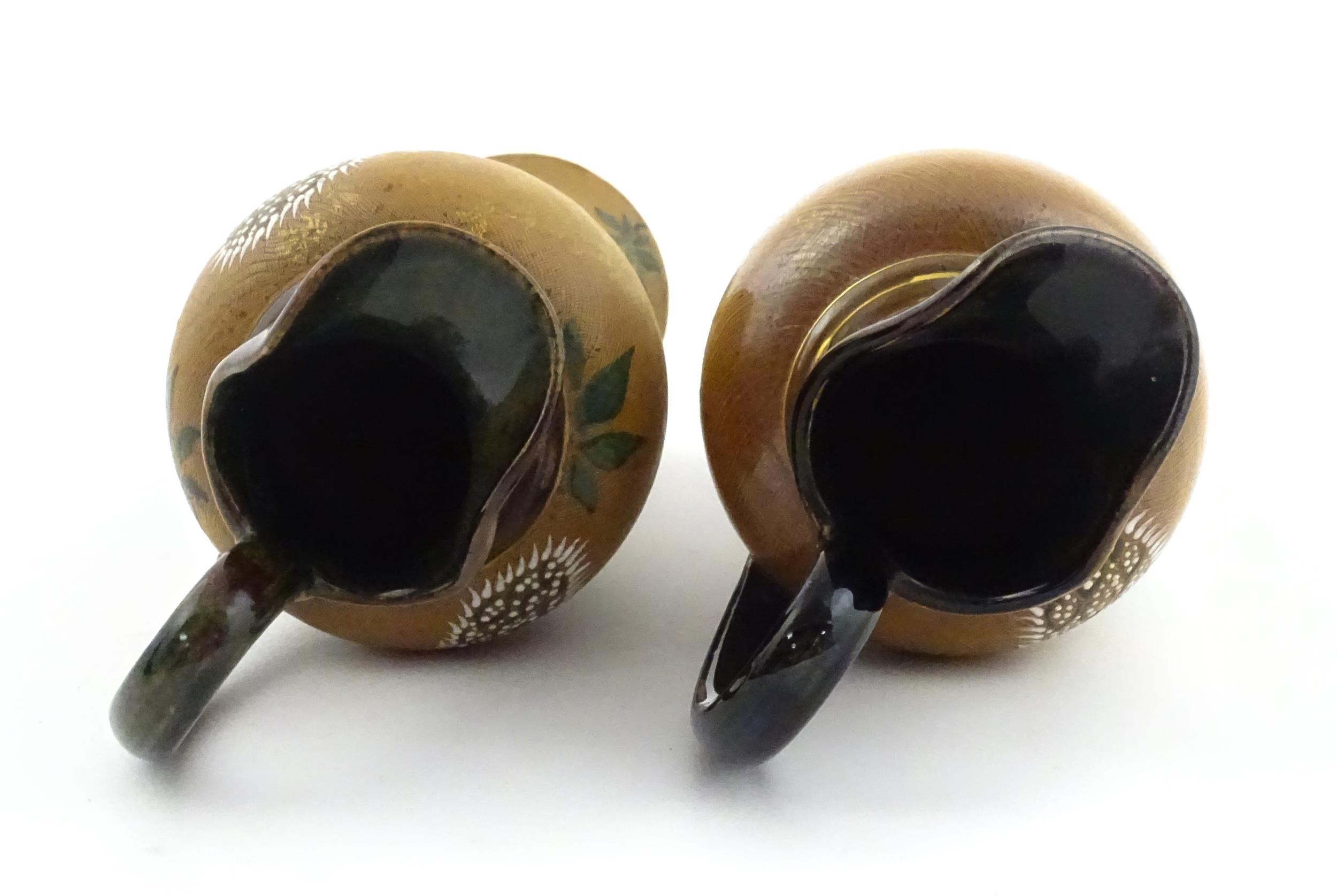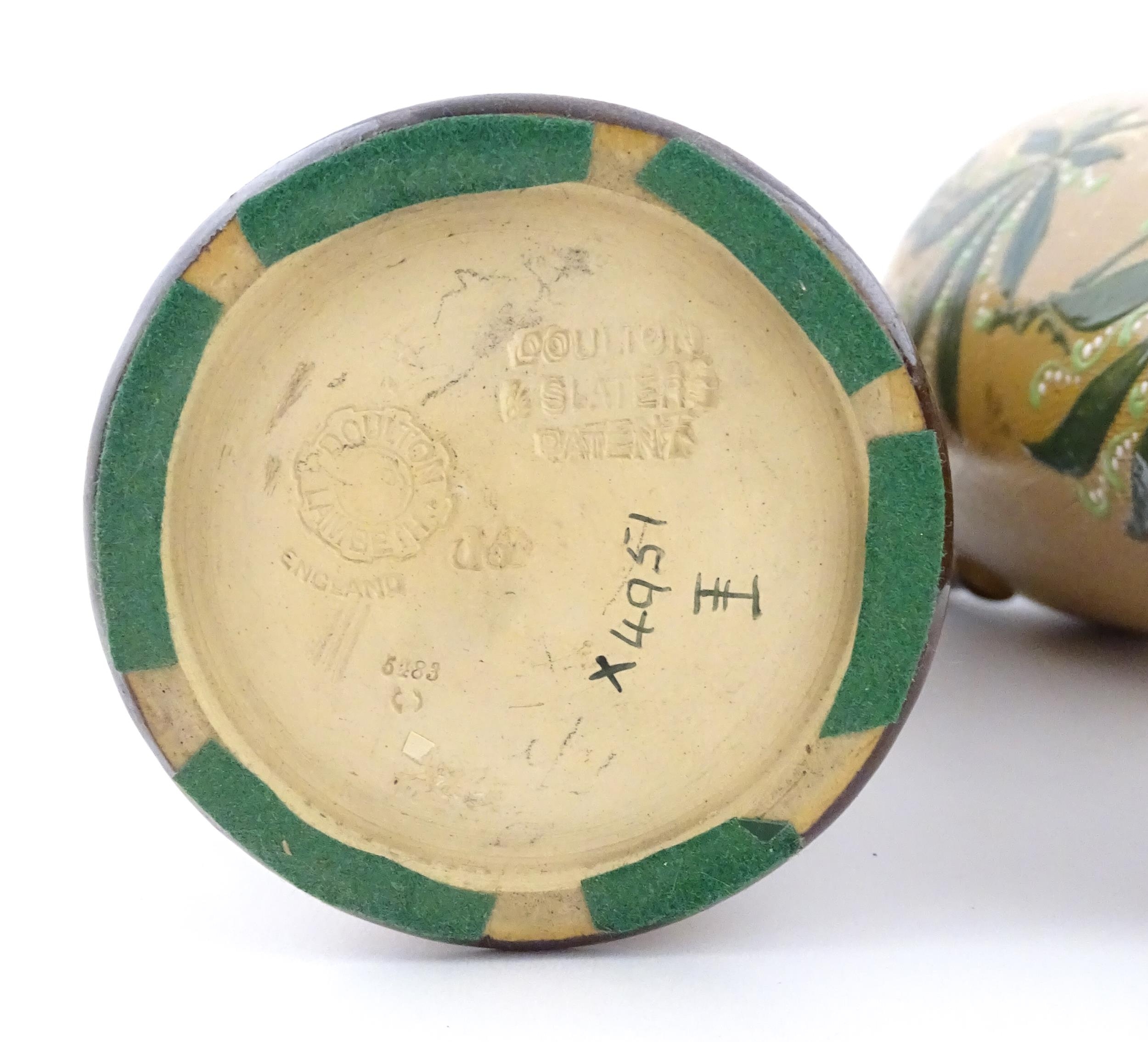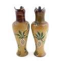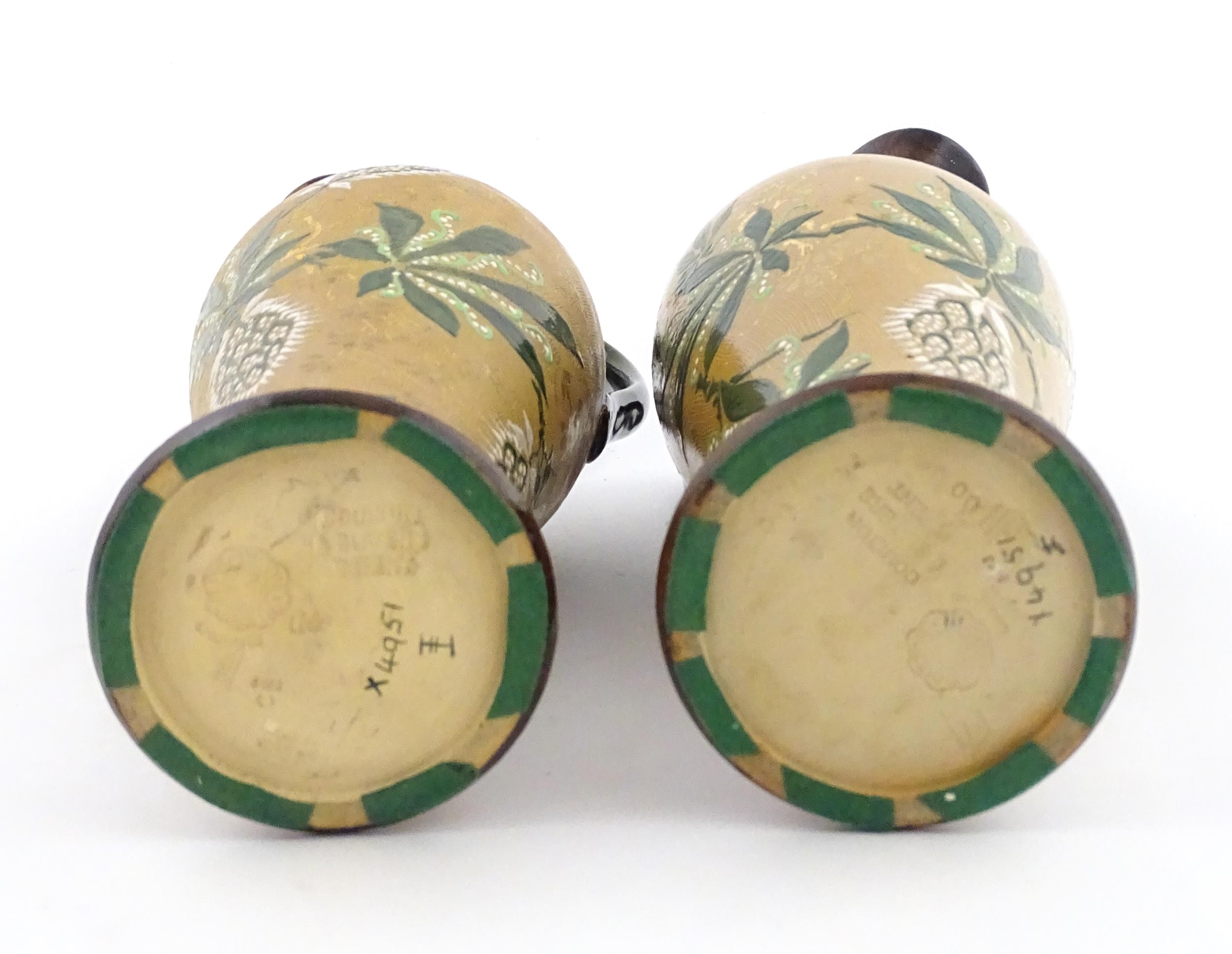 A pair of Doulton Lambeth ewers / pitchers with stylised floral and foliate decoration by Lizzie Marie Daintree. Marked under Doulton & Slaters Patent, numbered 5483 / X4951, with maker's mark. Approx. 12 1/4" high (2)