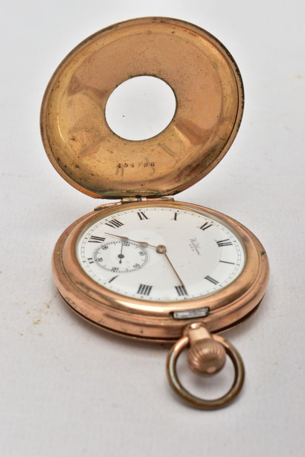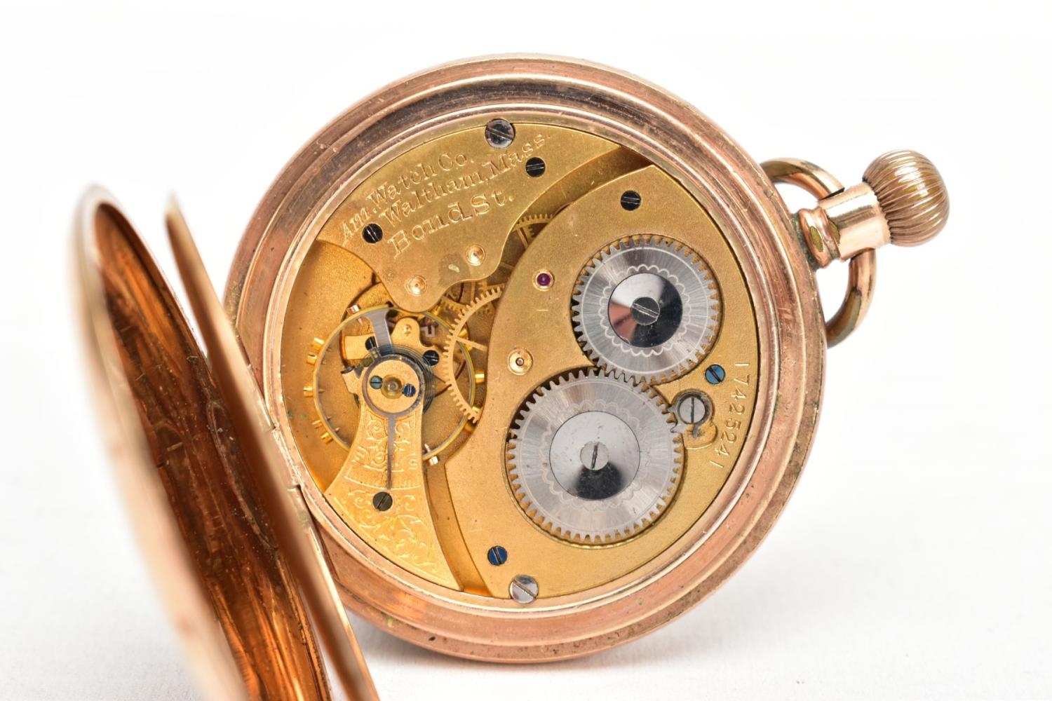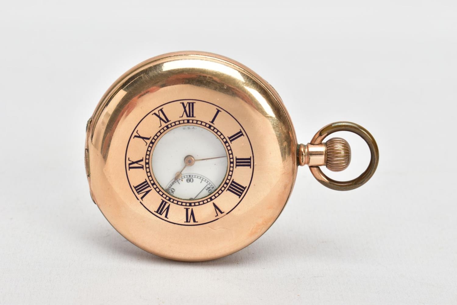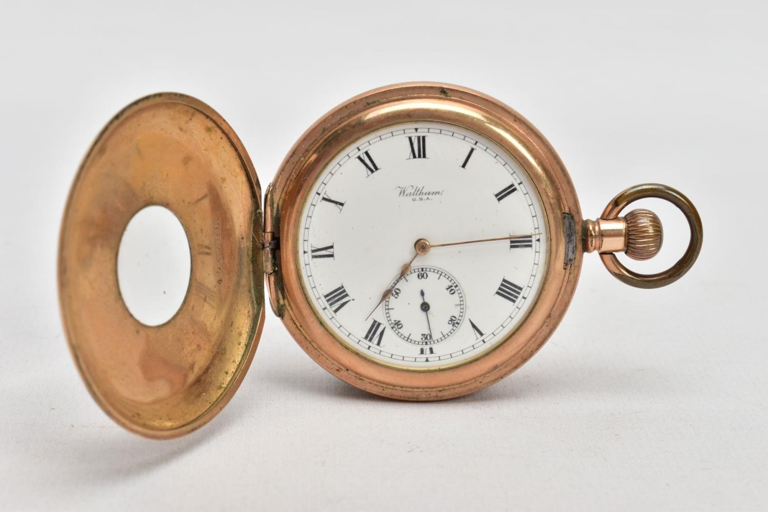 A ROLLED GOLD HALF HUNTER 'WALTHAM' POCKET WATCH, round white dial signed 'Waltham', Roman numerals, seconds subsidiary dial at the six o'clock position, gold hands, within a plain polished case with an outer blue enamel Roman dial, case back signed 'Dennison watch cases Co'454786, movement signed 'Am.Watch Co Waltham, Mass Bond St, 17425241, approximate case width 49.5mm, together with a small brown pouch (condition report: watch working at time of cataloguing, time keeping untested, general light wear, some wear to the suspension loop)
