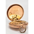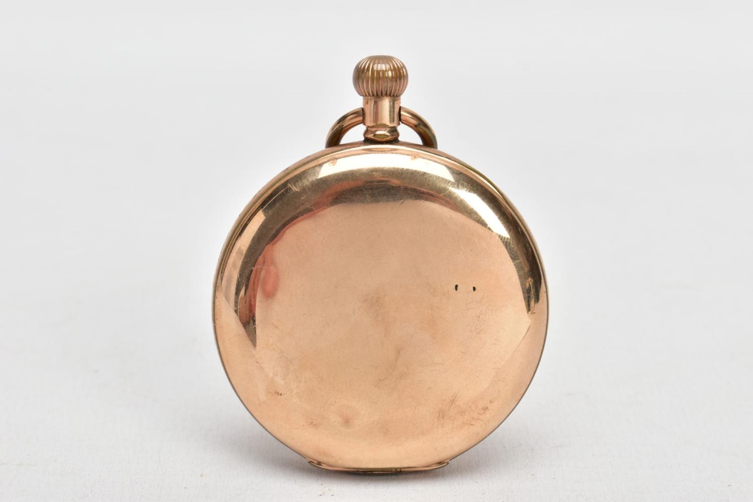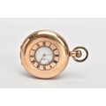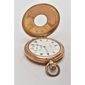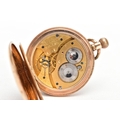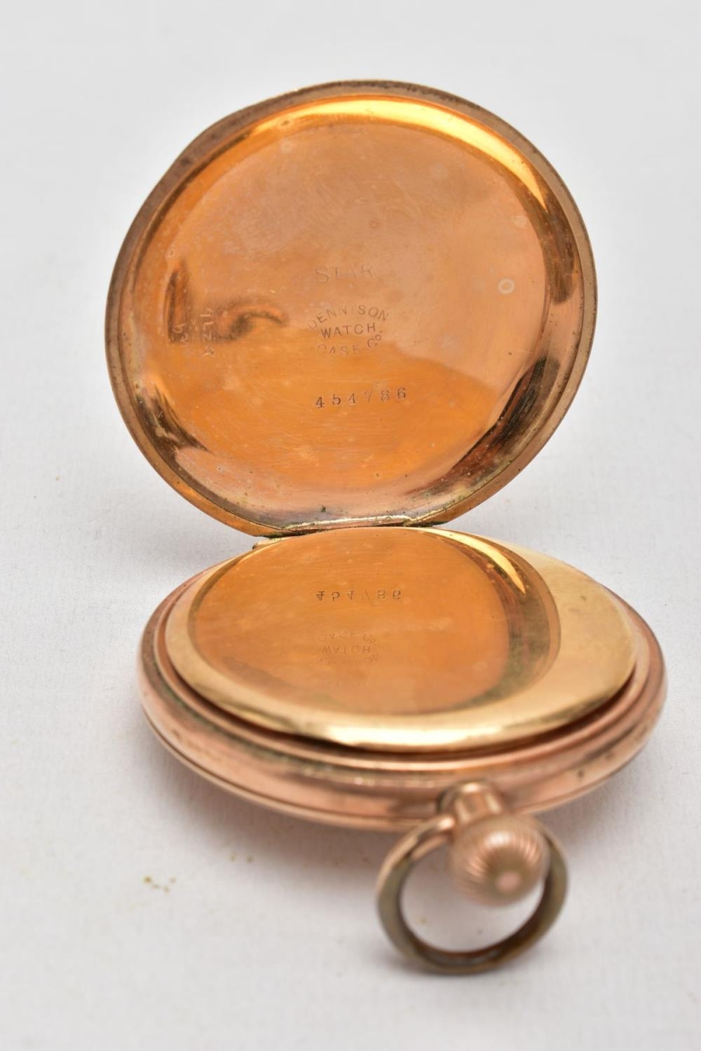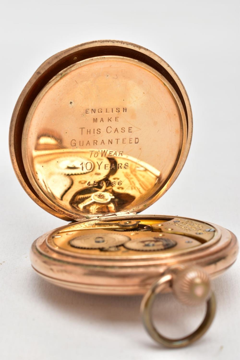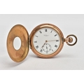 A ROLLED GOLD HALF HUNTER 'WALTHAM' POCKET WATCH, round white dial signed 'Waltham', Roman numerals, seconds subsidiary dial at the six o'clock position, gold hands, within a plain polished case with an outer blue enamel Roman dial, case back signed 'Dennison watch cases Co'454786, movement signed 'Am.Watch Co Waltham, Mass Bond St, 17425241, approximate case width 49.5mm, together with a small brown pouch (condition report: watch working at time of cataloguing, time keeping untested, general light wear, some wear to the suspension loop)