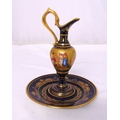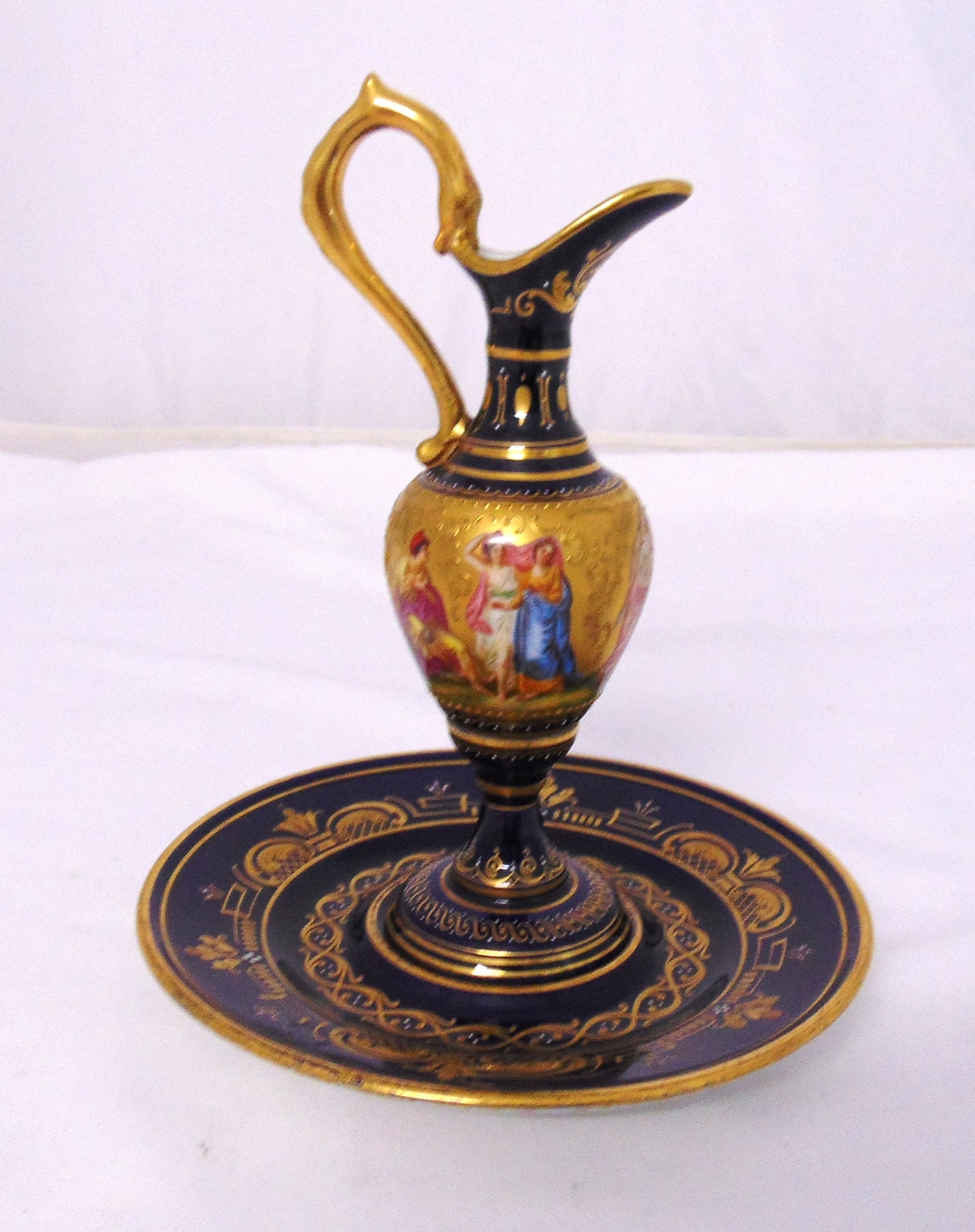 A Vienna miniature ewer gilded and decorated with classical figures all on a circular stand with gilt highlights, marks to the bases, 23cm (h)