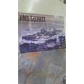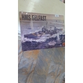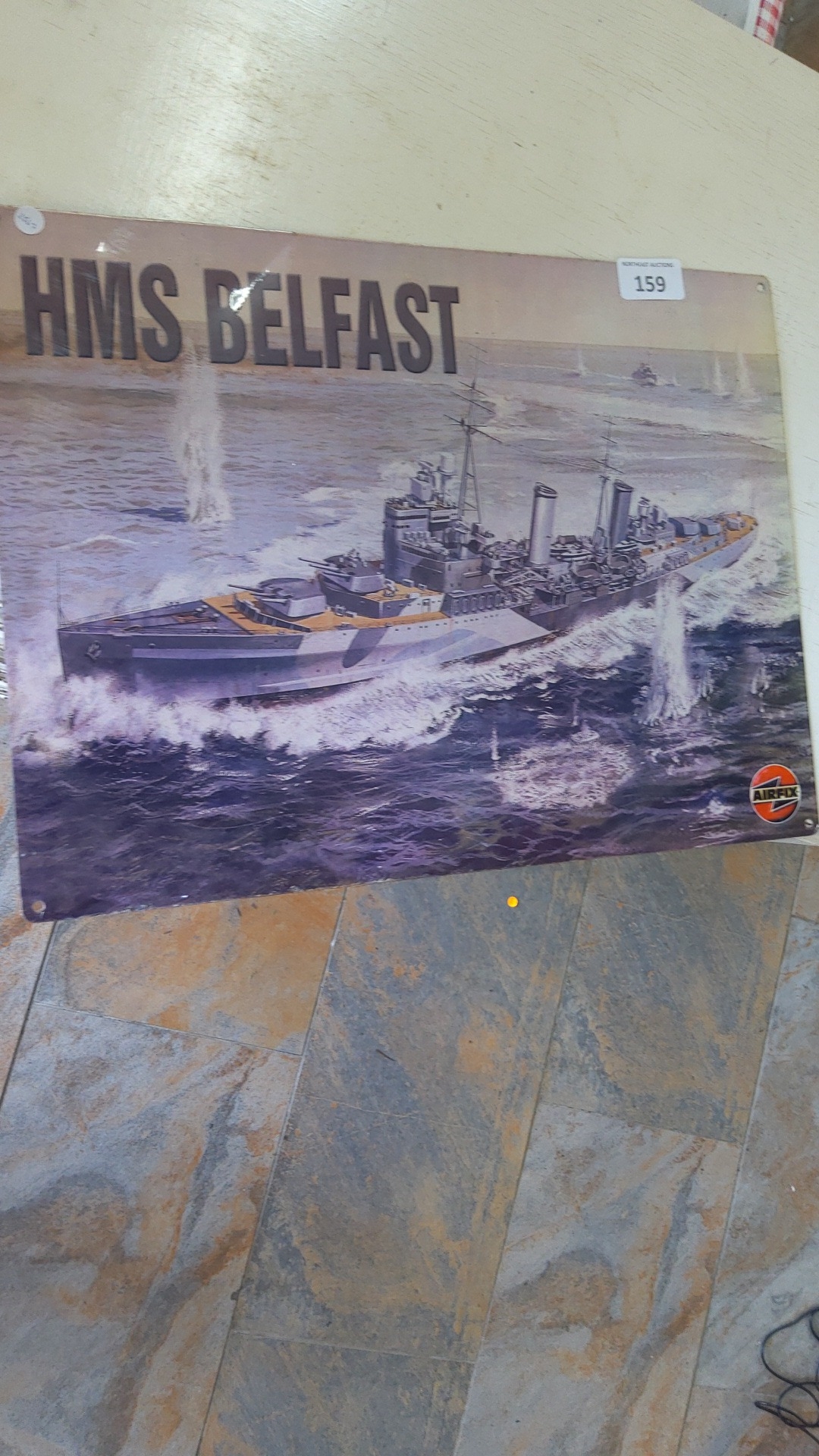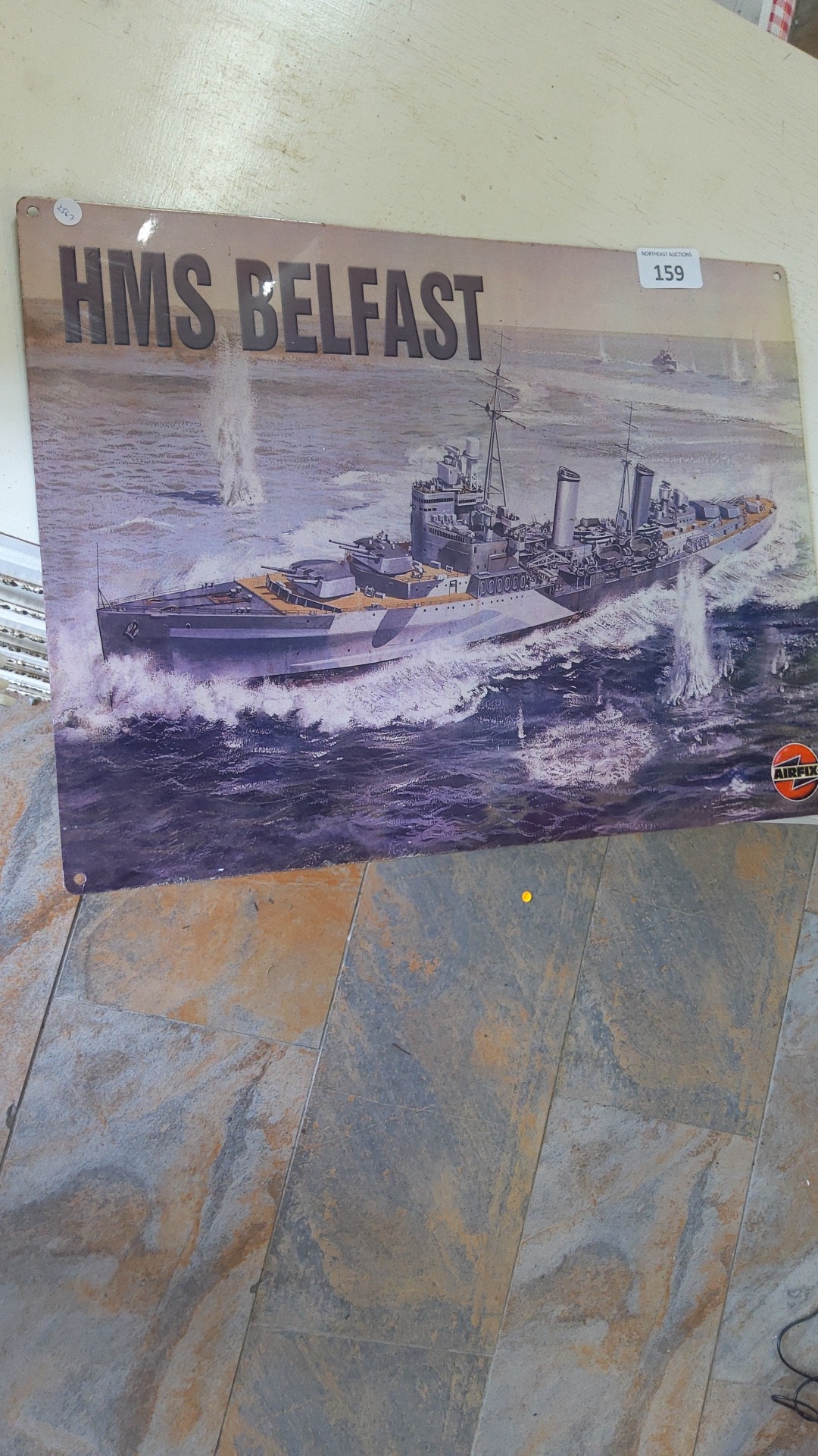 Airfix ‘HMS Belfast’ printed advertising tin sign—depicting the Royal Navy cruiser under fire at sea, with bold block title at upper left and Airfix roundel at lower right; drilled for wall mounting.
