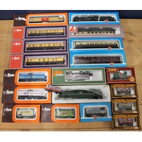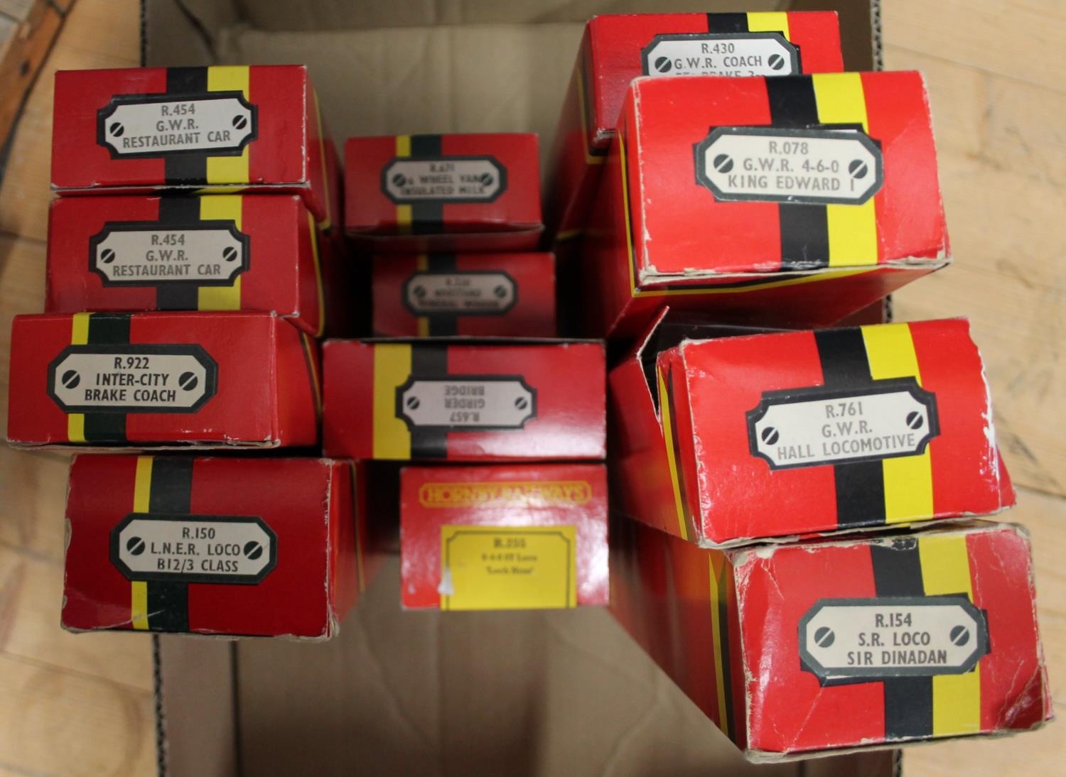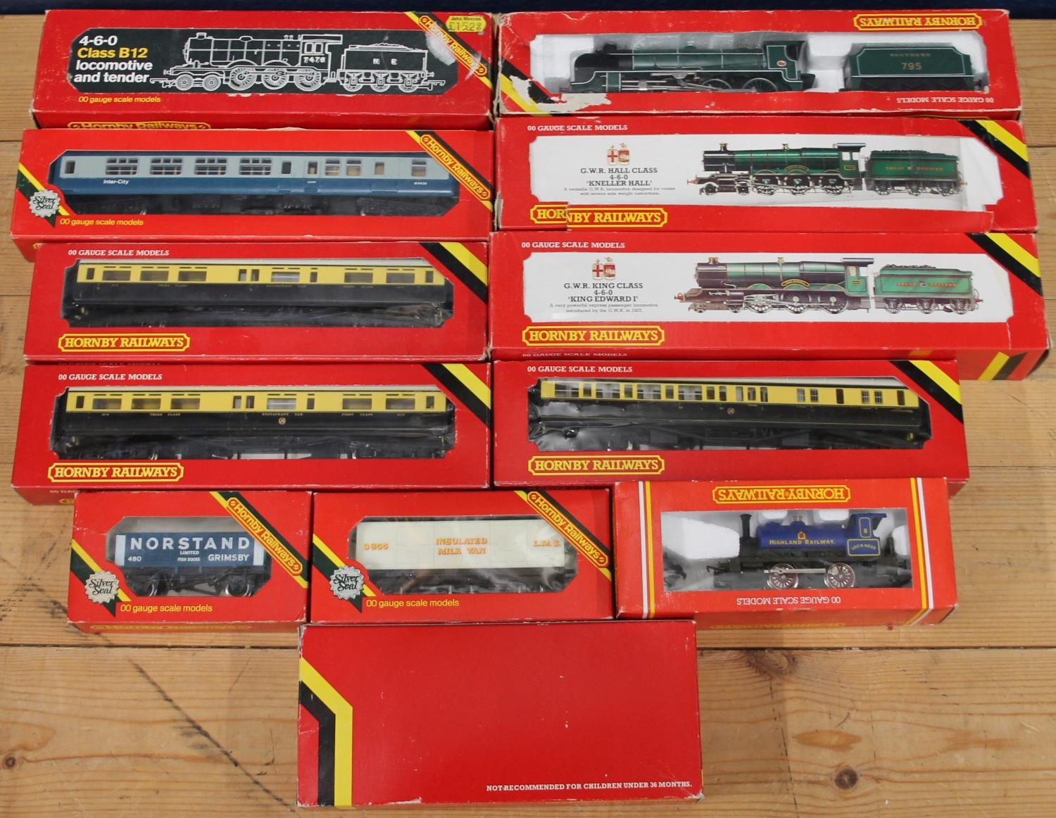 Hornby Railways OO gauge model railways to include R078 4-6-0 King Edward I tender locomotive 6024 GWR green, R761 4-6-0 Kneller Hall tender locomotive 5934 GWR green, R154 4-6-0 Sir Dinadan tender locomotive 795 Southern green, R150 4-6-0 Class B12 tender locomotive 7476 NE black, R255 0-4-0 ST Loch Ness locomotive 8 Highland Railway blue, R430 GWR coach 3rd brake, R454 GWR restaurant car x2, R922 Inter City brake coach, R220 Norstand Mineral Wagon and R657 Girder Bridge, each boxed. (11)