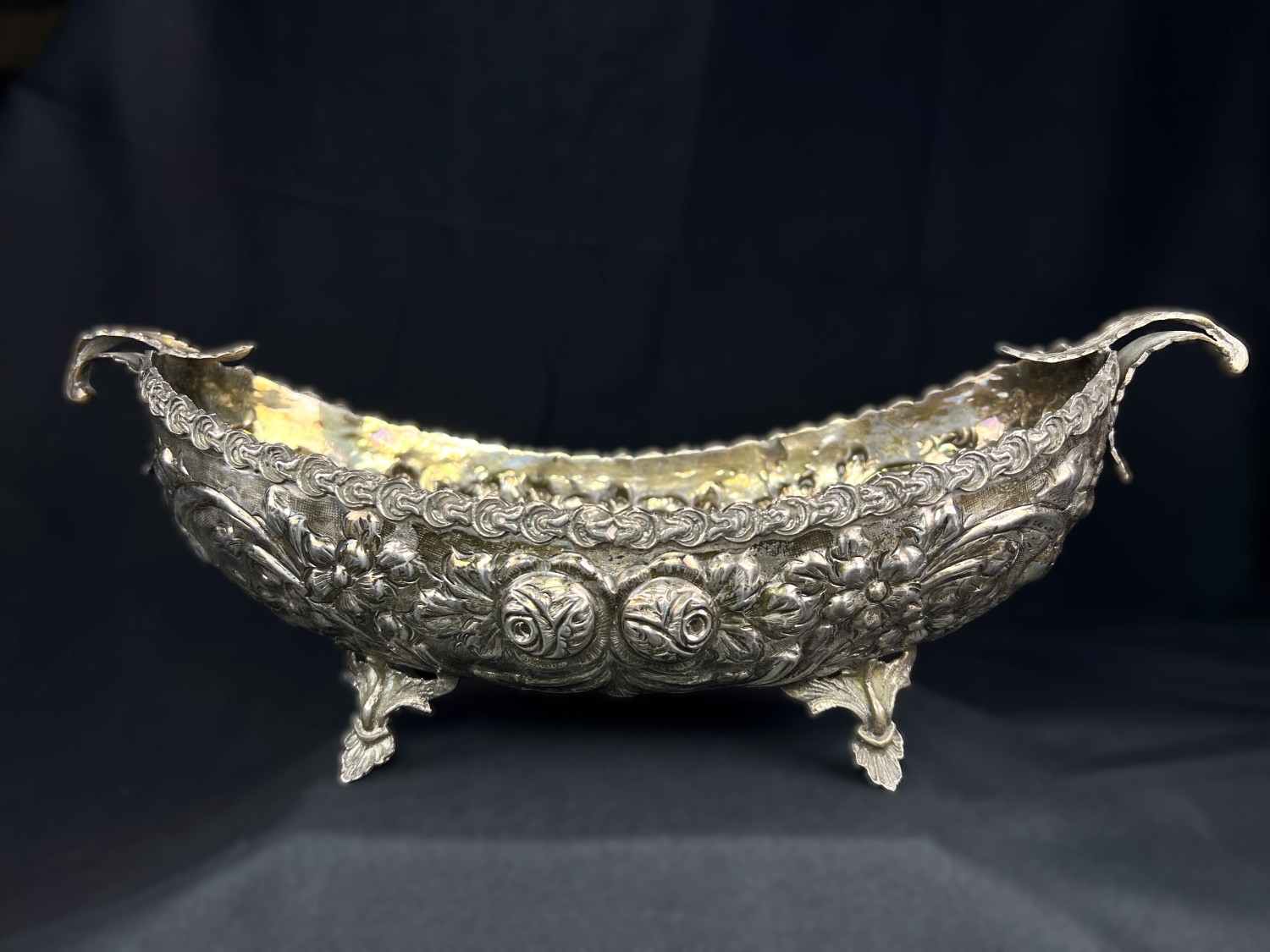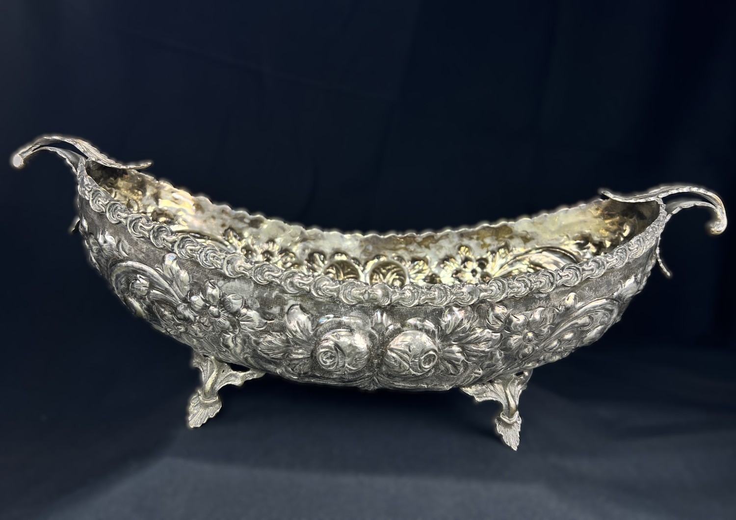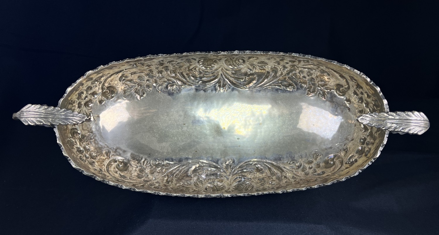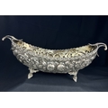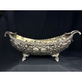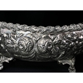 A continental boat shaped 2 handled bowl with extensive embossed flowerhead and acanthus decoration, on 4 feet, stamped A G 800, 15.75ozt, length 36cm