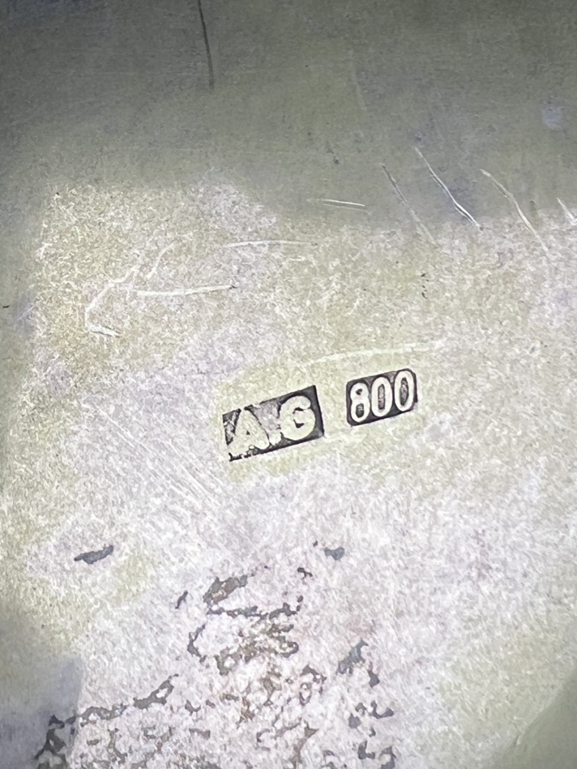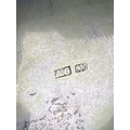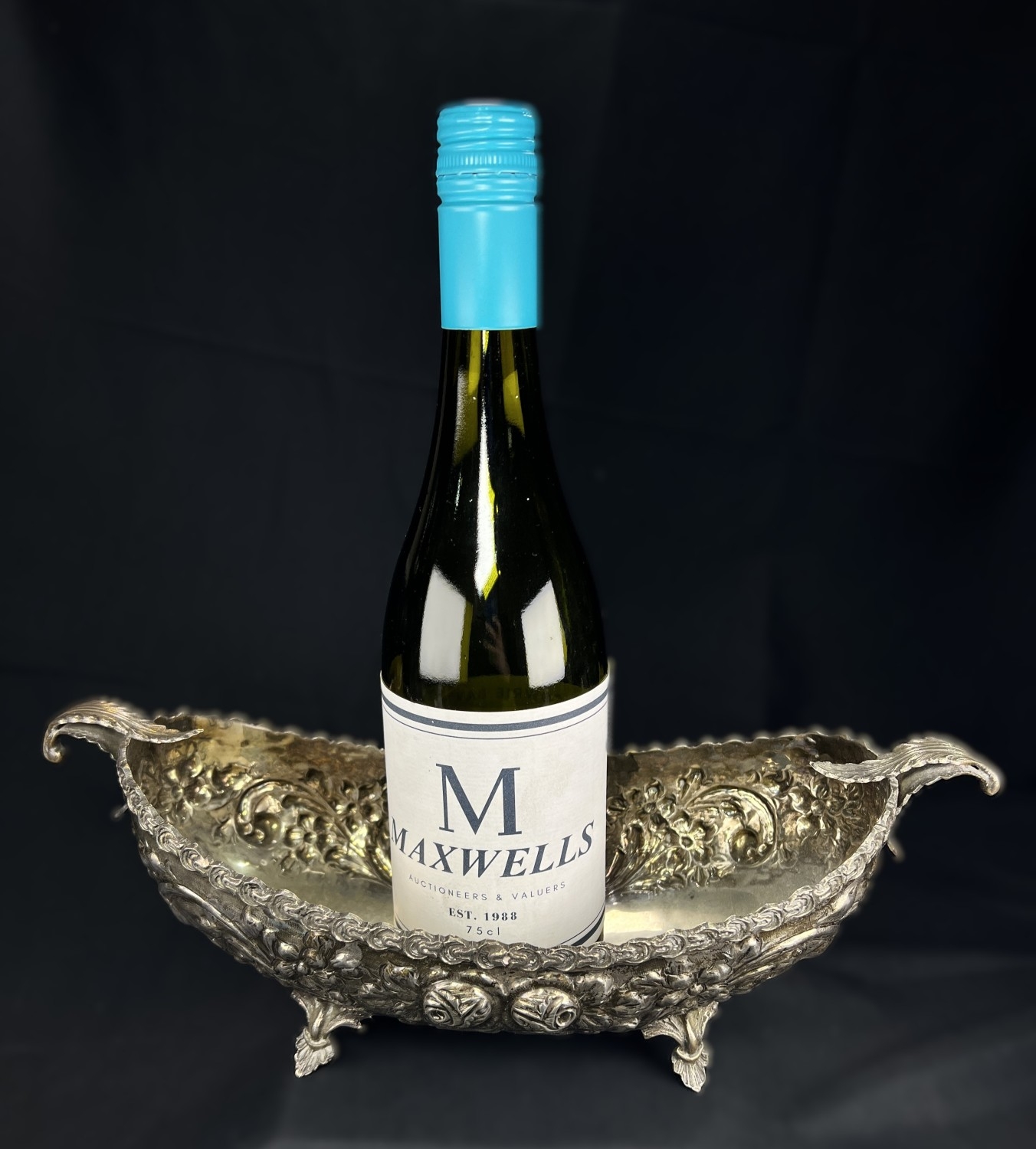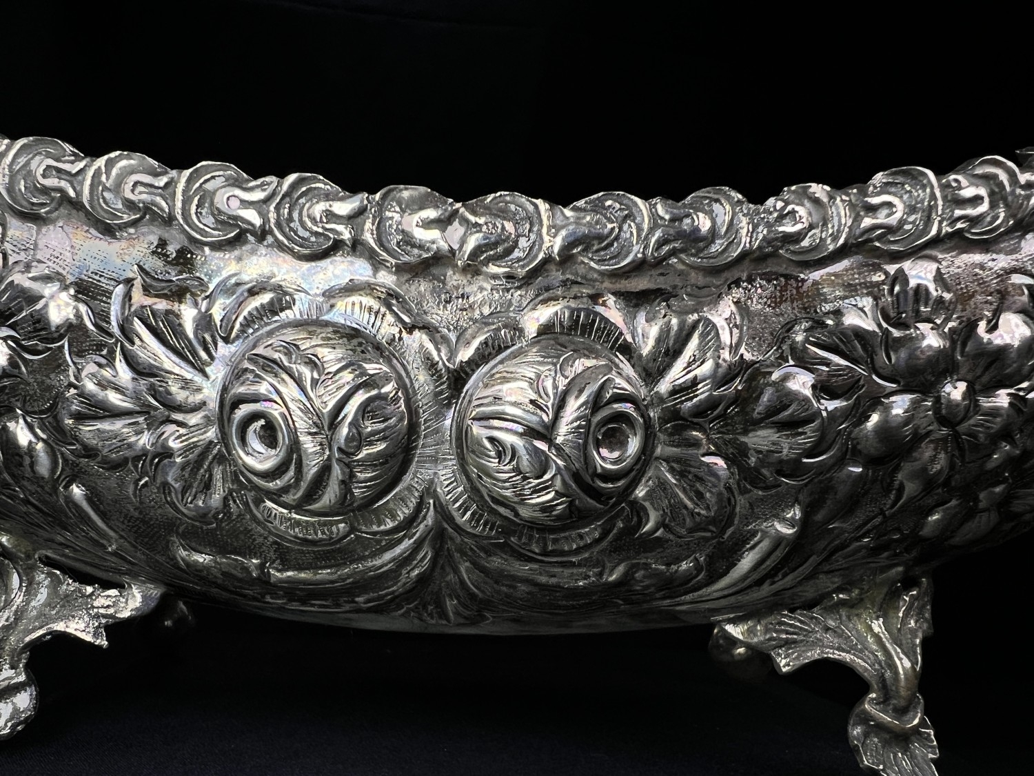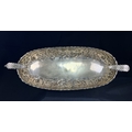 A continental boat shaped 2 handled bowl with extensive embossed flowerhead and acanthus decoration, on 4 feet, stamped A G 800, 15.75ozt, length 36cm