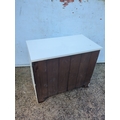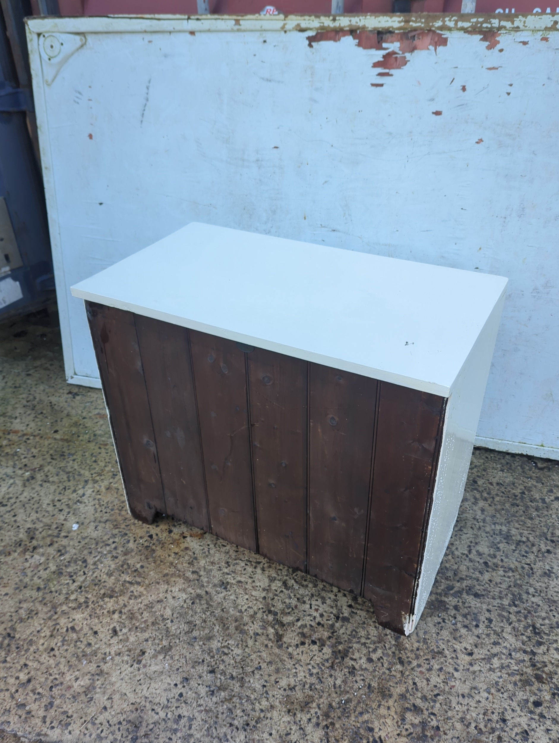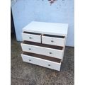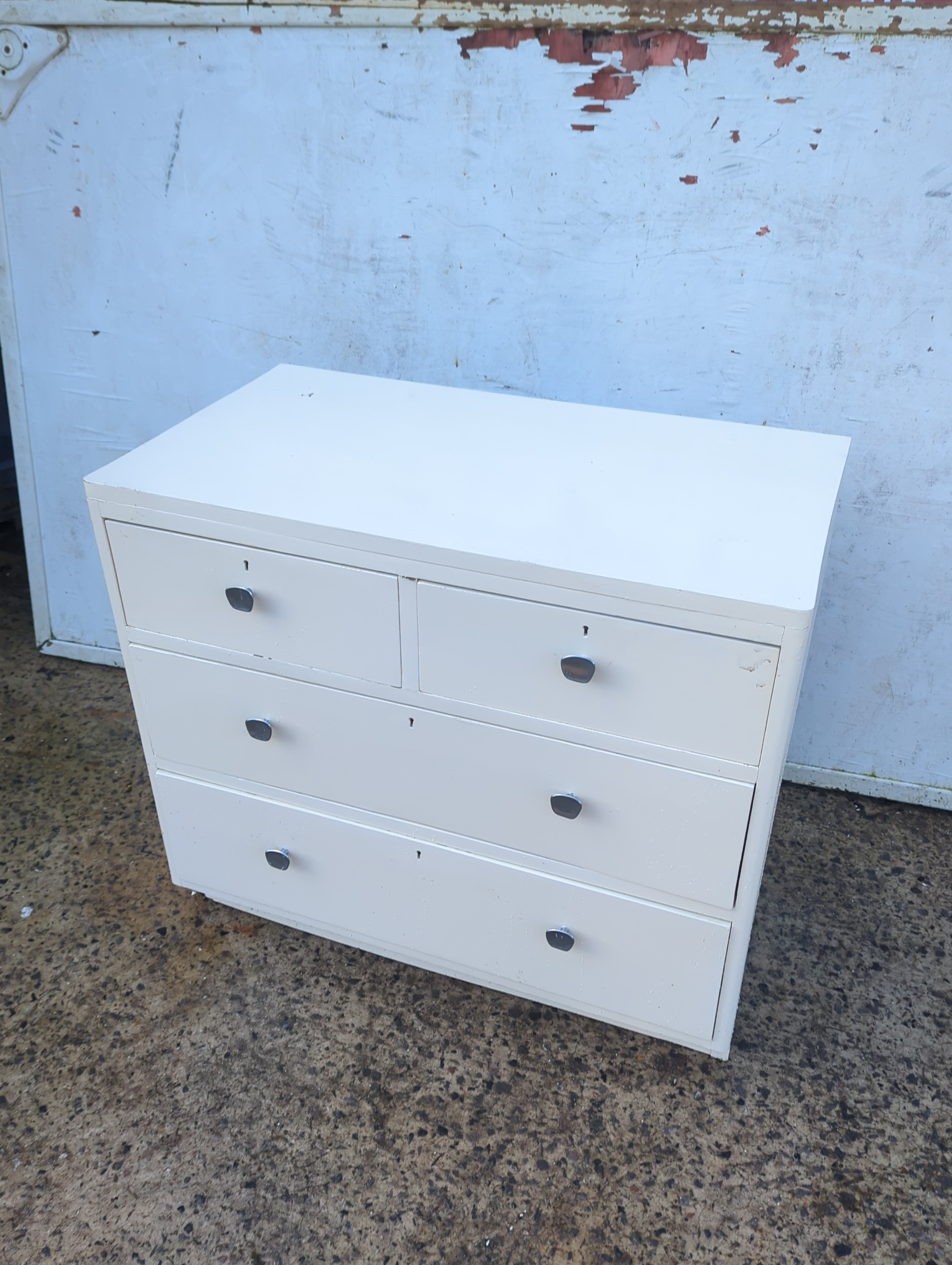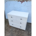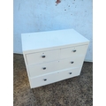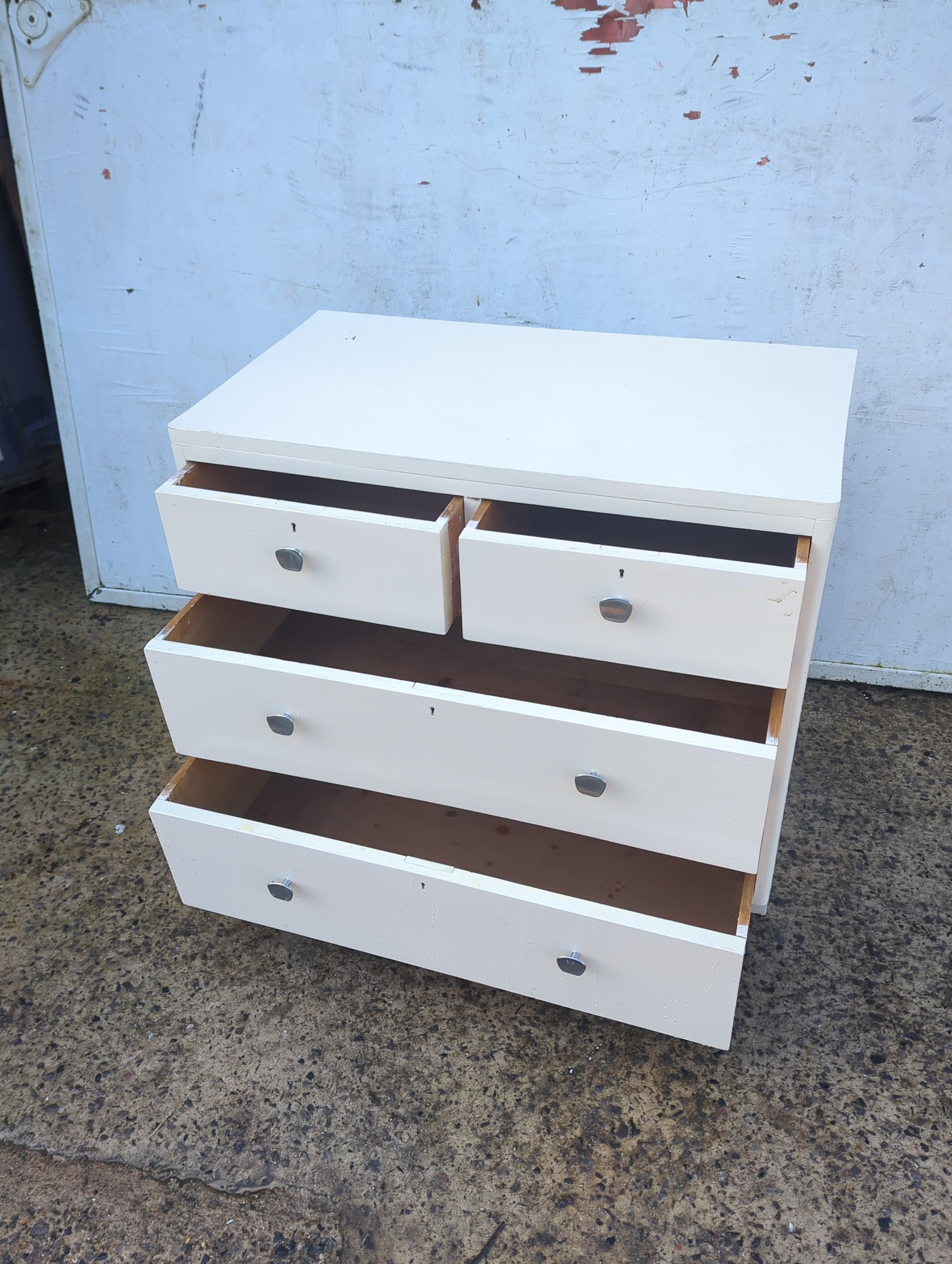 This is a white-painted chest of drawers featuring four drawers with circular handles. The unit appears to have a white finish on the front and top, while the back is wooden. It provides ample storage with its multiple roomy drawers.