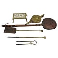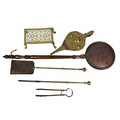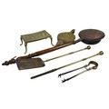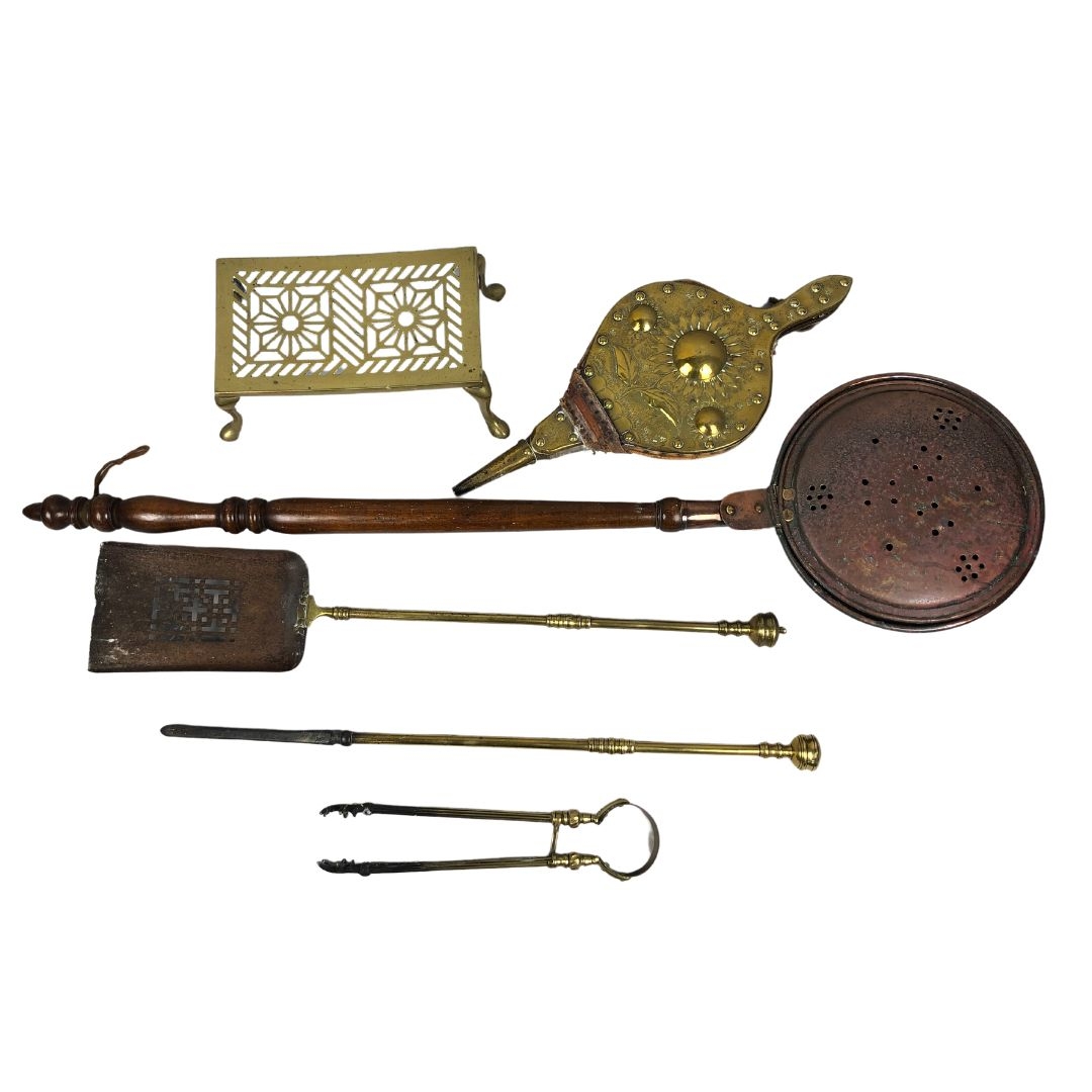 Collection of Vintage Fireside Items including Brass Trivet, Bellows, Bedpan and Fireside Set.