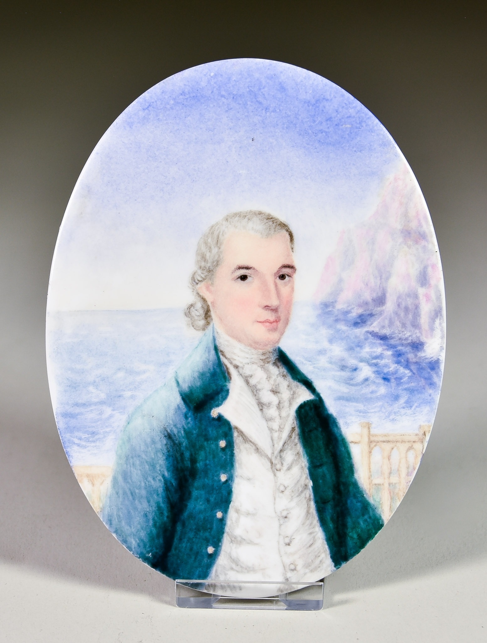 An Oval Miniature Portrait of a John Beadle Bedolfe, 19th Century, in green jacket with sea to background, ceramic 6ins x 4.5ins, with painted crest to verso