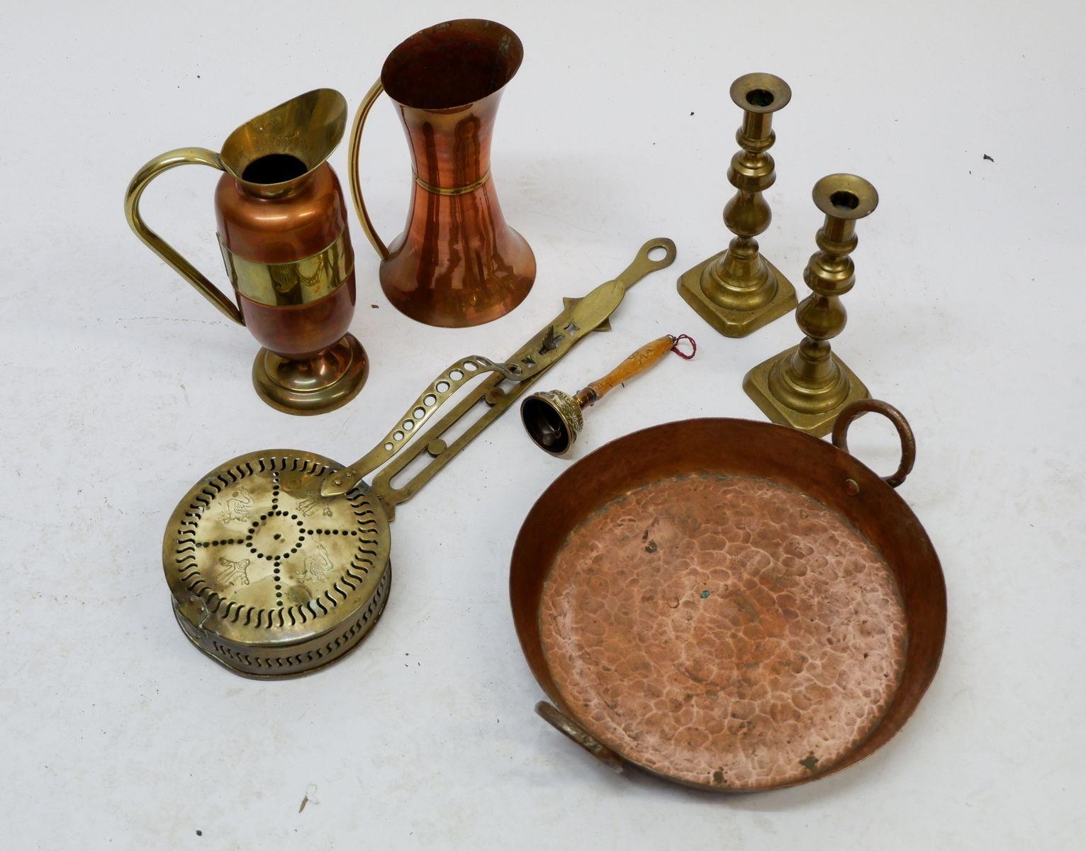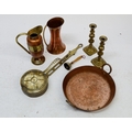 A box of copper and brass including brass chestnut roaster