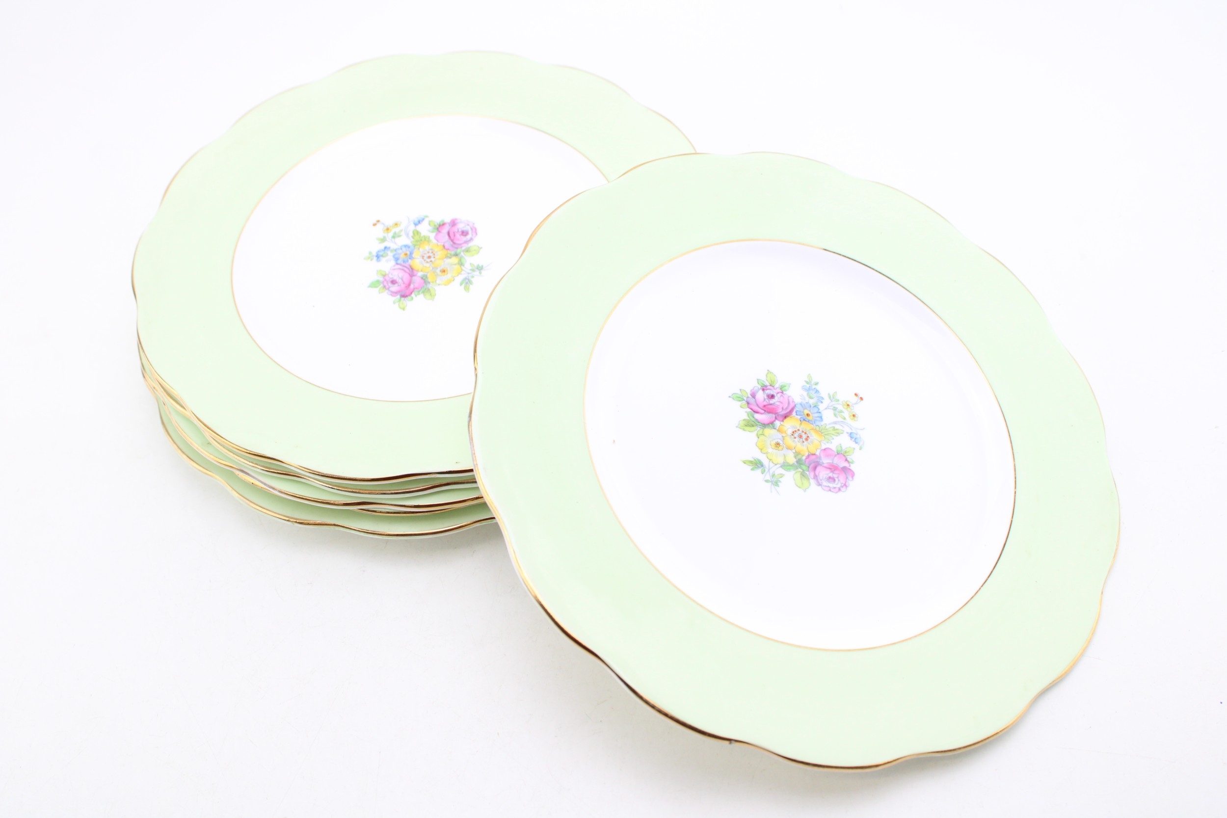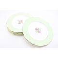 A set of six Royal Albert cabinet plates with central floral sprays, light green background with gilt rims, 27cm diameter (6).