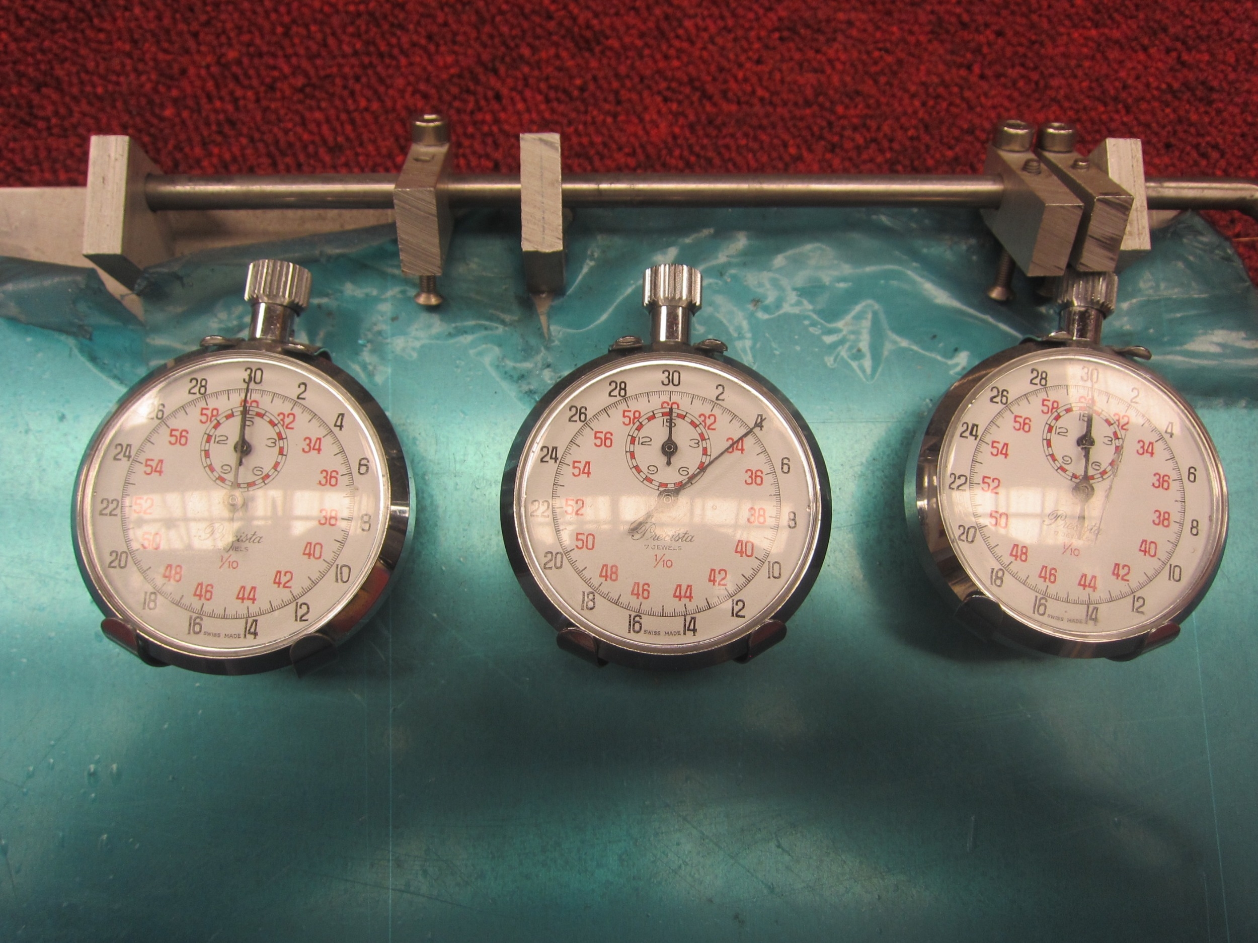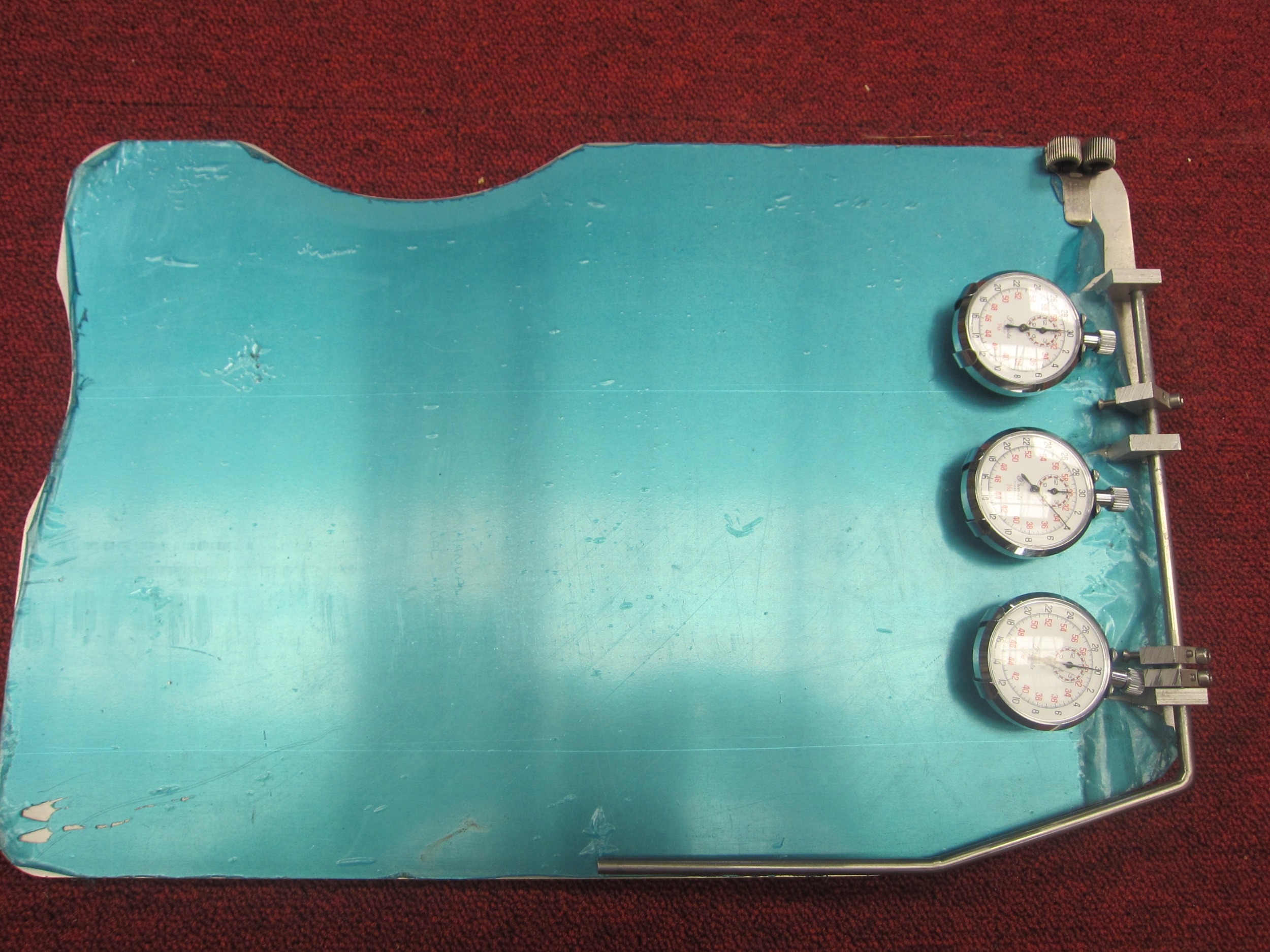 An aluminium racing clip board with three Precista stop watches. This item was acquired by the vendor from Lotus when they moved from Cheshunt to Hethel
