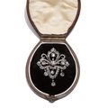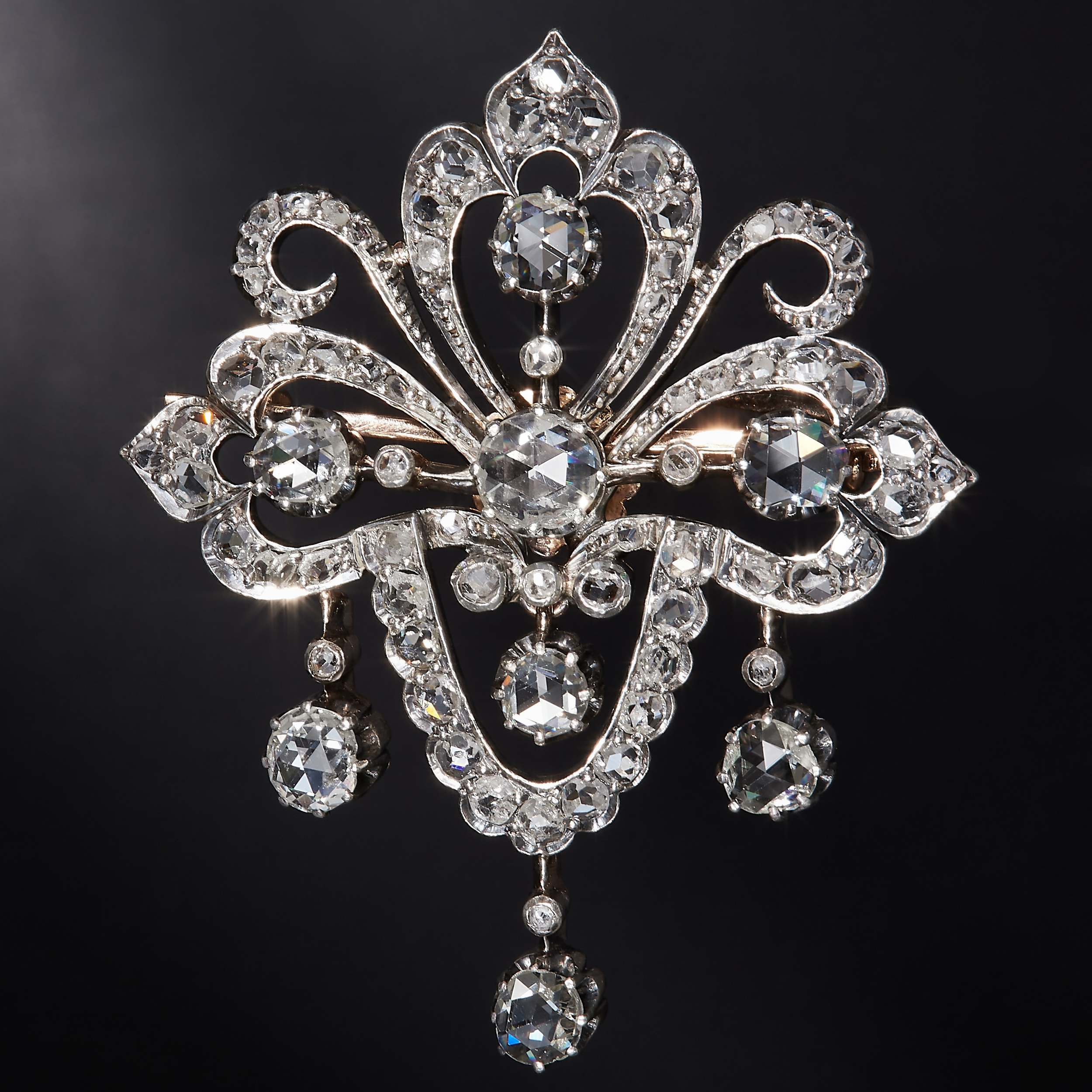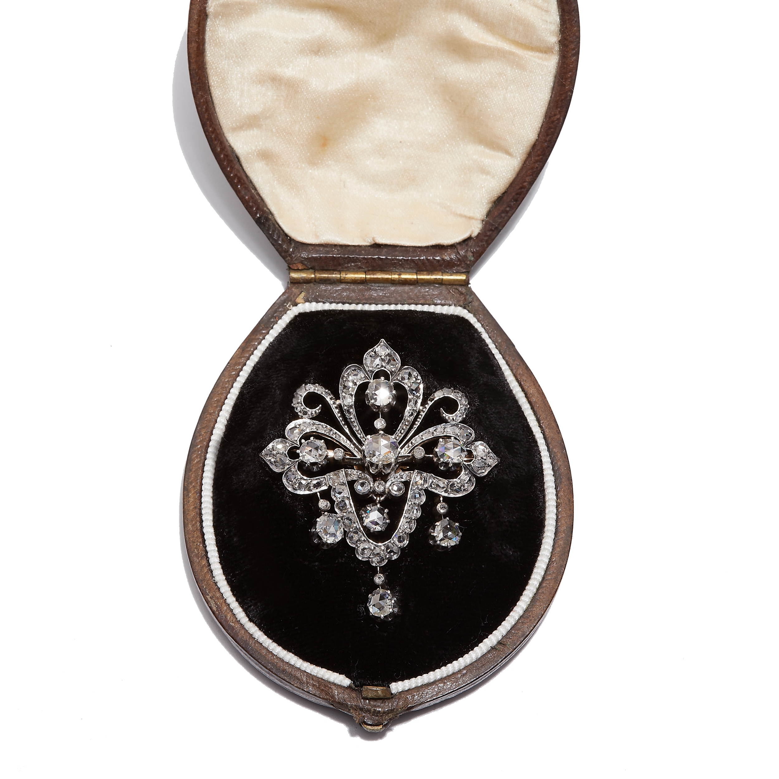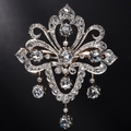 VICTORIA DIAMOND DROP BROOCH, of openwork, part scrolling design. Set with diamonds totalling approx. 2.35 ct. Suspending 3 diamond drops to the bottom. W. 3.6 cm. 11.7 grams. With fitted box.