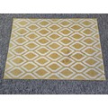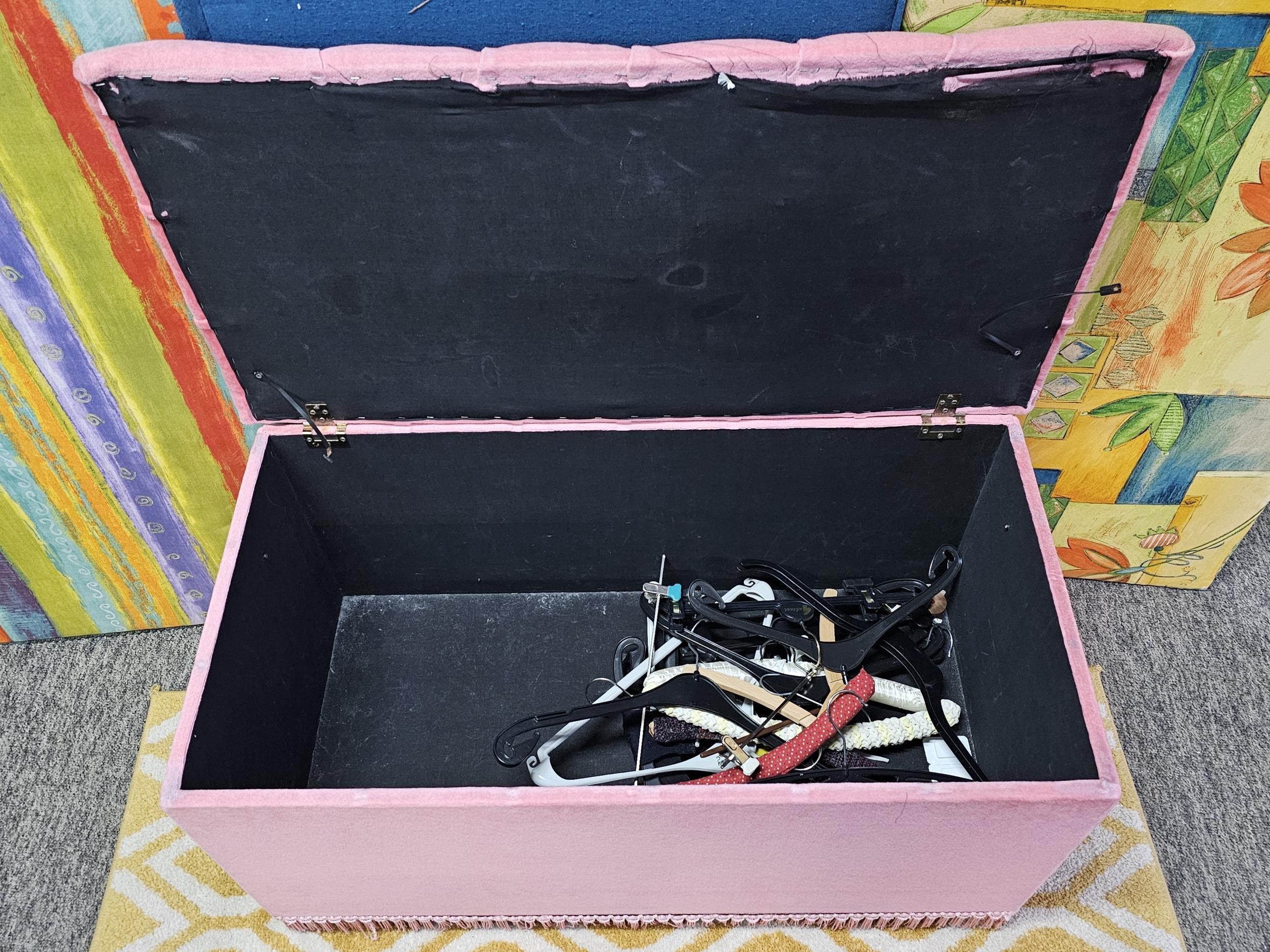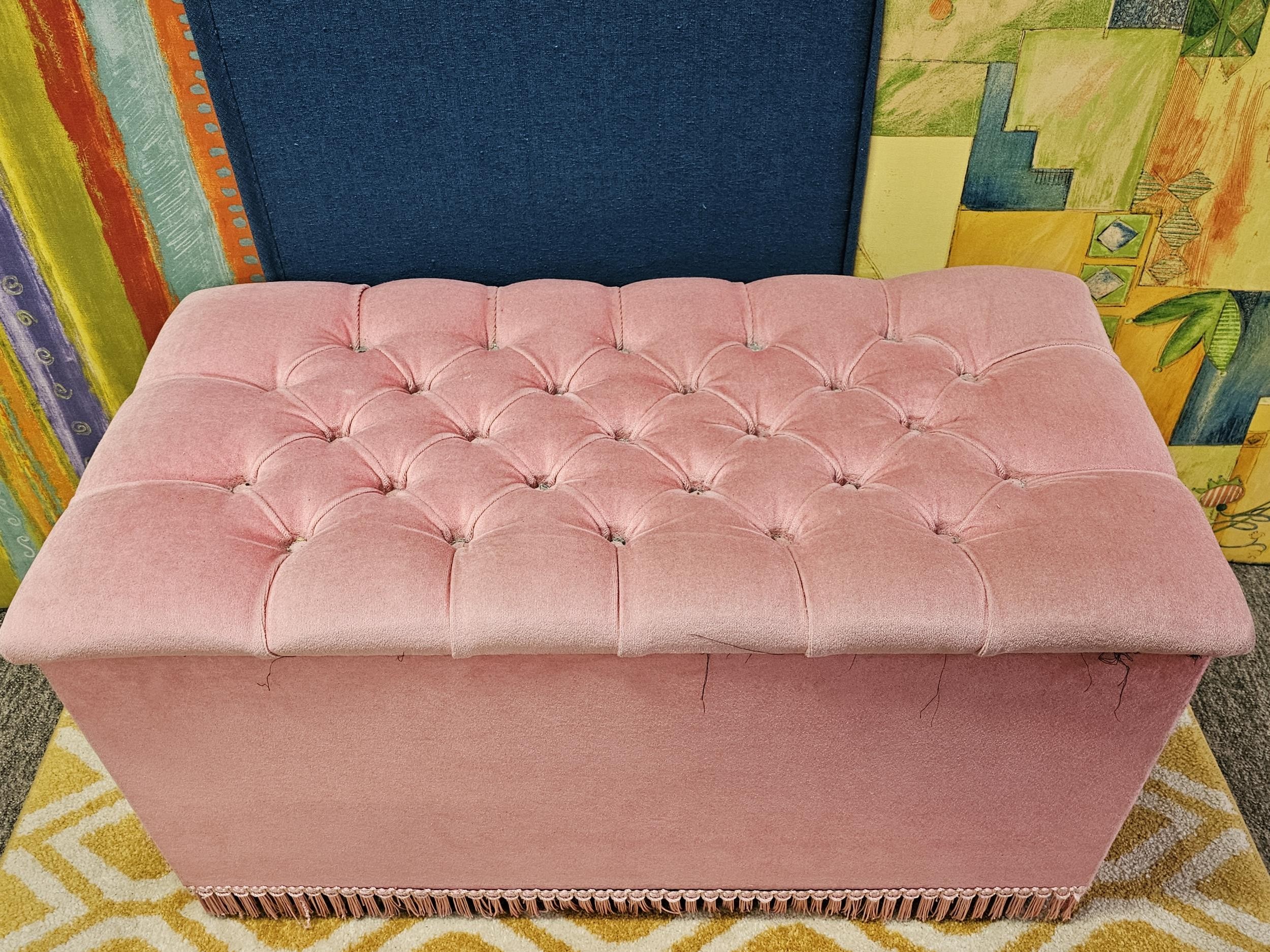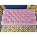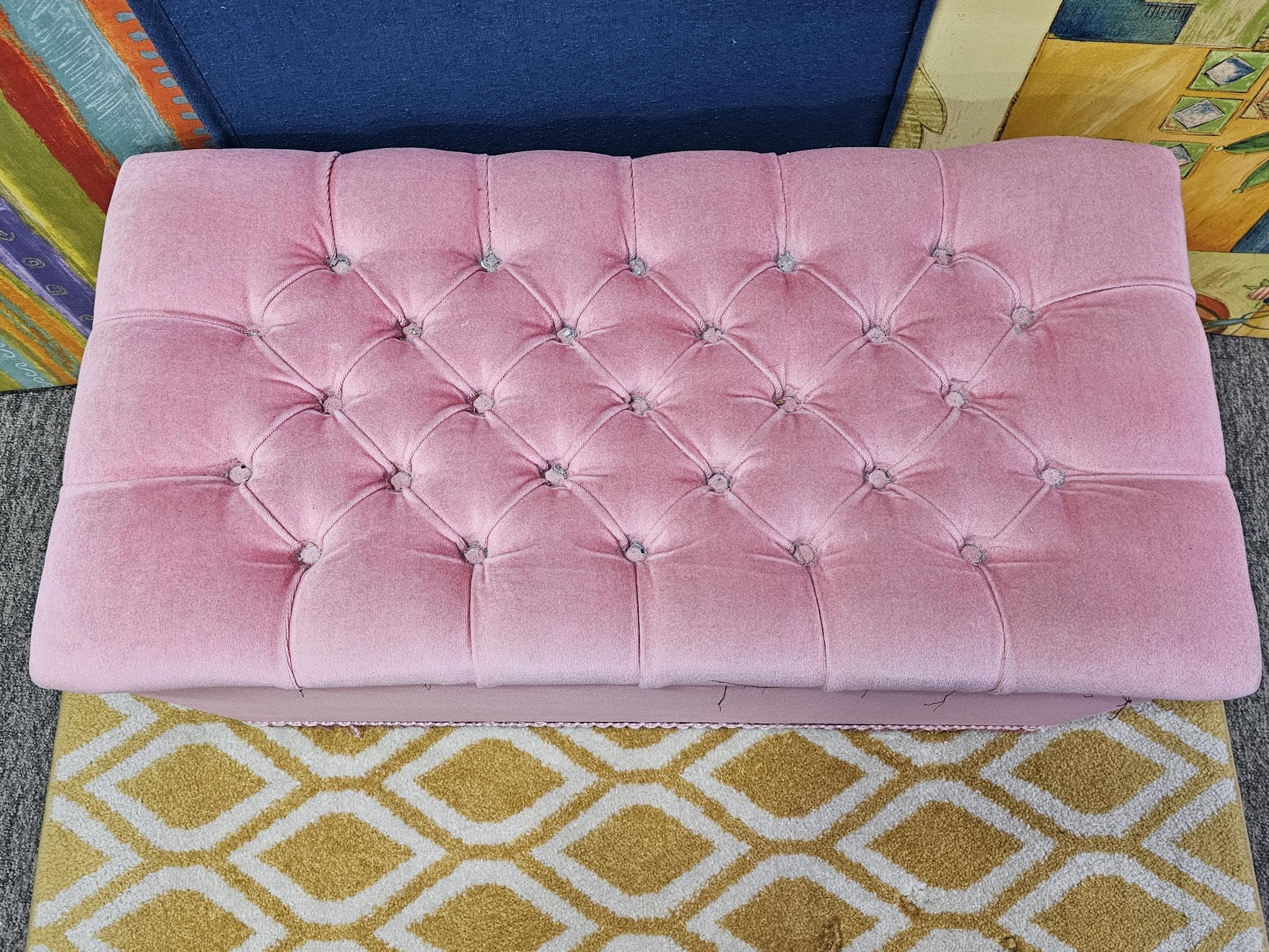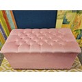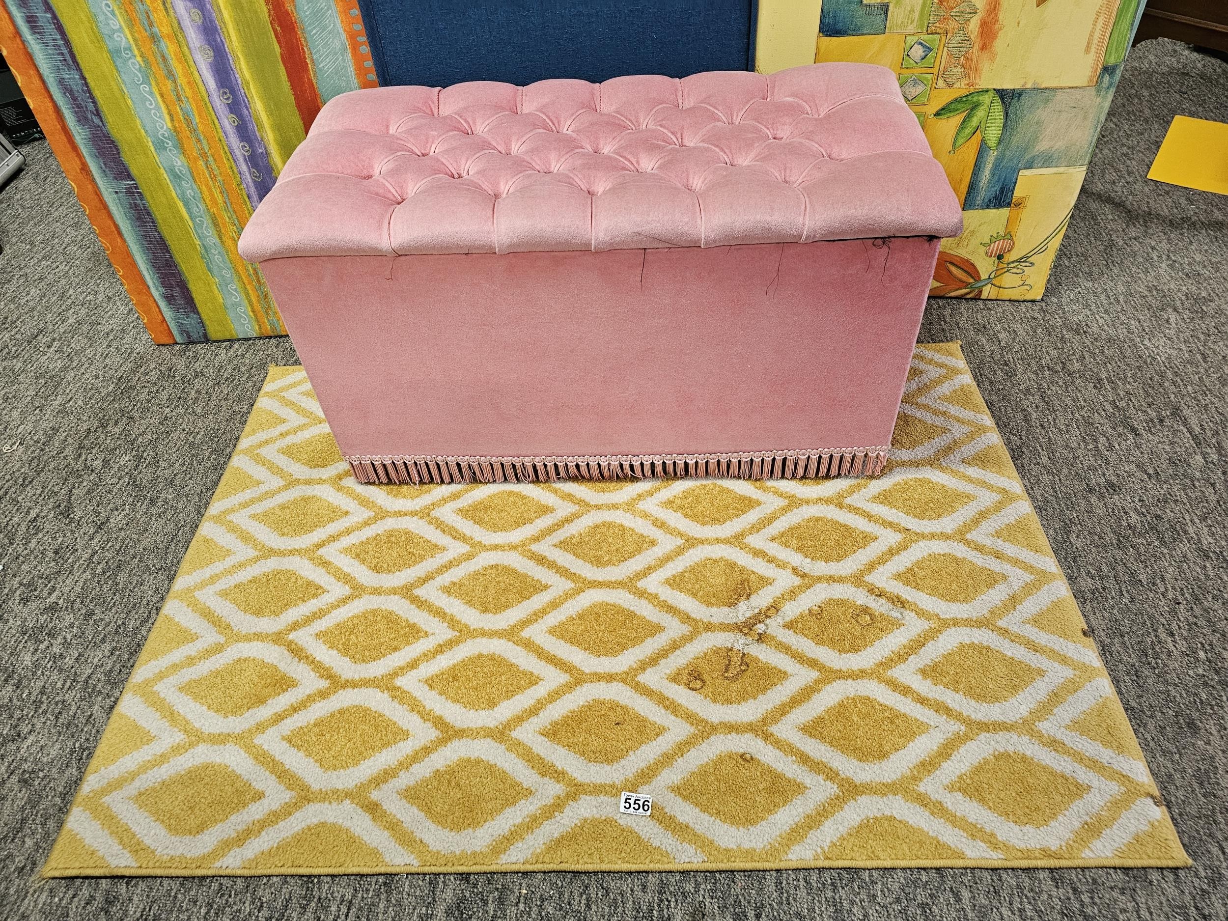 A good quality The Saxon Collection Friese rug in yell with a geometric design in good order with no rips or tares along with a vintage pink ottoman / blanket box in good order with a plush pink top with button design opens to a lined interior with a quantity of coat hangers inside, stands on four castors, has a height of 50cm a length of 94cm and a depth of 47cm