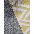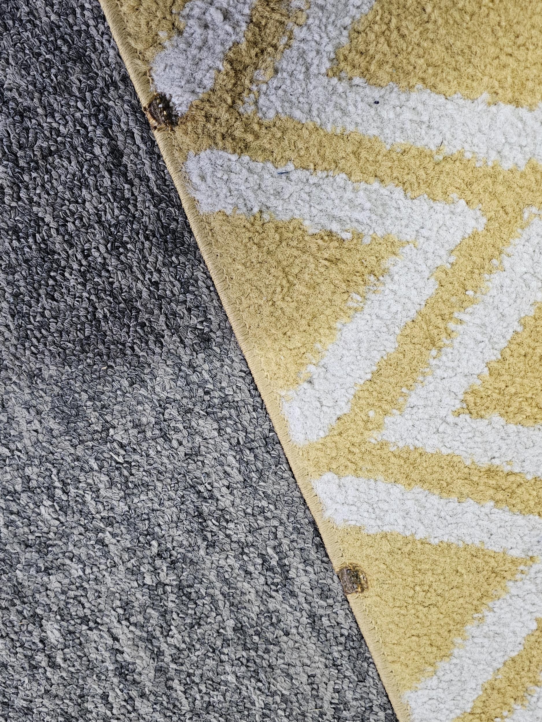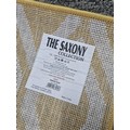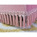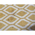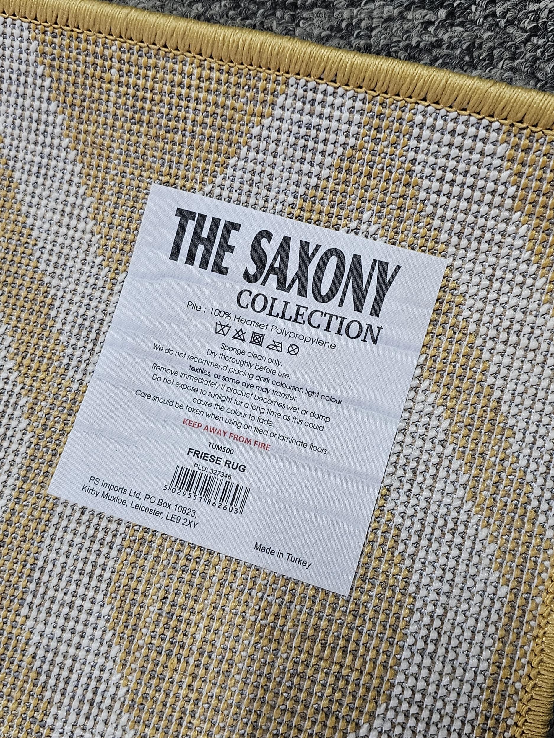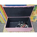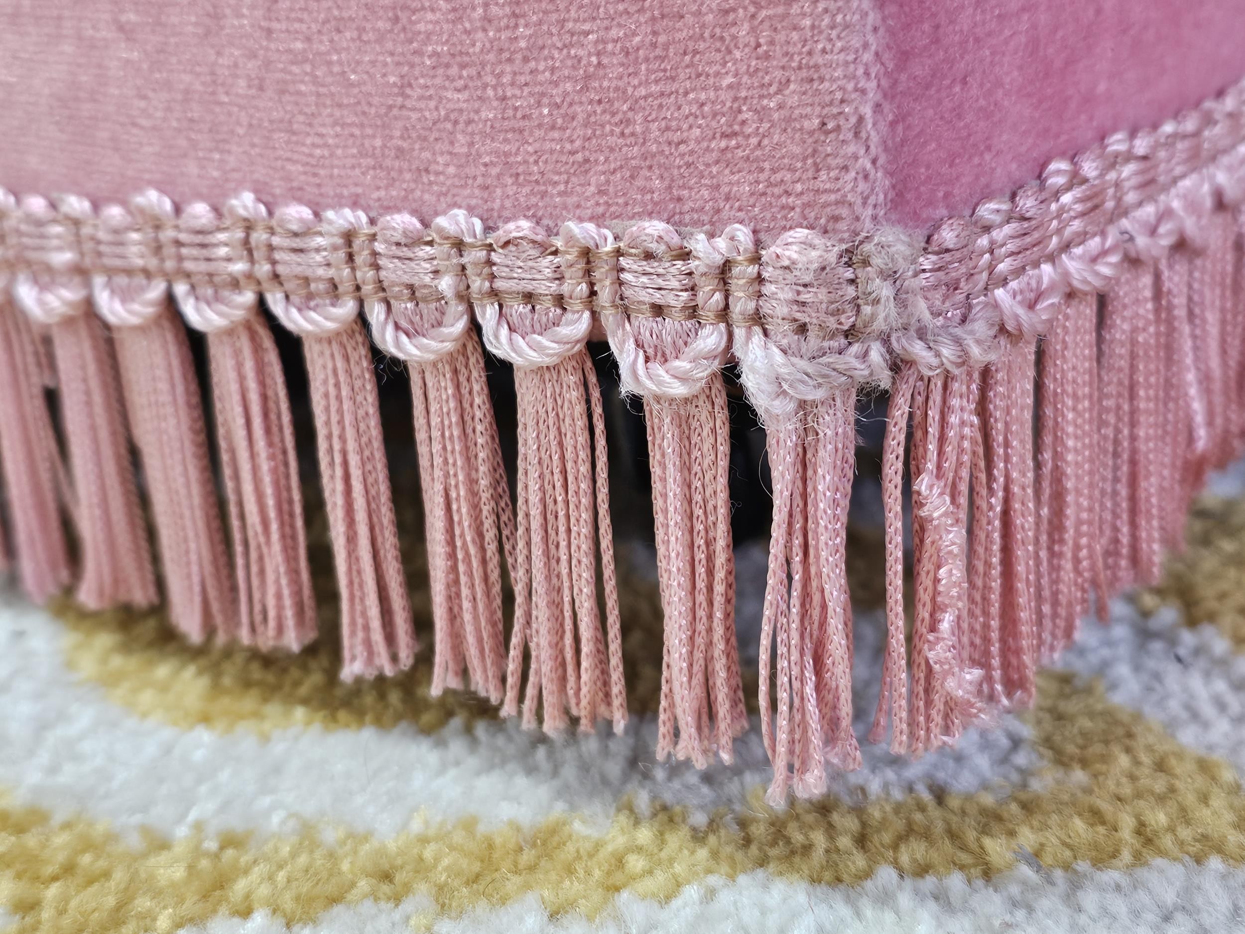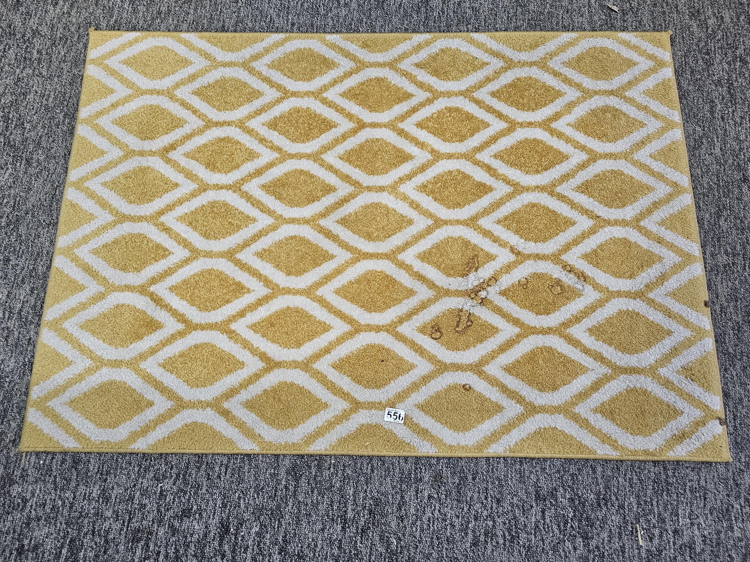 A good quality The Saxon Collection Friese rug in yell with a geometric design in good order with no rips or tares along with a vintage pink ottoman / blanket box in good order with a plush pink top with button design opens to a lined interior with a quantity of coat hangers inside, stands on four castors, has a height of 50cm a length of 94cm and a depth of 47cm