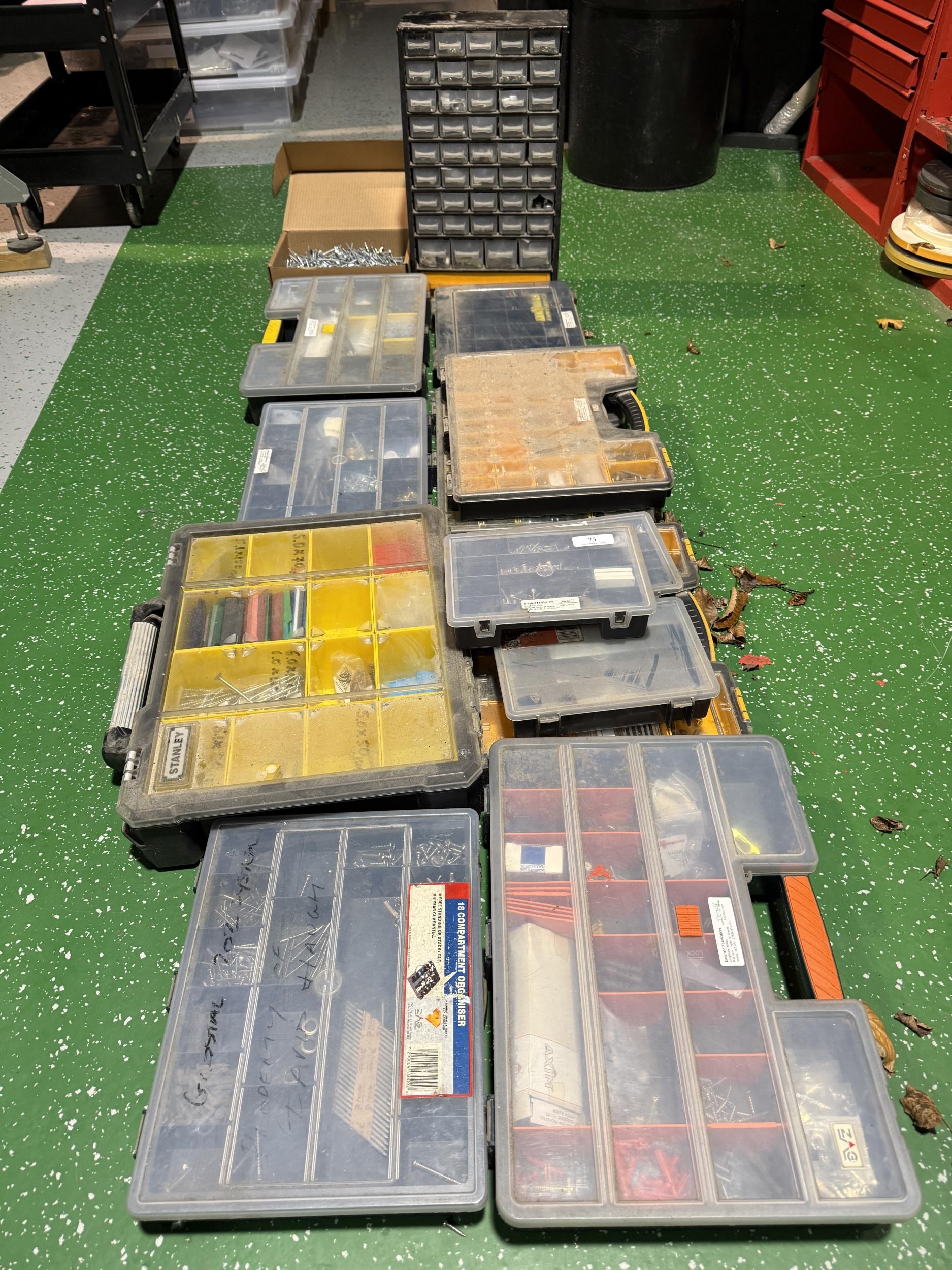 A quantity of compartment boxes and a flight of drawers containing fixings, fastenings and consumables