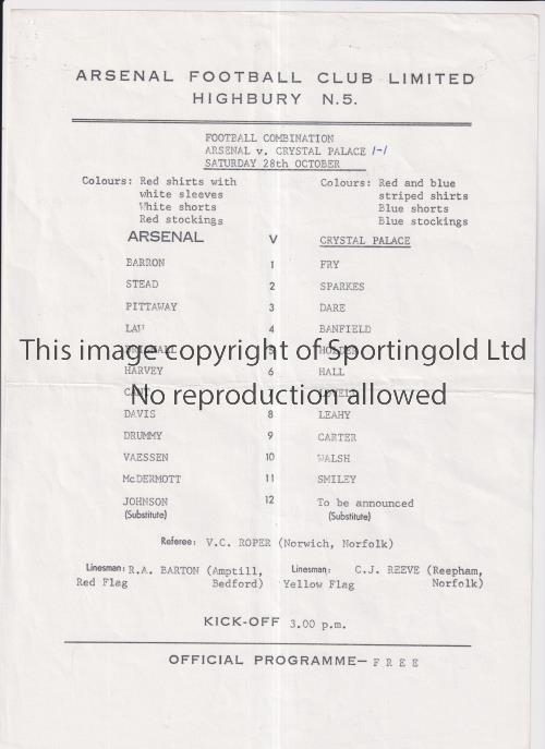 ARSENAL Ten home single sheet programmes for Reserve and Youth Team matches v Crystal Palace 28/10/1978, scores entered, QPR 11/2/1984, 6/2/1988 and 20/10/1990, Wimbledon 10/9/1988, WBA 30/10/1990 SJFC, Watford 9/12/1991 Youth Cup, Gillingham, West Ham United and Swindon Town all 96/7 SJFC. Generally good