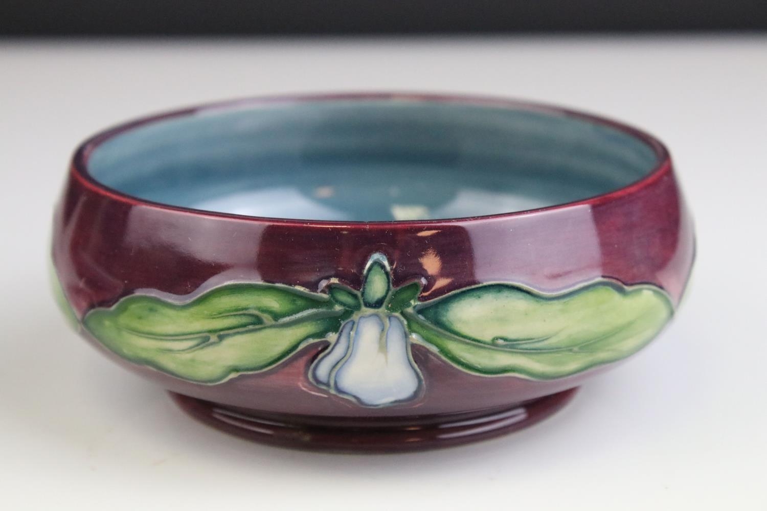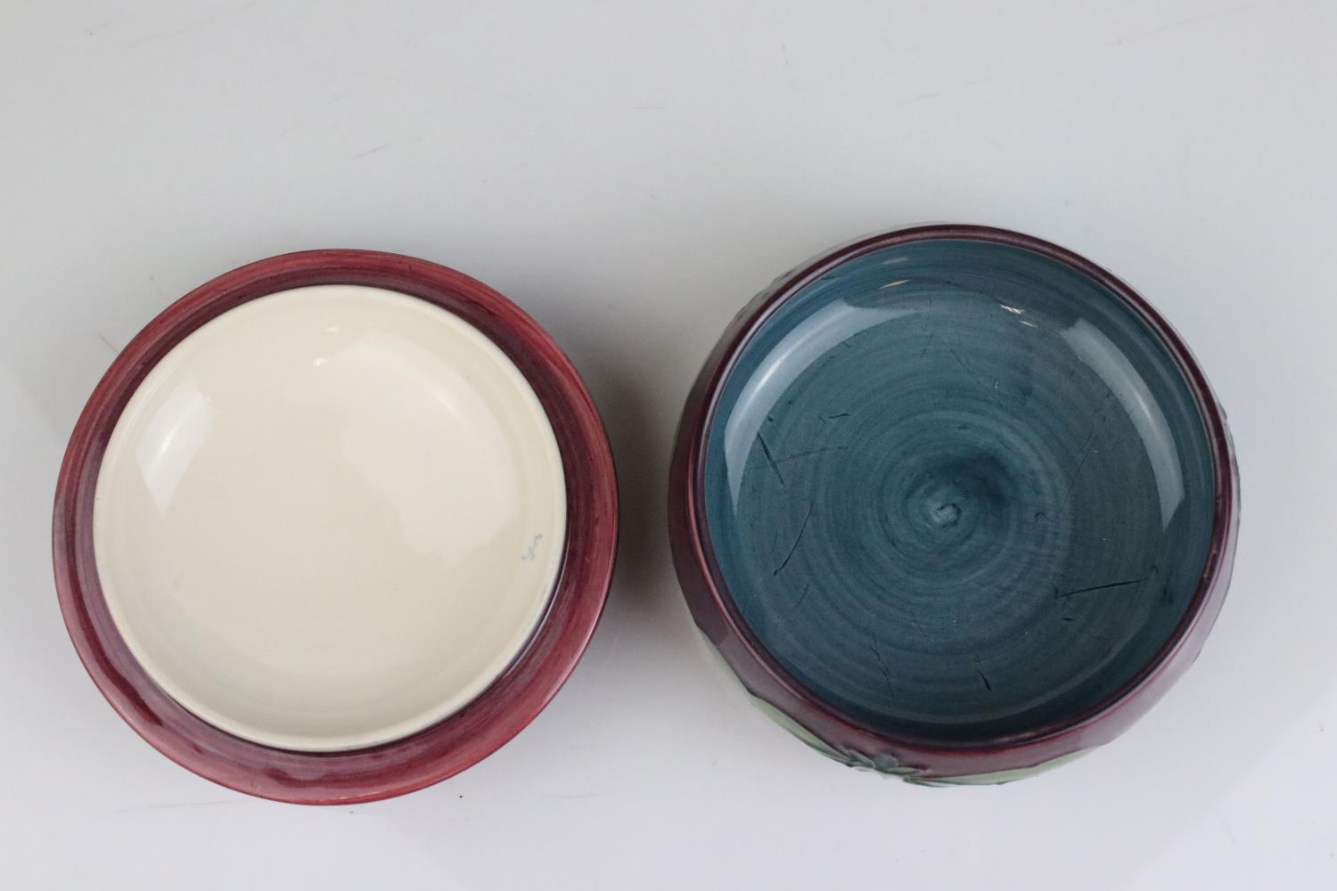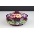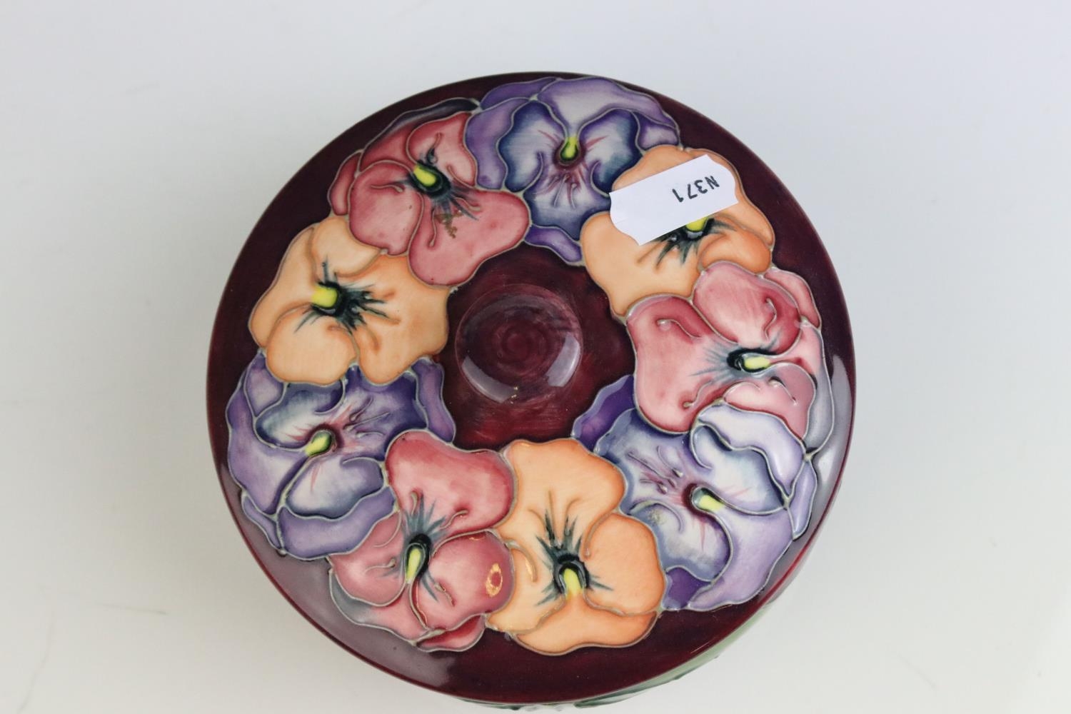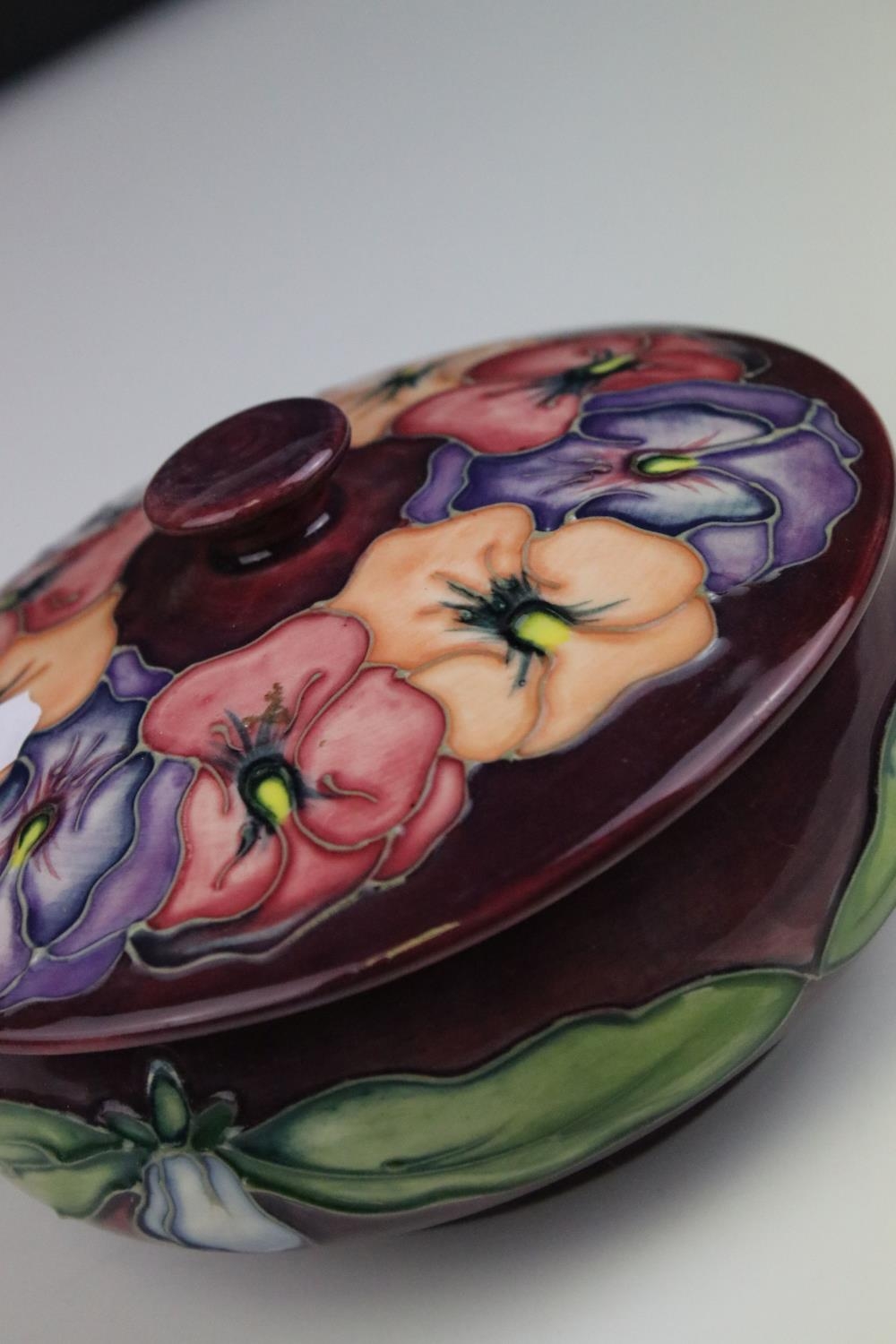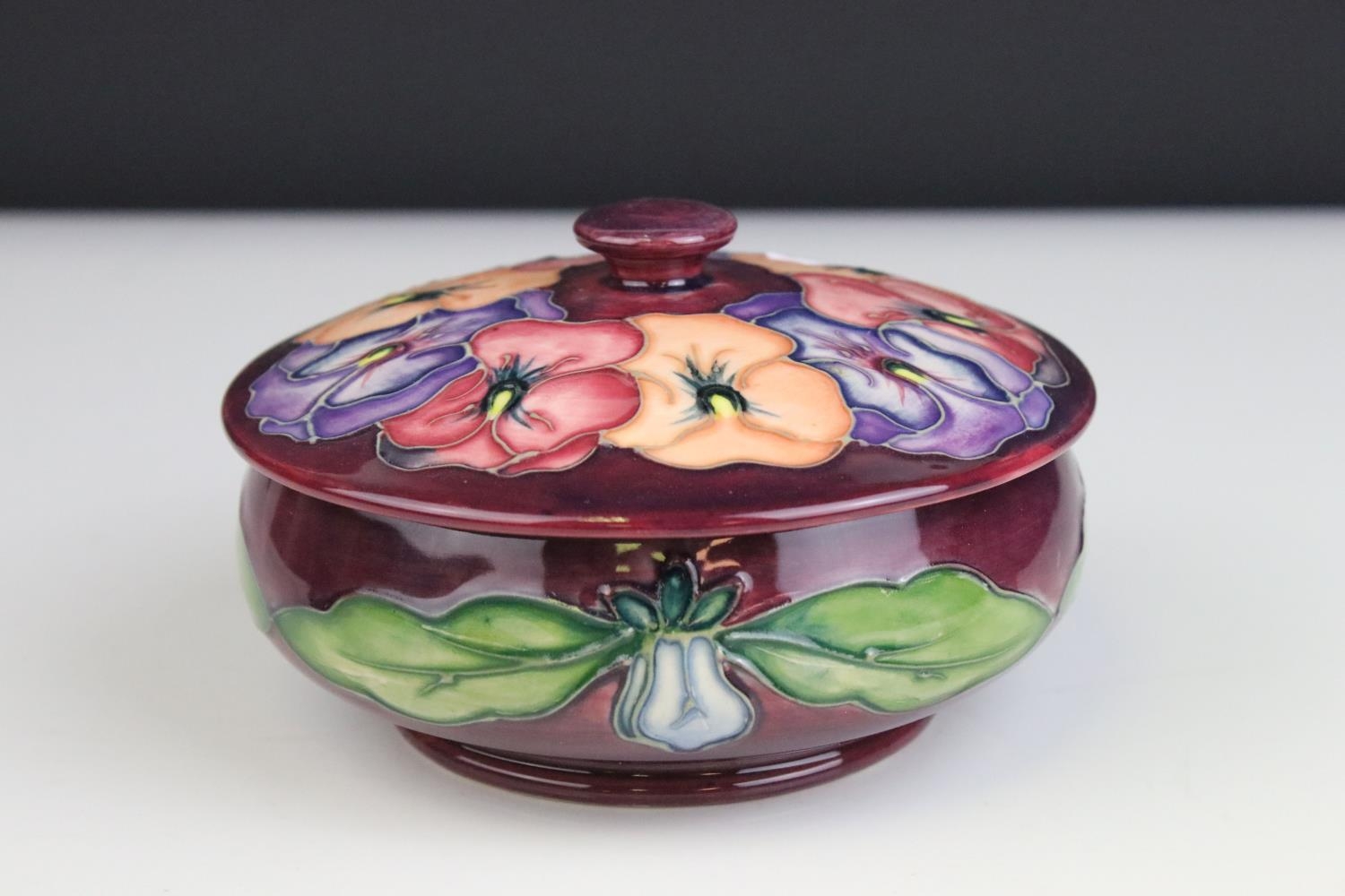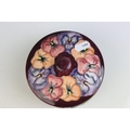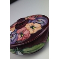 Moorcroft Tube Lined Lidded Jar with Pansy decoration, impressed blue marks to base, 12cms high