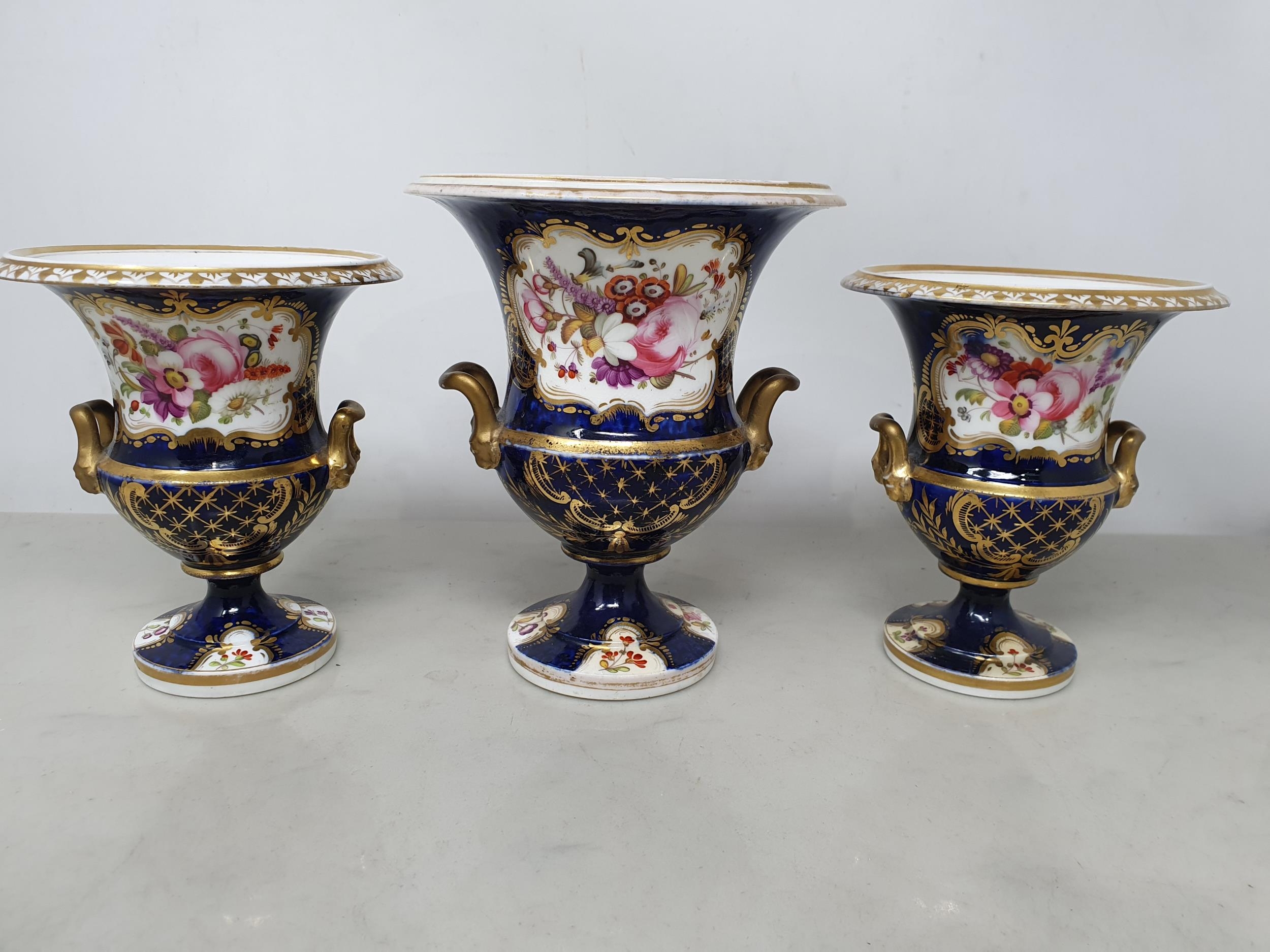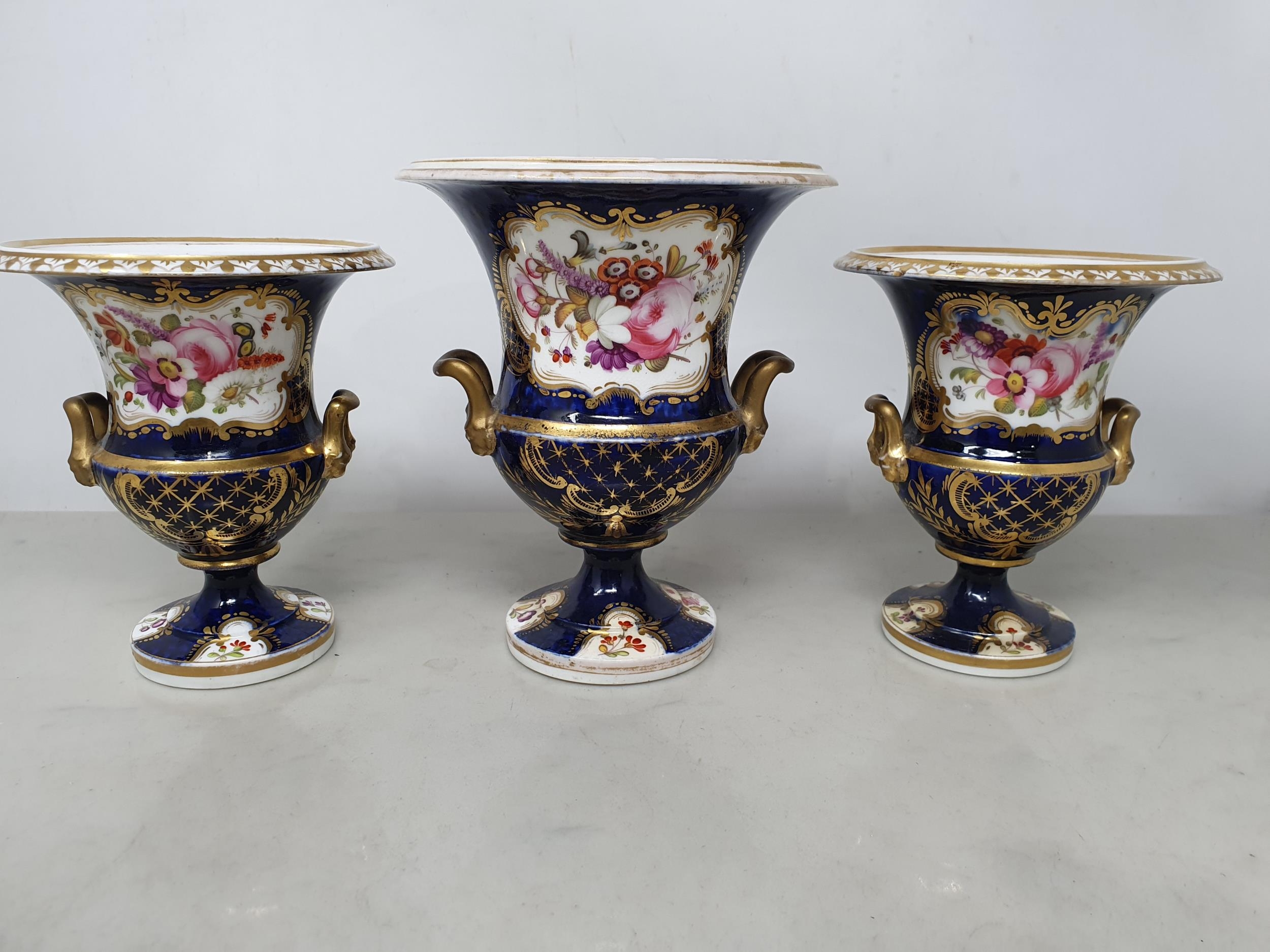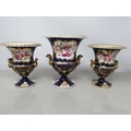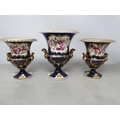 A Garniture of three Coalport two handled Vases painted bouquets of flowers with blue and gilt surrounds, 5-6in, A/F