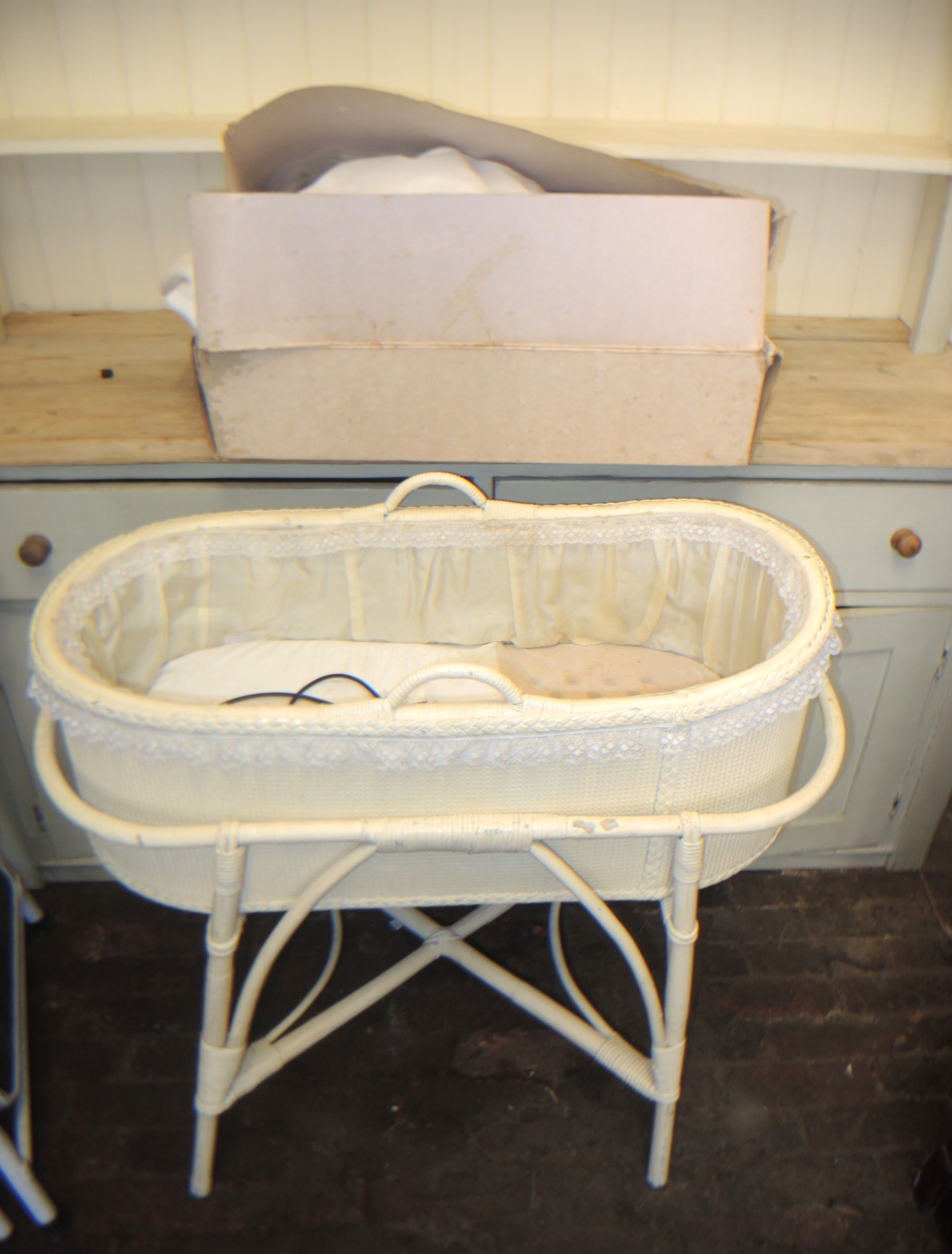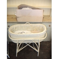 1960s White painted Lloyd Loom style doll's cot on stand, together with a 1960s white wedding dress in original box