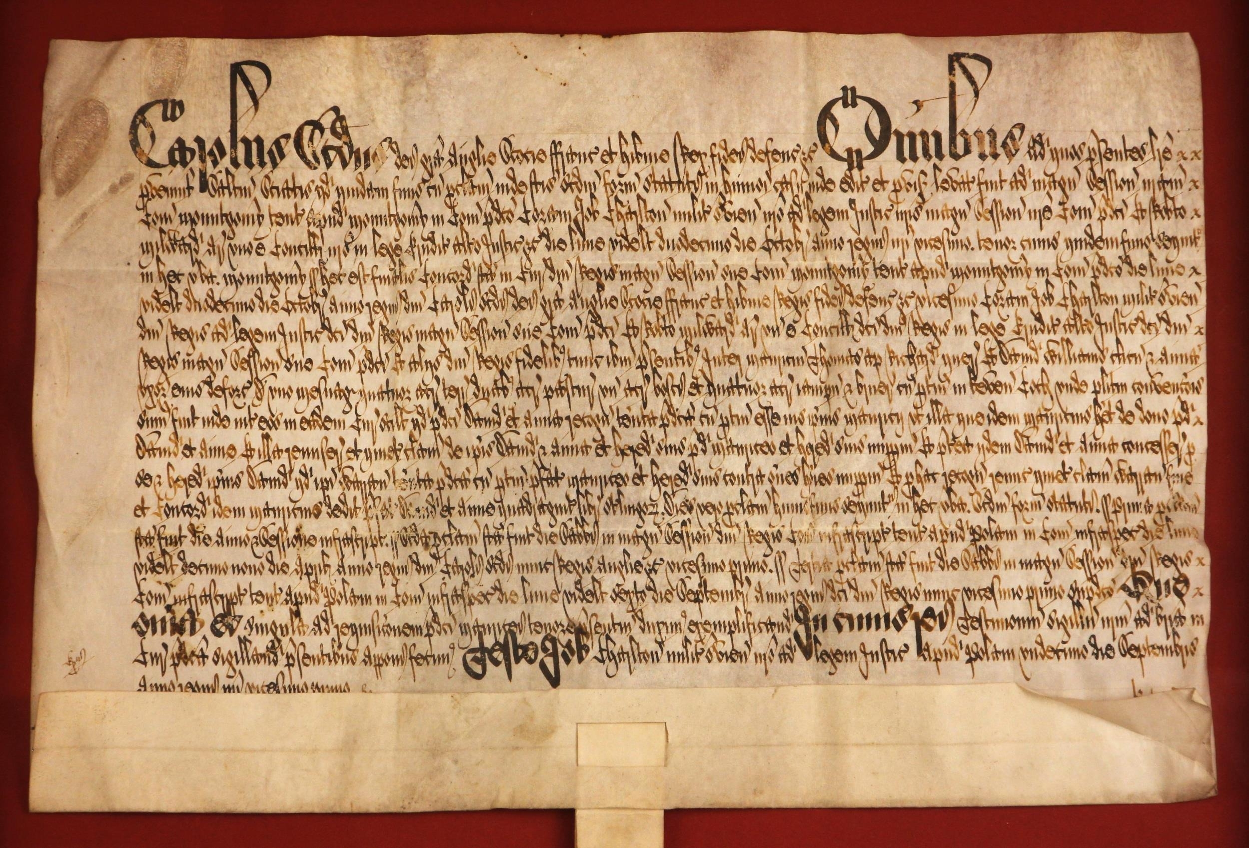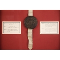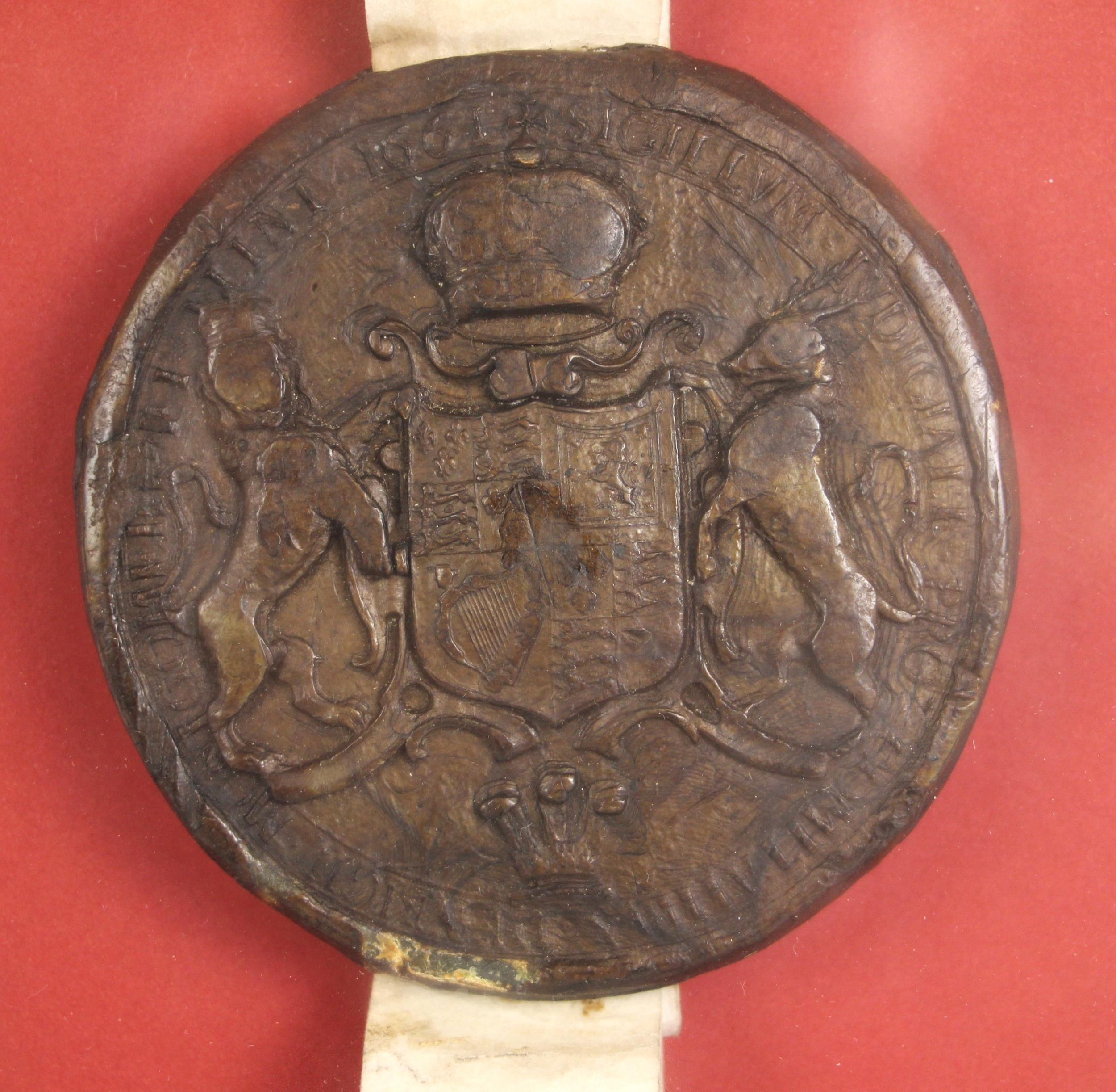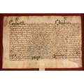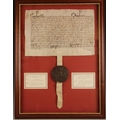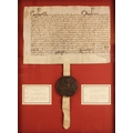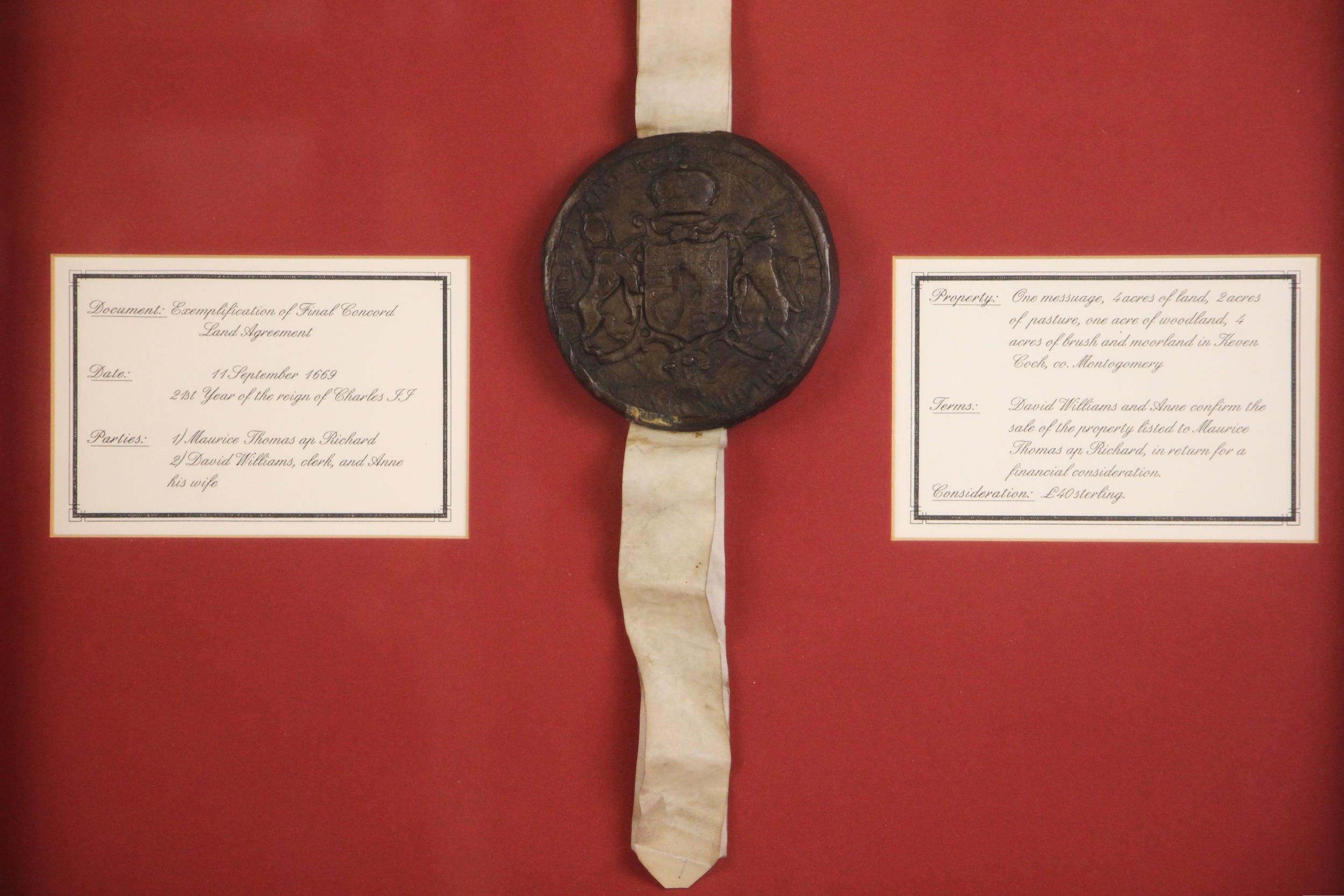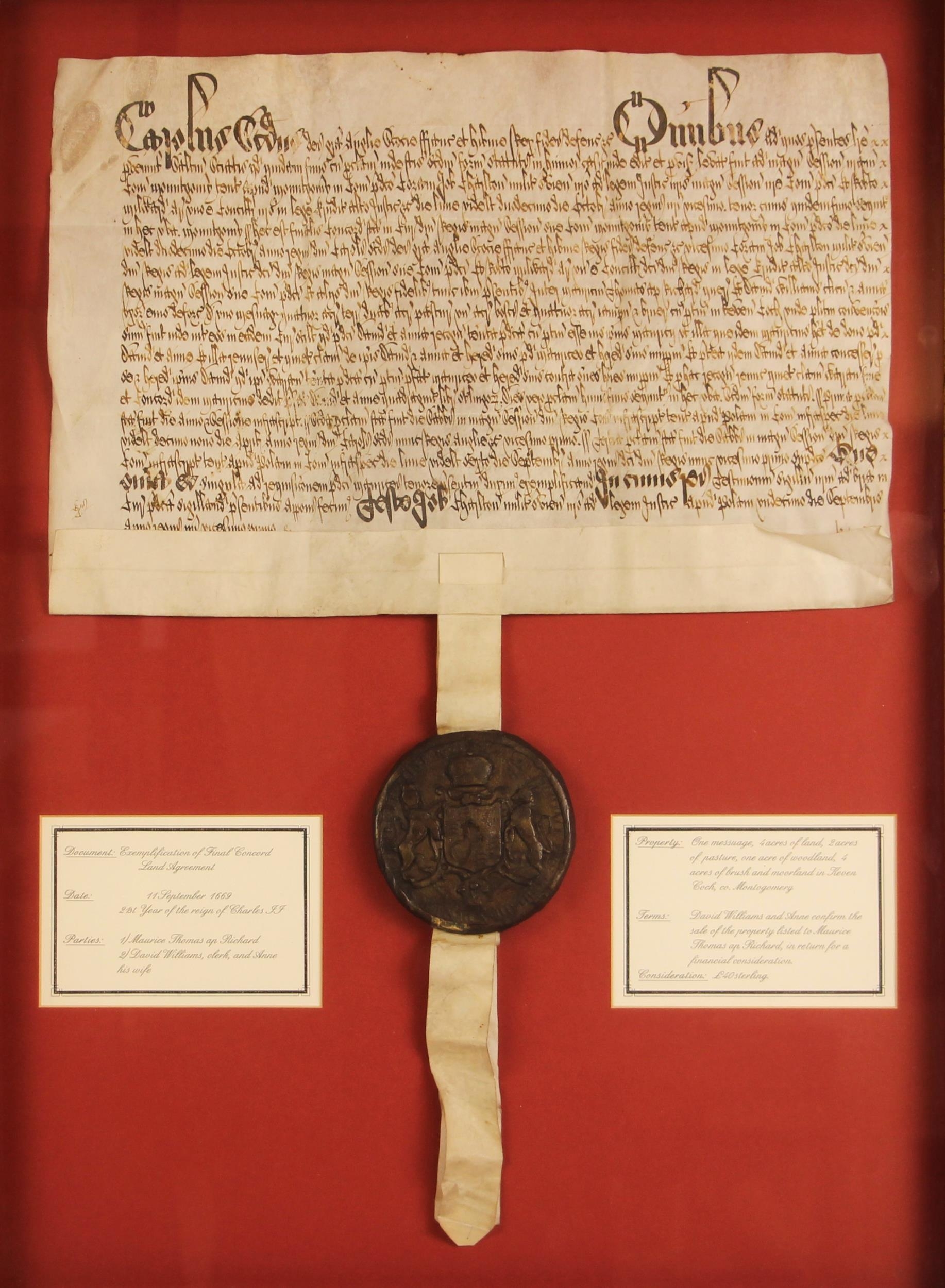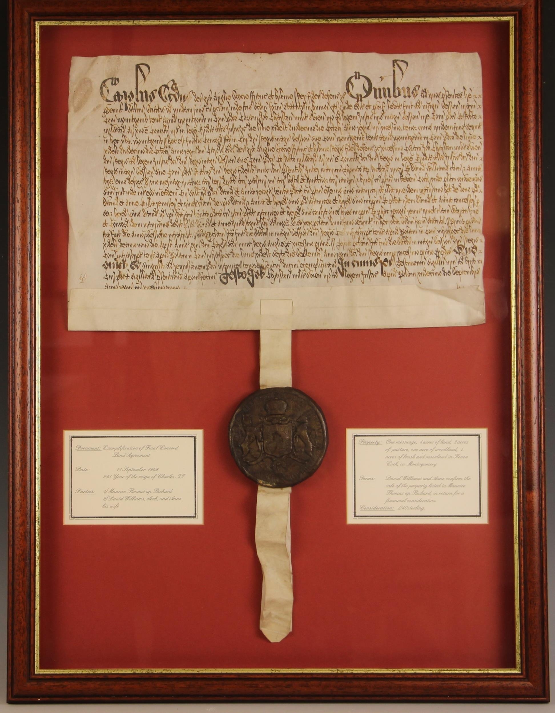 A Charles II indenture between Maurice Thomas ap Richard and David and Anne Williams in respect of the sale of land in Keven Coch, Montgomery for the consideration of £40 sterling, dated 11th September 1669 and bound with a wax seal, box framed and glazed, 67.5cm x 51cm overall
