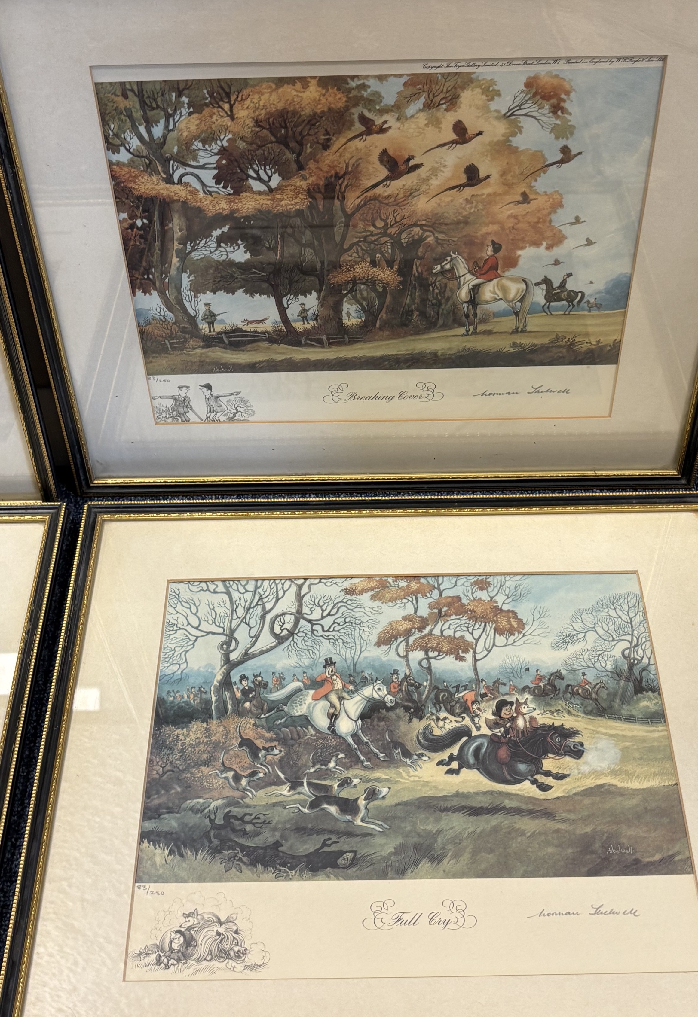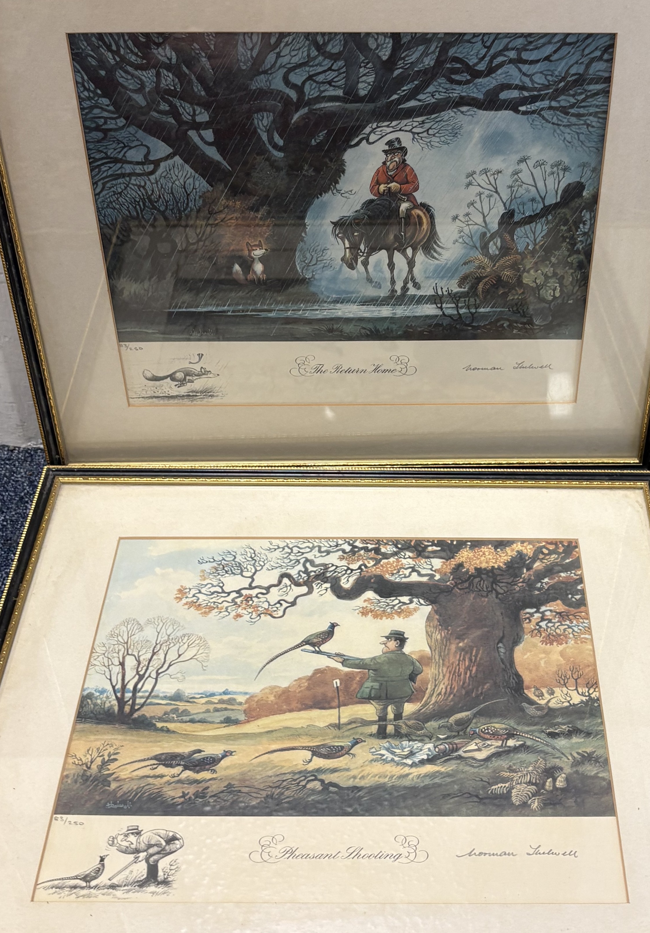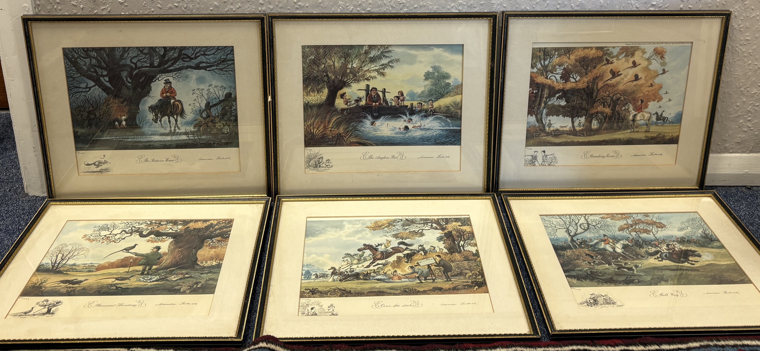 NORMAN THELWELL: (British, 1923 - 2004): A selection of six framed and glazed limited edition prints entitle 'Full Cry' (number 83 / 250), 'Over the Sticks' (numbered 83 / 250), 'Breaking Cover' (numbered 83 / 250), 'The Angler's Pool' (number 83 / 250), 'Pheasant Shooting (numbered 83 / 250), and 'The Return Home' (numbered 83 / 250). Pencil signed to bottom right. Approx. 30 cm x 25 cm (ss). Est. £60 - £80.