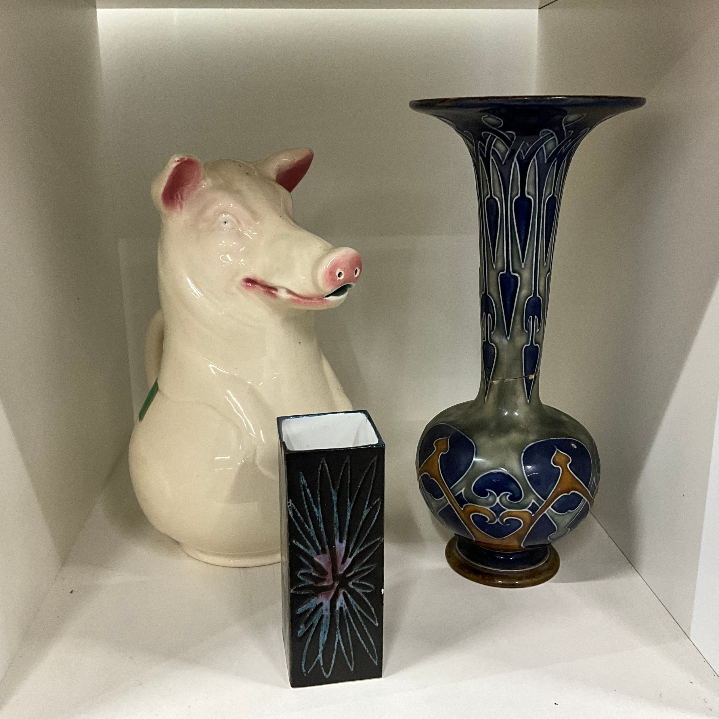 A Royal Doulton vase, a Troika vase and a pig jug.