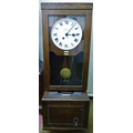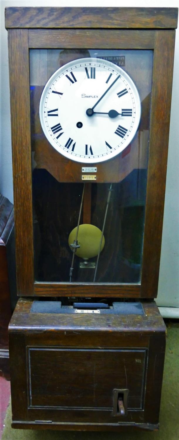 A Simplex oak cased clocking in clock, numbered 75915, with gilt lettering to the sides; 'Gledhill Brook' 115cm high