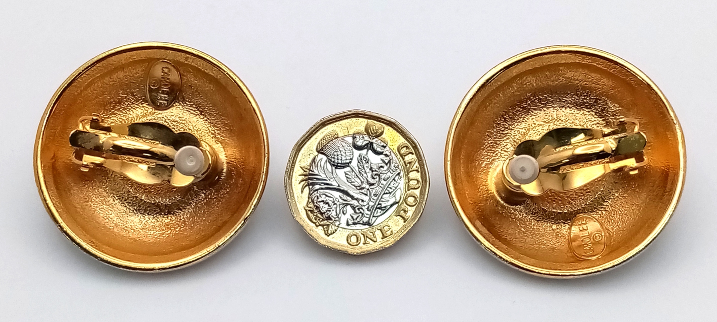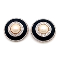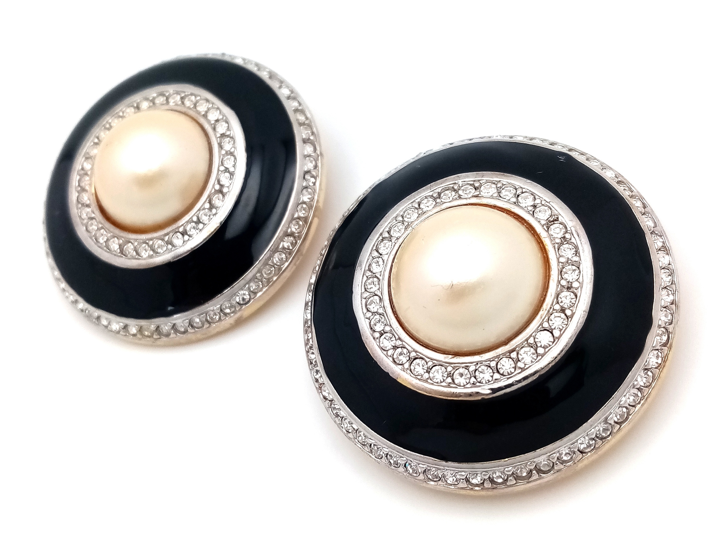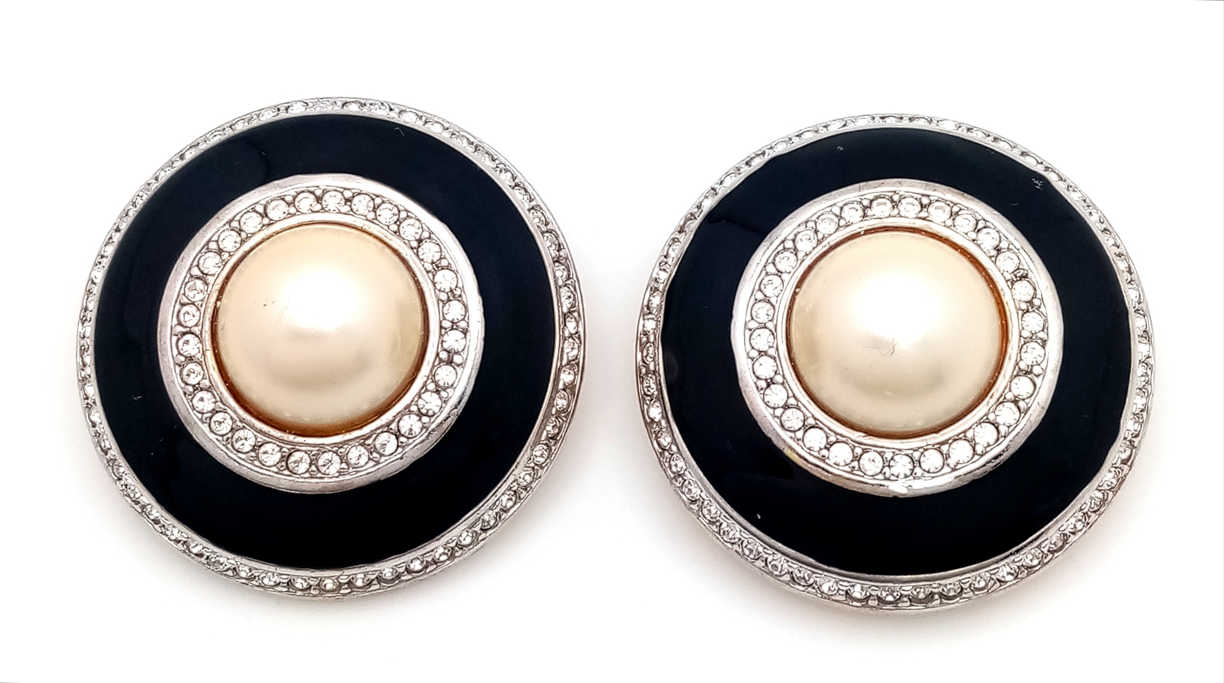 A vintage 1990s pair of designer Carolee black Faux Pearl, stone set and black enamelled circular gilded clip earrings. New old stock. Diameter 4.1cm.
