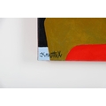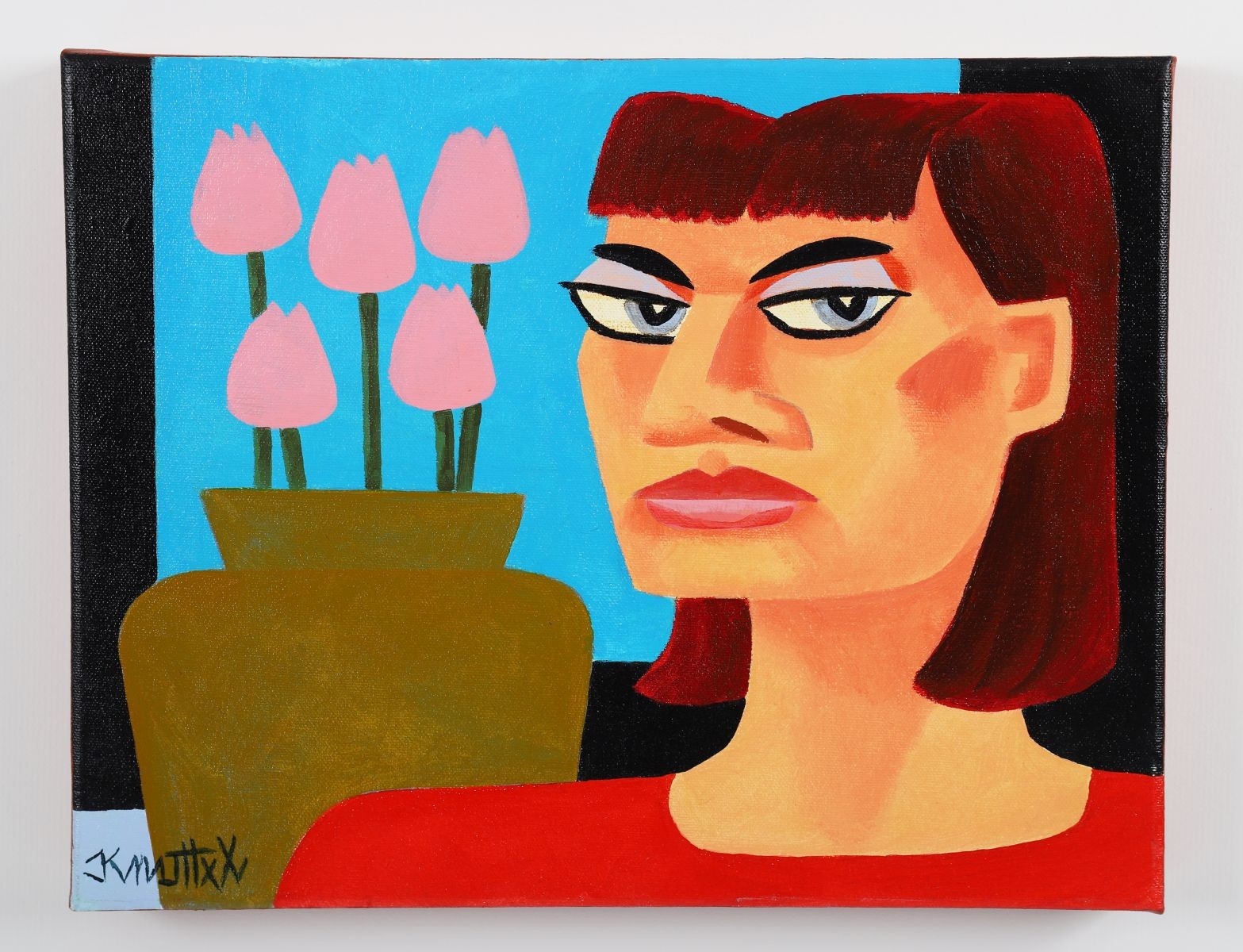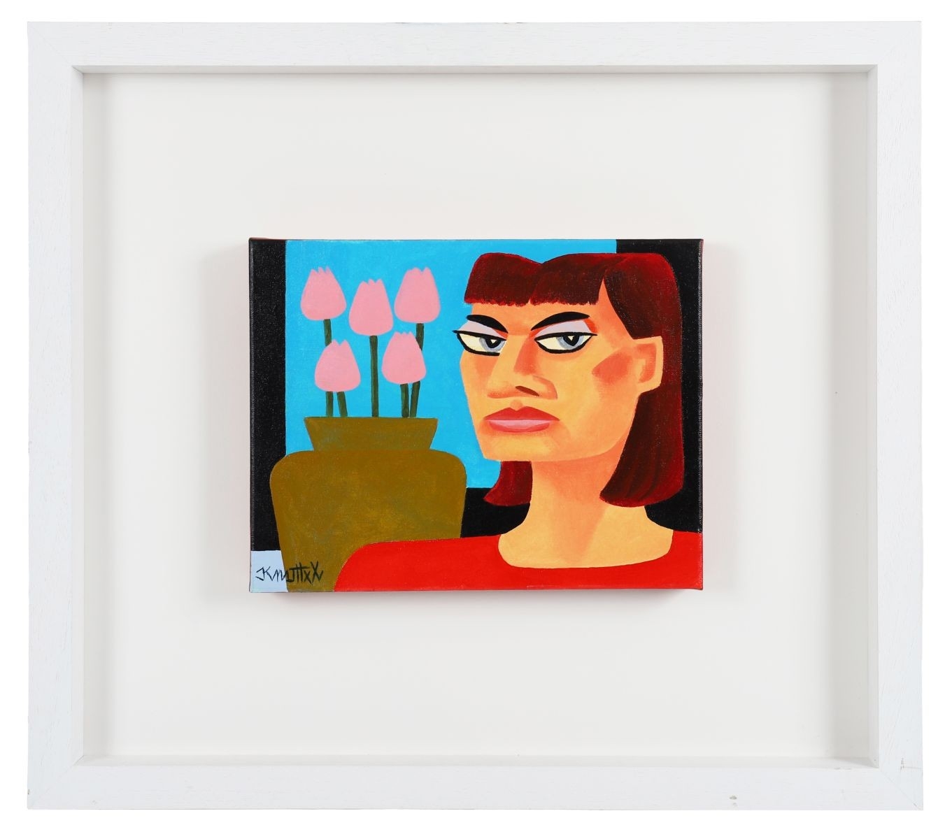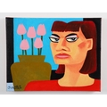 A striking oil on canvas depicting a stylised female figure before a bold arrangement of pink tulips set against a vivid sky-blue background. Knuttel’s distinctive graphic handling, saturated colour blocks, and exaggerated facial features give the work an iconic, contemporary presence. Signed bottom left. Image size: 27.5 x 35.5 cm.; framed: 62 x 69.5 cm. PICTURES AND PRINTS Thursday 11th December 2025 18:26:08