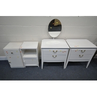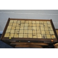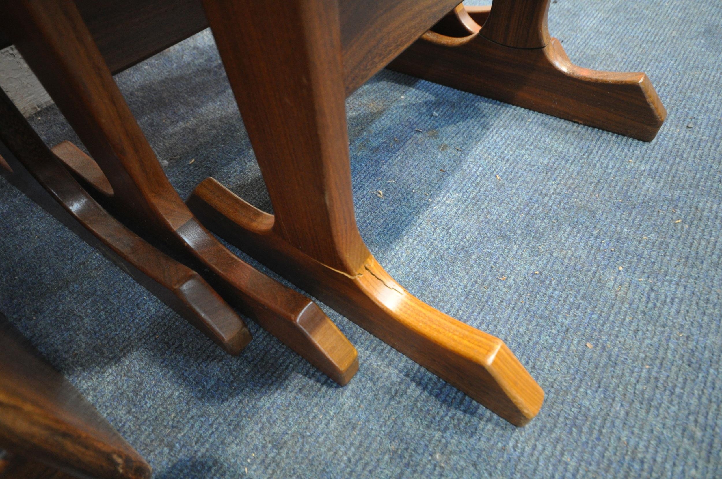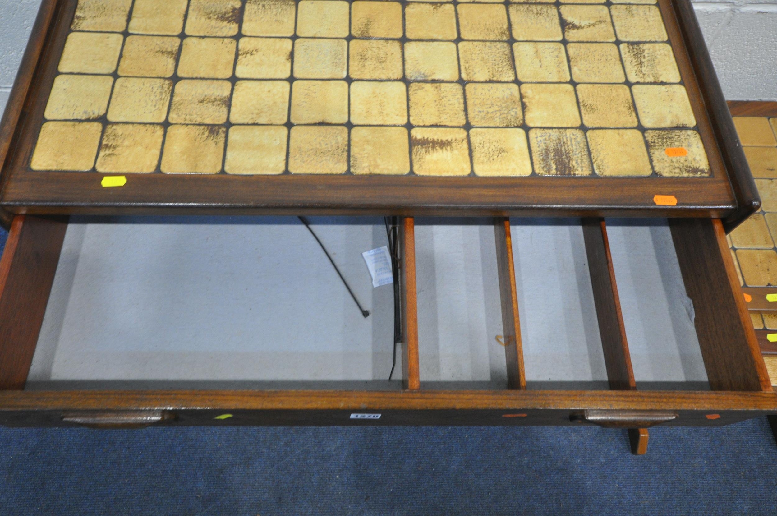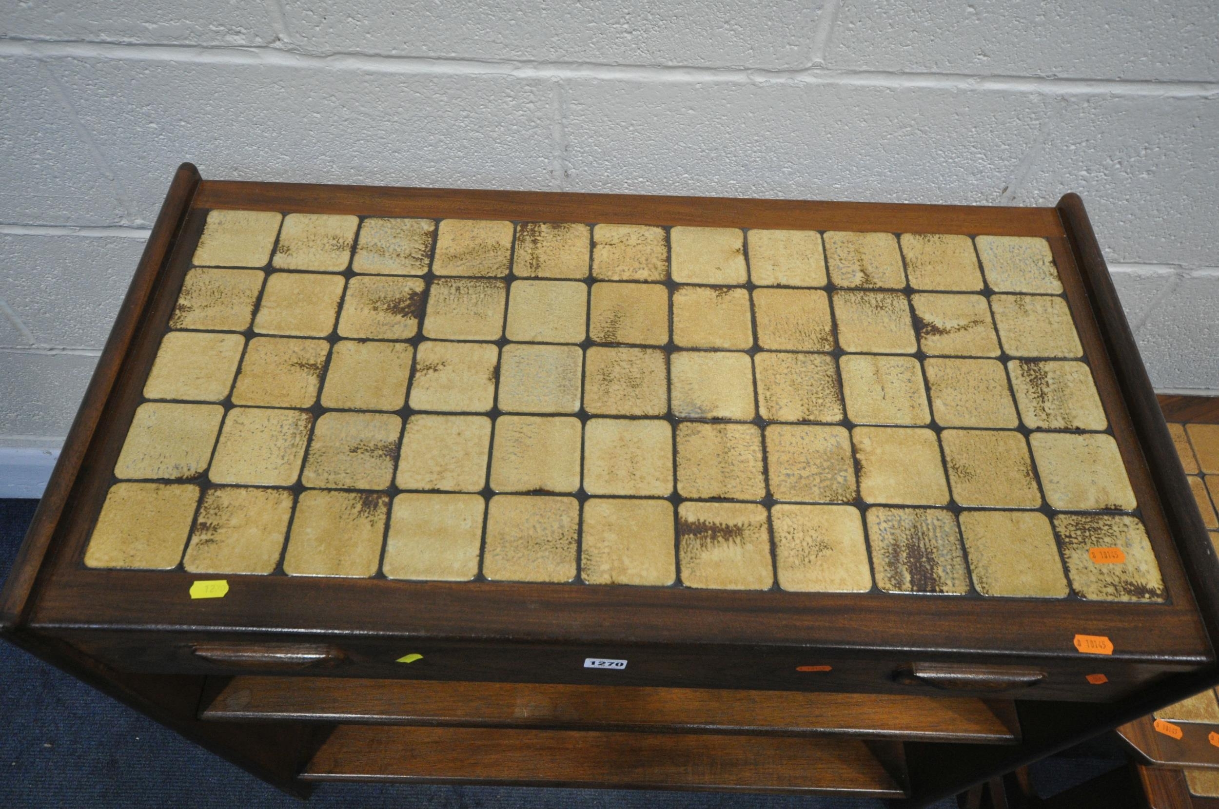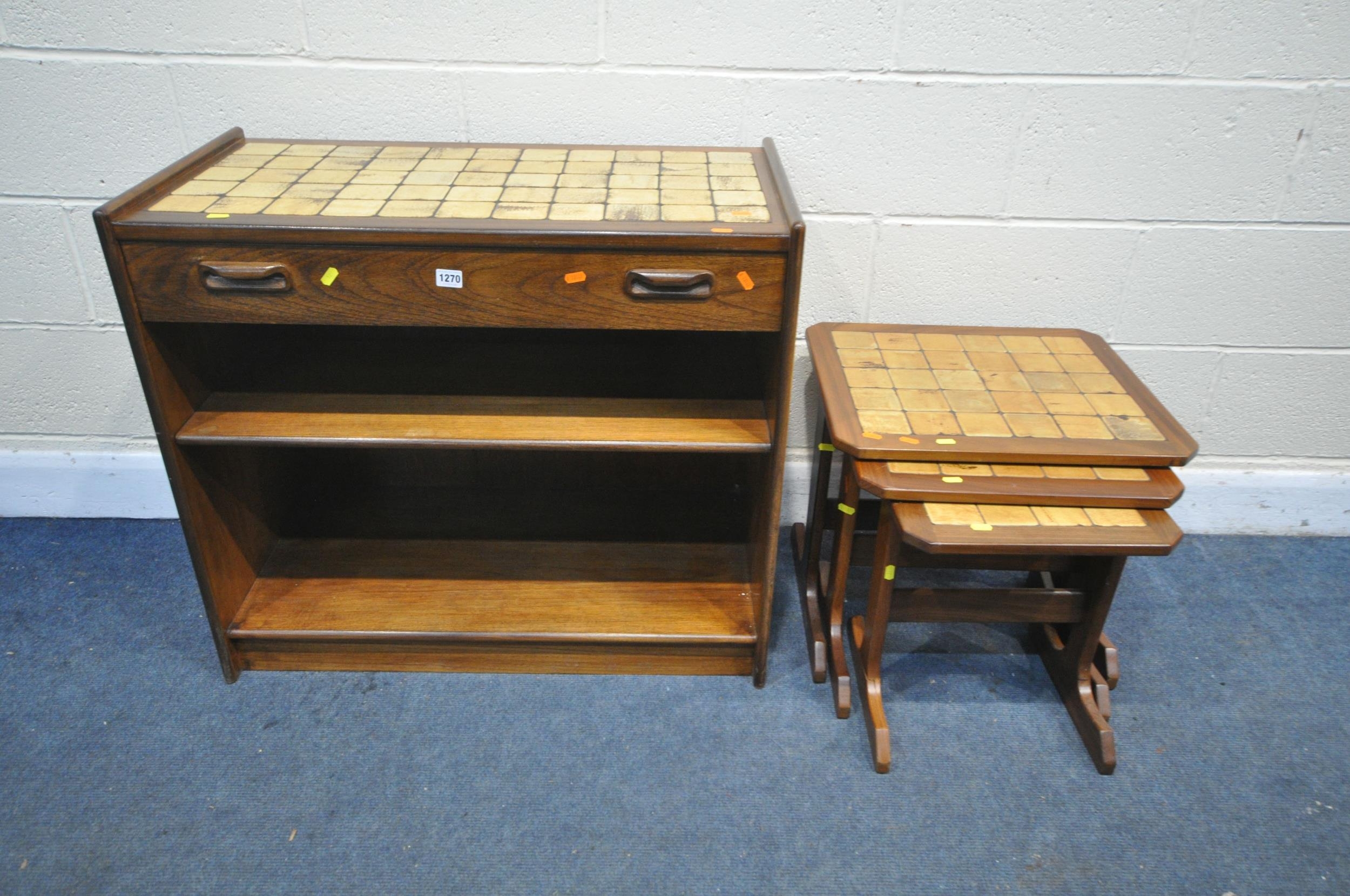 A MID CENTURY G PLAN TILE TOP OPEN BOOKCASE, with a single drawer, width 85cm x depth 45cm x height 76cm, along with a G plan tile top nest of three tables, largest table width 51cm x depth 44cm x height 45cm (condition - split to smallest table leg) (2)