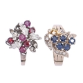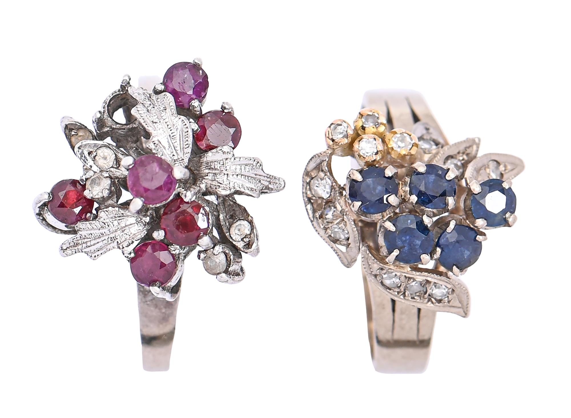 A sapphire and diamond ring and a ruby and diamond ring, both in white gold, one marked 14k 585, 9.3g, size N and R