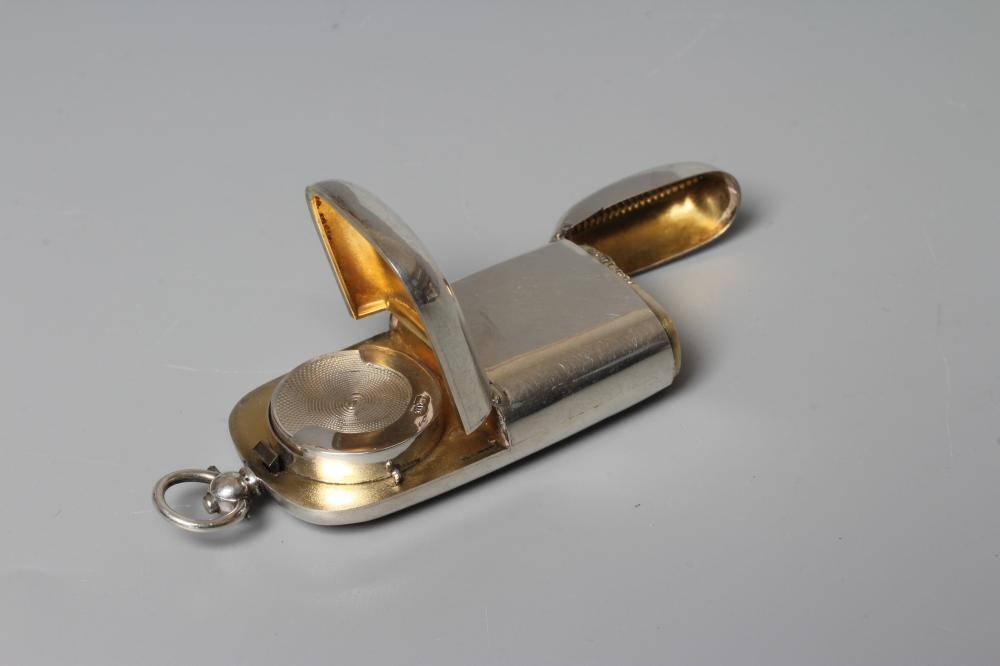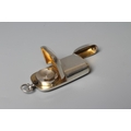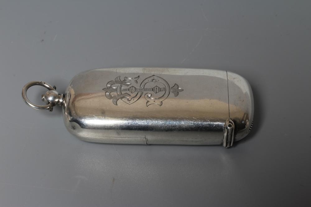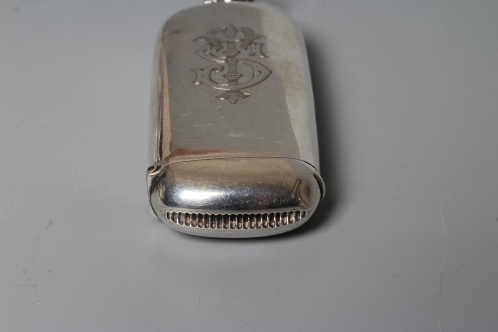 A LATE VICTORIAN SILVER VESTA AND COMBINED SOVEREIGN HOLDER, maker's mark JMM, Birmingham 1894, of plain D end form with hanging loop, 2 1/2" long excluding loop