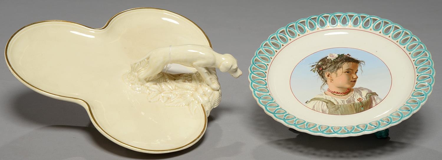 A WEDGWOOD QUEENSWARE DESSERT STAND C1870, PAINTED WITH THE HEAD OF AN ITALIAN PEASANT GIRL, IN PIERCED TURQUOISE BORDER, 22.5CM DIAM, IMPRESSED MARKS AND A WEDGWOOD HOUND HANDLED QUEENSWARE TREFOIL DISH, IMRESSED MARK AND DATE CODE, 1879 (2)