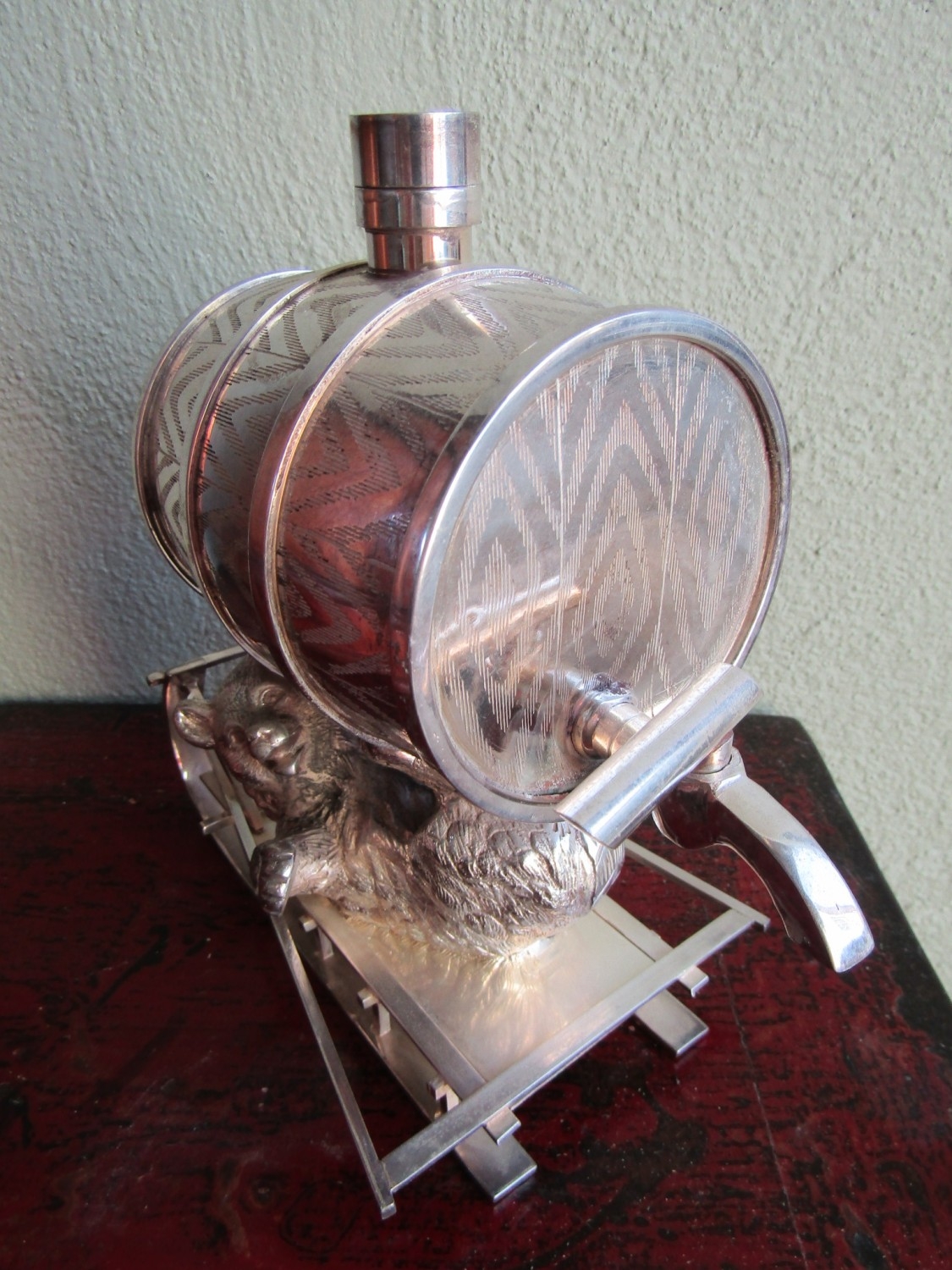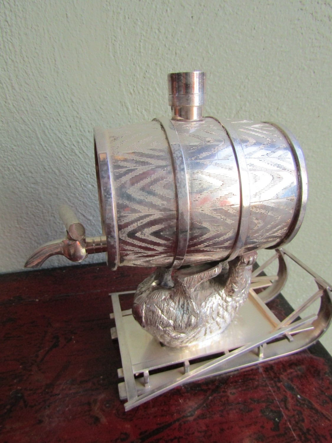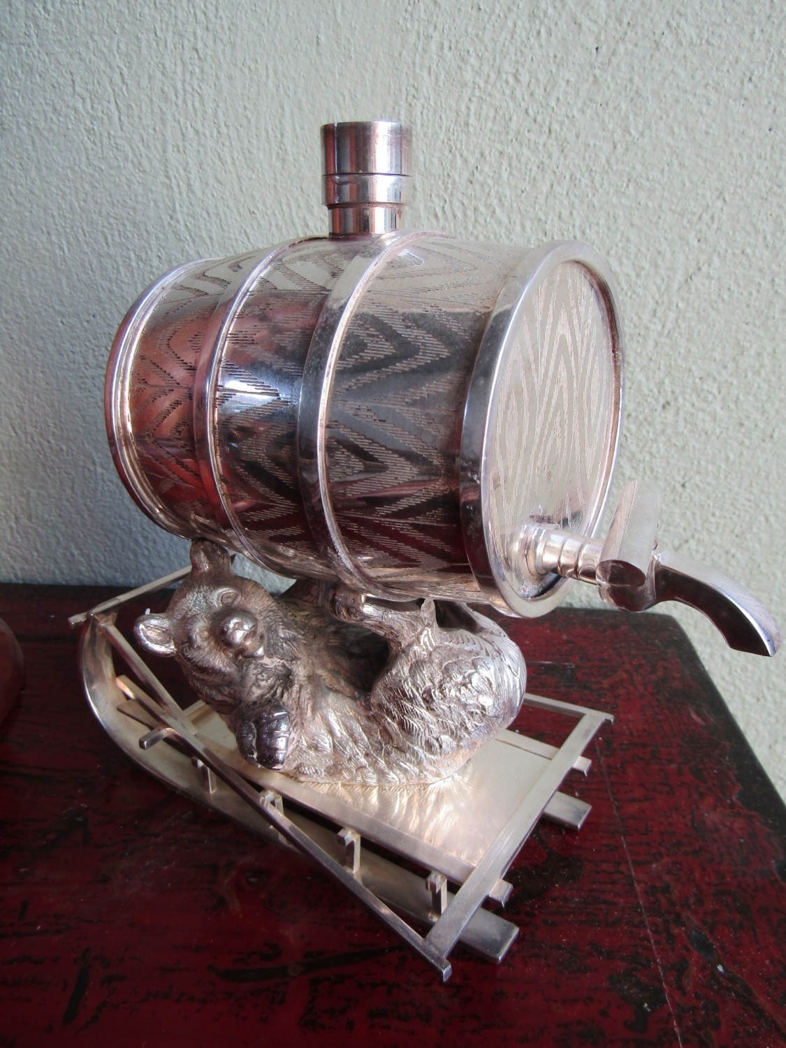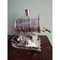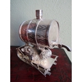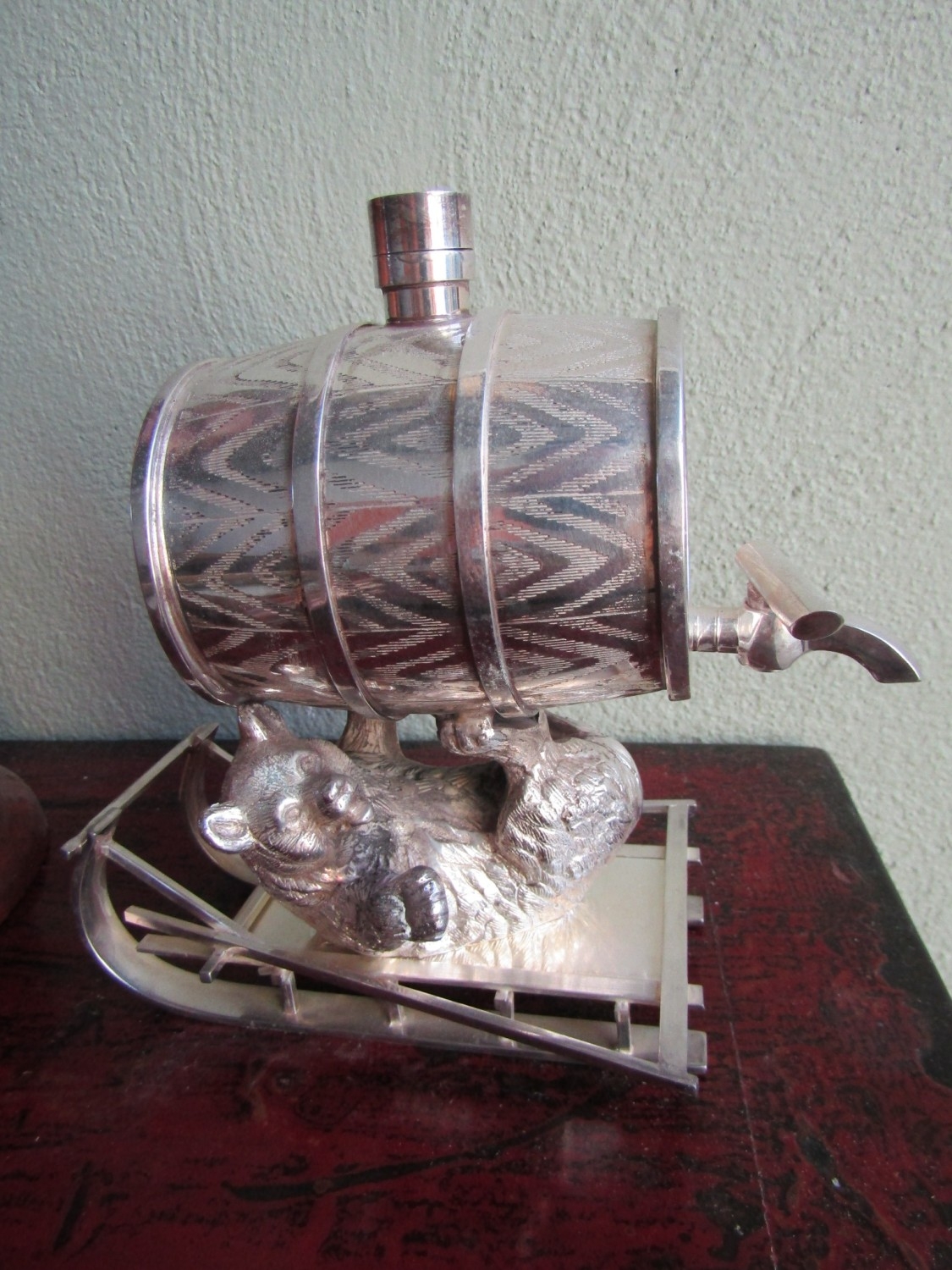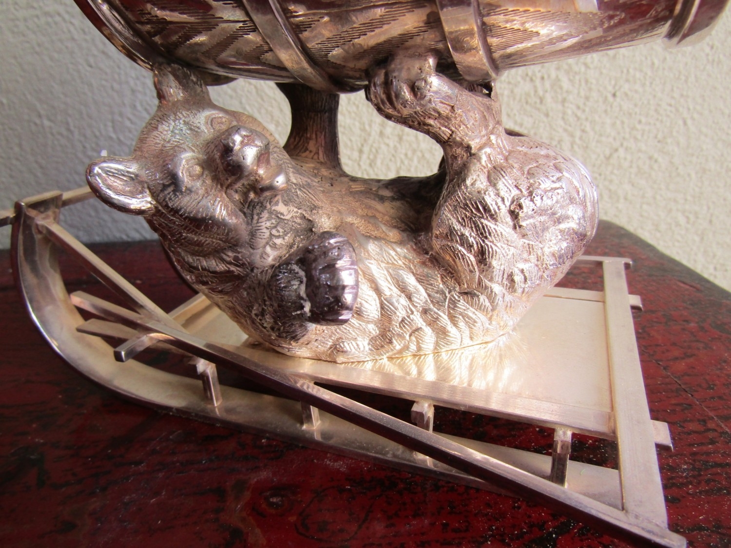 Silver Plated Spirit Barrell with Bear Motif Support on Sled Attractively Detailed Approximately 9 Inches High x 6 Inches Wide