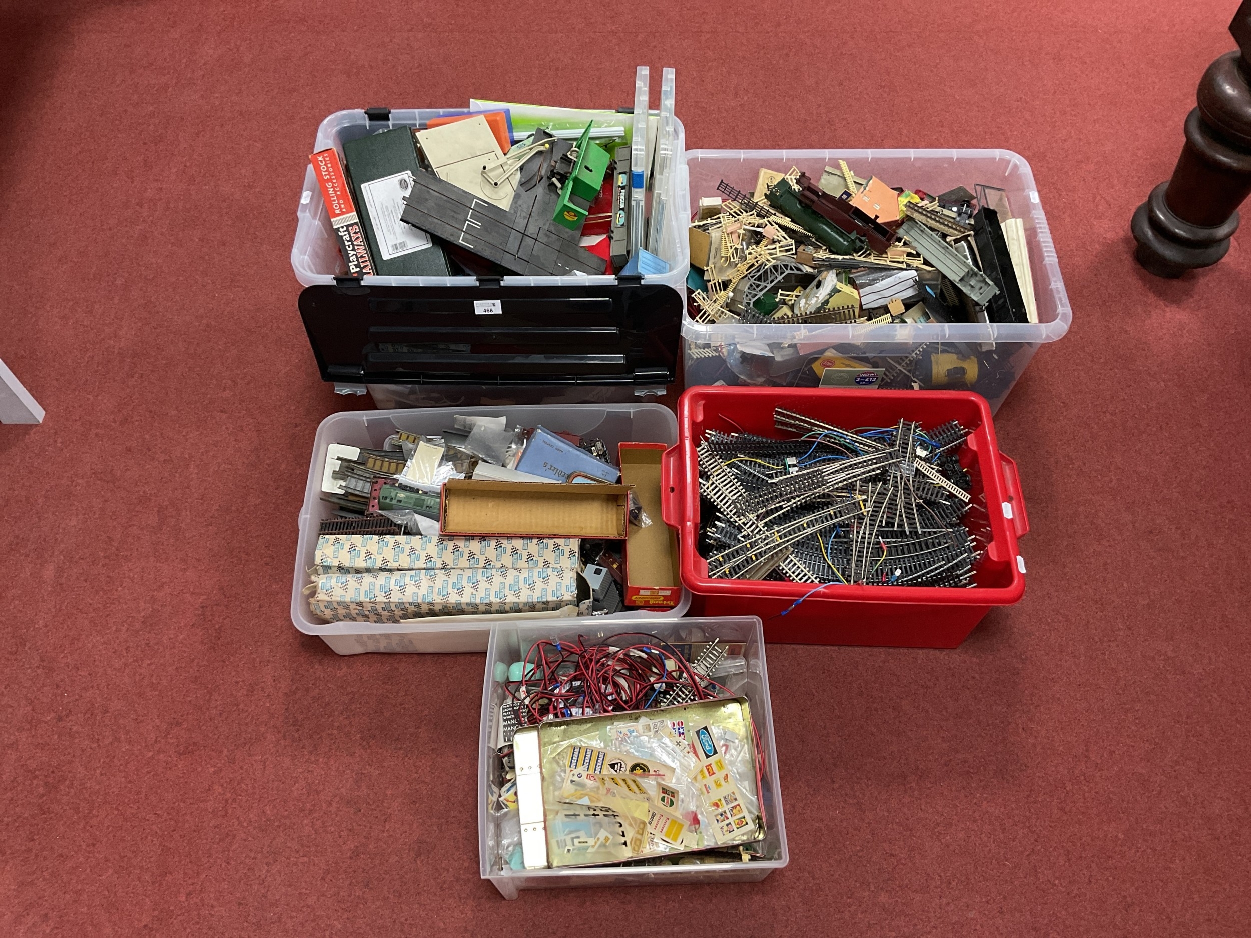 A Quantity of Predominantly OO/HO Gauge Model Railway Workshop Items to include Bodyshells, Track, Points, Signalling, Wire, Electrical Components, Lineside Accesories, etc. (Five Tubs).