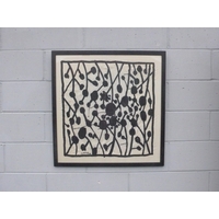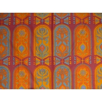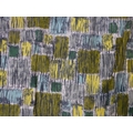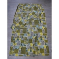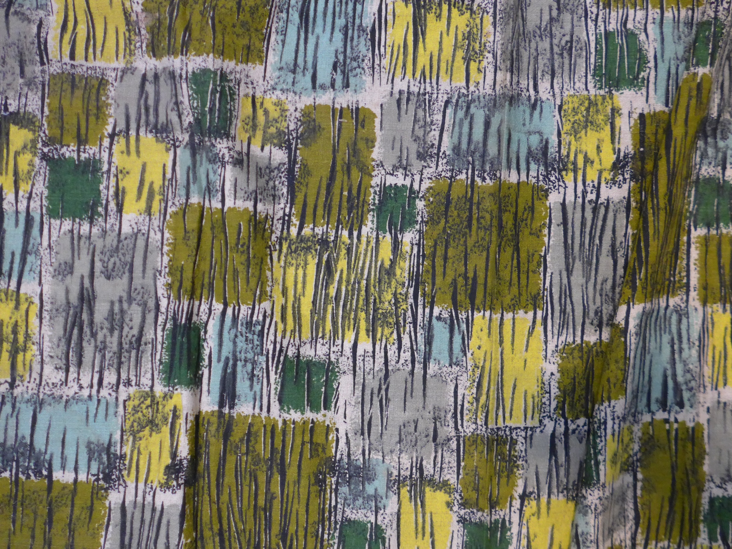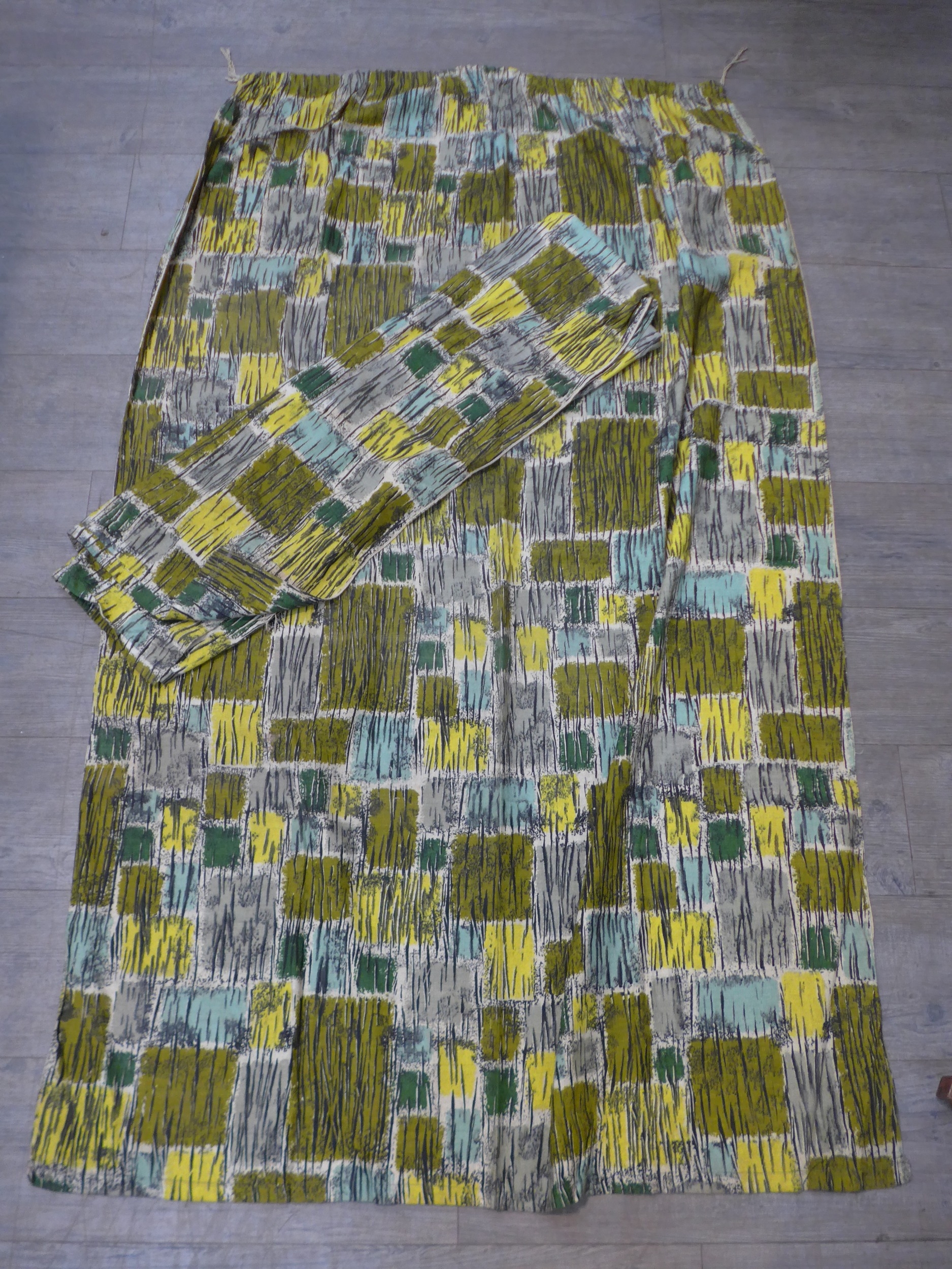 A pair of 1950's bark cloth curtain panels, green, blue, yellow and black block print design. Each panel 172cm drop x 110cm wide