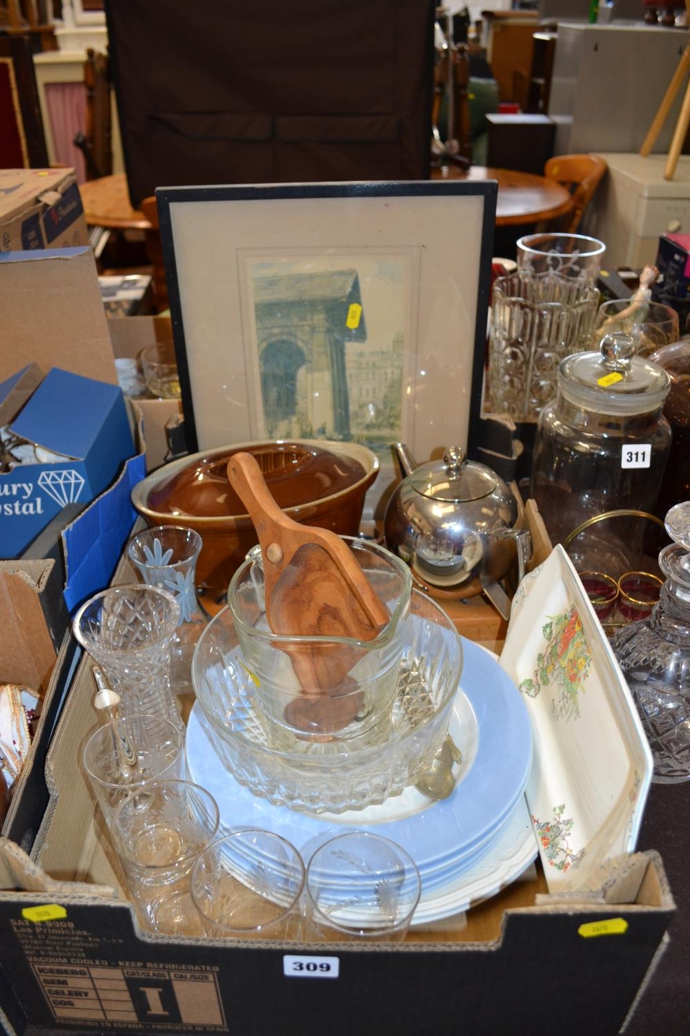 STAINLESS STEEL BUCKET TEAPOT, GLASSWARE DINNER PLATES , CUTLERY, ETC
