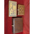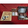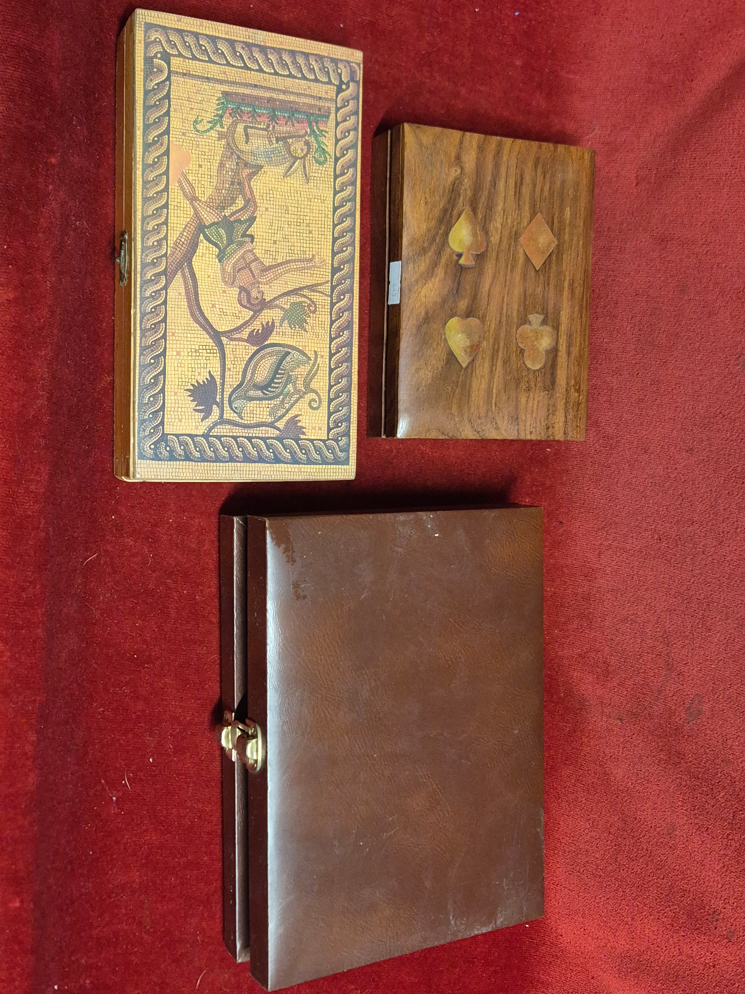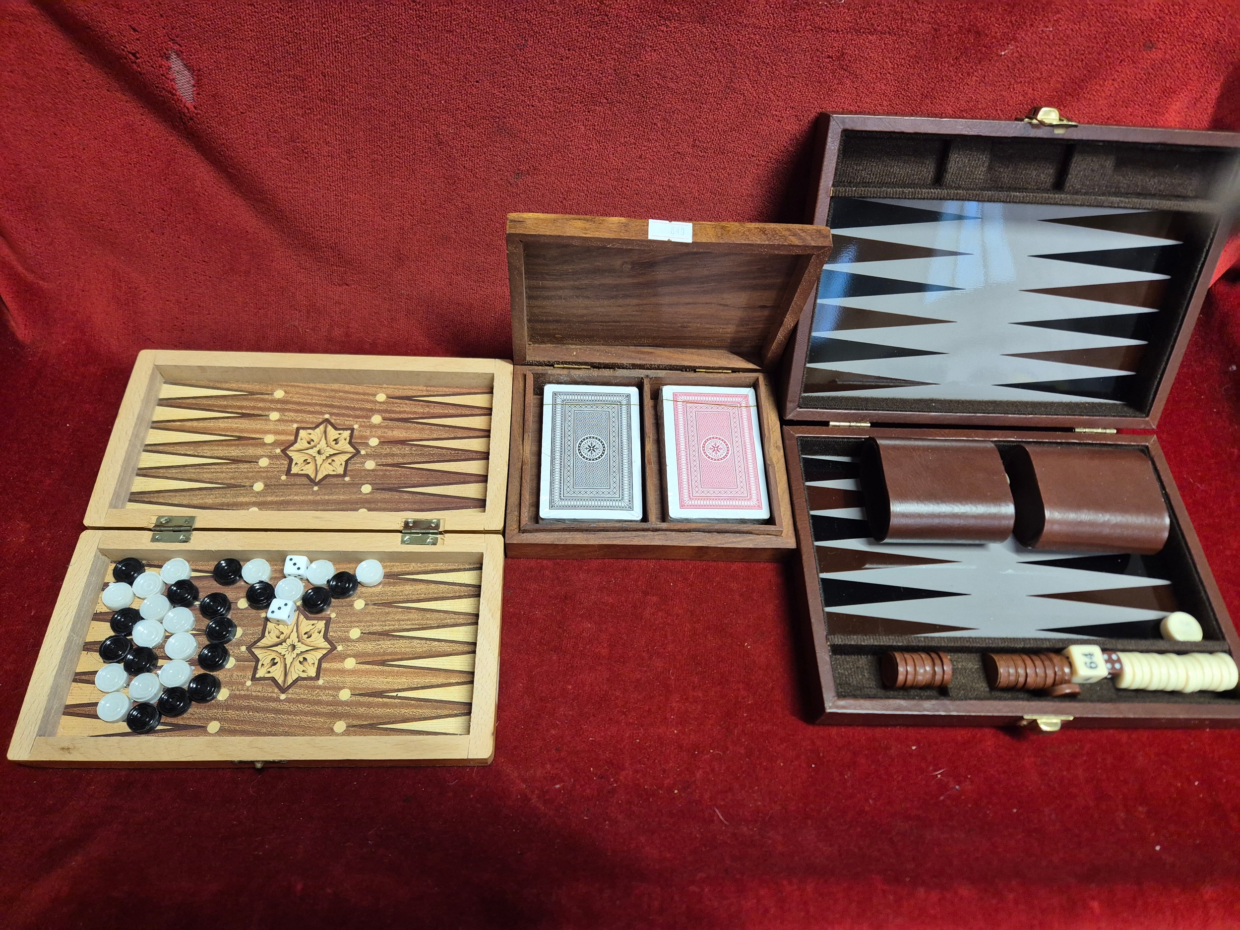 3 decorative gaming boxes, 2 in wood with contents of playing cards and Backgammon pieces